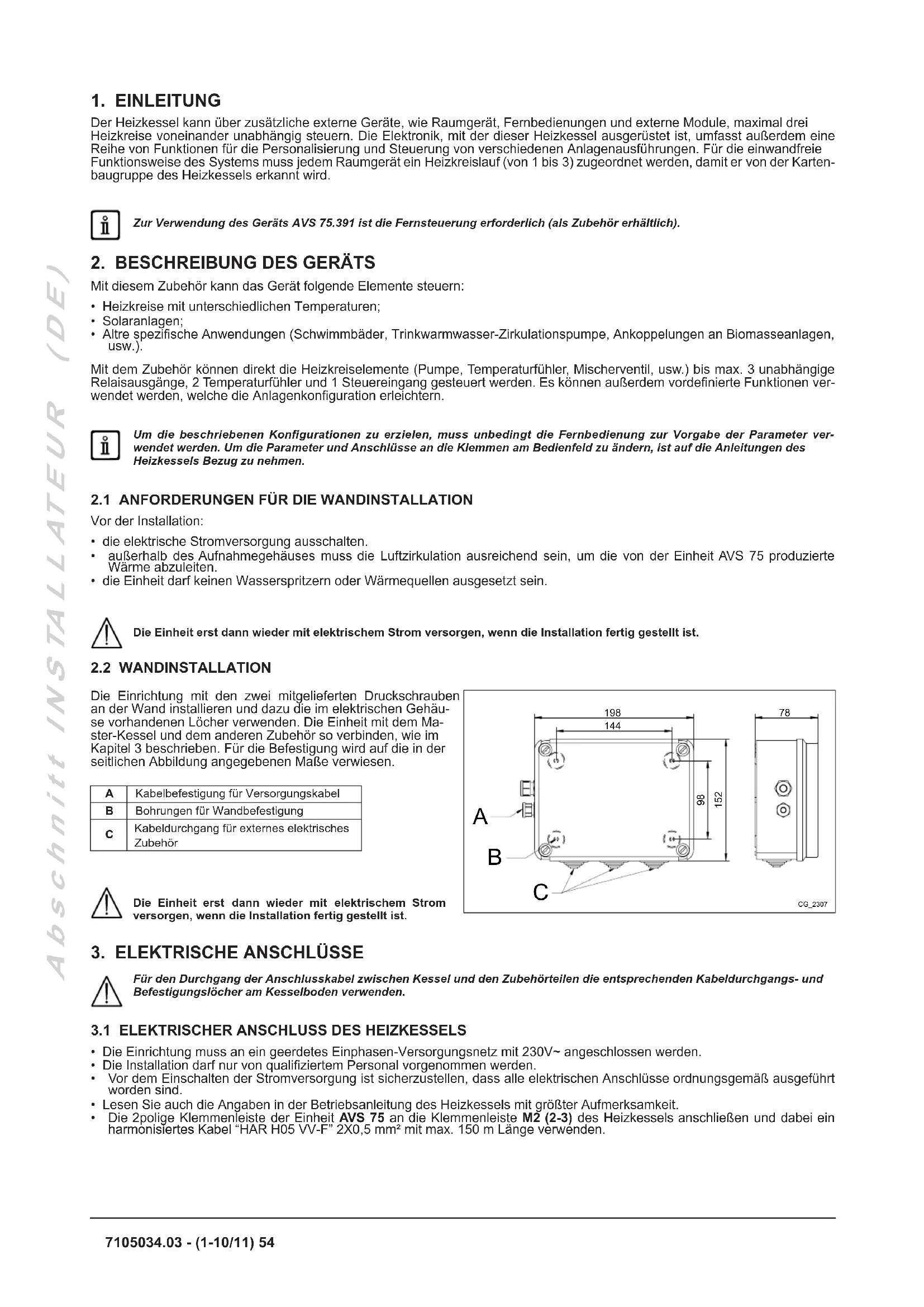 Die Einrichtung mit den zwei mitgelieferten Druckschrauben an der Wand installieren und dazu die im elektrischen Gehäu- se vorhandenen Löcher verwenden. Die Einheit mit dem Ma- ster-Kessel und dem anderen Zubehör so verbinden, wie im Kapitel 3 beschrieben. Für die Befestigung wird auf die in der seitlichen Abbildung angegebenen Maße verwiesen. A Kabelbefestigung für VersorgungskabelB Bohrungen für Wandbefestigung Kabeldurchgang für externes elektrisches ZubehörDie Einheit erst dann wieder mit elektrischem Strom versorgen, wenn die Installation fertig gestellt ist.