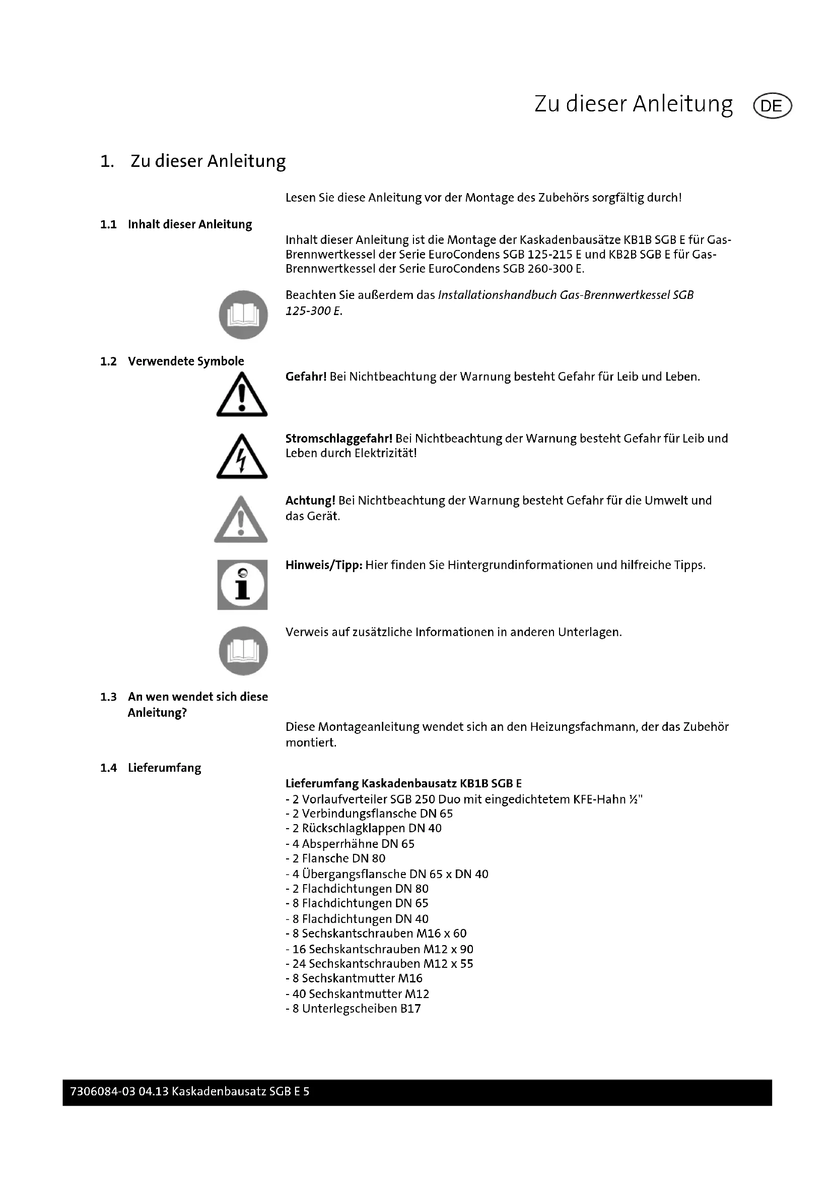 Lieferumfang Kaskadenbausatz KB1B SGB E - 2 Vorlaufverteiler SGB 250 Duo mit eingedichtetem KFE-Hahn ½" - 2 Verbindungsflansche DN 65 - 2 Rückschlagklappen DN 40 - 4 Absperrhähne DN 65 - 2 Flansche DN 80 - 4 Übergangsflansche DN 65 x DN 40 - 2 Flachdichtungen DN 80 - 8 Flachdichtungen DN 65 - 8 Flachdichtungen DN 40 - 8 Sechskantschrauben M16 x 60 - 16 Sechskantschrauben M12 x 90 - 24 Sechskantschrauben M12 x 55 - 8 Sechskantmutter M16 - 40 Sechskantmutter M12 - 8 Unterlegscheiben B17 Zu dieser Anleitung 7306084-03 04.13 Kaskadenbausatz SGB E 5 DE- 80 Unterlegscheiben B13 - 4 Gummidichtungen - Montageanleitung Lieferumfang Kaskadenbausatz KB2B SGB E - 2 Vorlaufverteiler SGB 600 Duo mit eingedichtetem KFE-Hahn ½" - 2 Verbindungsflansche DN 65 - 2 Rückschlagklappen DN 50 - 4 Absperrhähne DN 65 - 2 Flansche DN 100 - 2 Flachdichtungen DN 100 - 6 Flachdichtungen DN 65 - 4 Flachdichtungen DN 50 - 8 Sechskantschrauben M16 x 60 - 8 Sechskantschrauben M12 x 100 - 40 Sechskantschrauben M12 x 60 - 8 Sechskantmuttern M16 - 48 Sechskantmuttern M12 - 16 Unterlegscheiben B17 - 96 Unterlegscheiben B13 - 4 Gummidichtungen - Montageanleitung Zu dieser Anleitung 6 Kaskadenbausatz SGB E 7306084-03 04.13 DE2. Sicherheit Gefahr! Beachten Sie unbedingt die folgenden Sicherheitshinweise! Sie gefährden sonst sich selbst und andere.