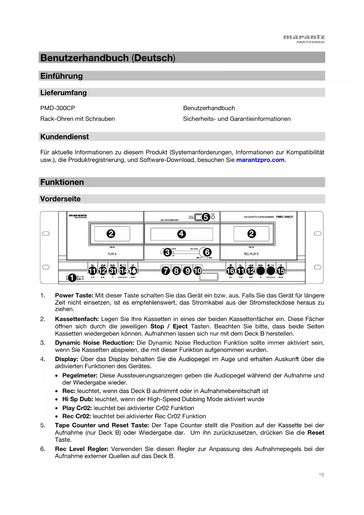 Benutzerhandbuch (Deutsch) Einführung Lieferumfang PMD-300CP Rack-Ohren mit Schrauben Benutzerhandbuch Sicherheits- und Garantieinformationen Kundendienst Für aktuelle Informationen zu diesem Produkt (Systemanforderungen, Informationen zur Kompatibilität usw.), die Produktregistrierung, und Software-Download, besuchen Sie marantzpro.com.
