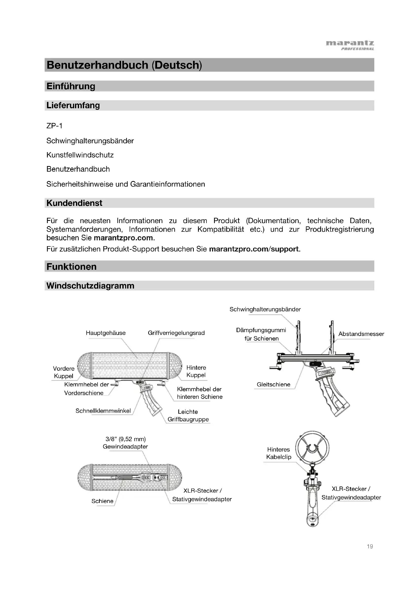 Benutzerhandbuch (Deutsch) Einführung Lieferumfang ZP-1 Schwinghalterungsbänder Kunstfellwindschutz Benutzerhandbuch Sicherheitshinweise und Garantieinformationen Kundendienst Für die neuesten Informationen zu diesem Produkt (Dokumentation, technische Daten, Systemanforderungen, Informationen zur Kompatibilität etc.) und zur Produktregistrierung besuchen Sie marantzpro.com. Für zusätzlichen Produkt-Support besuchen Sie marantzpro.com/support. Funktionen Windschutzdiagramm