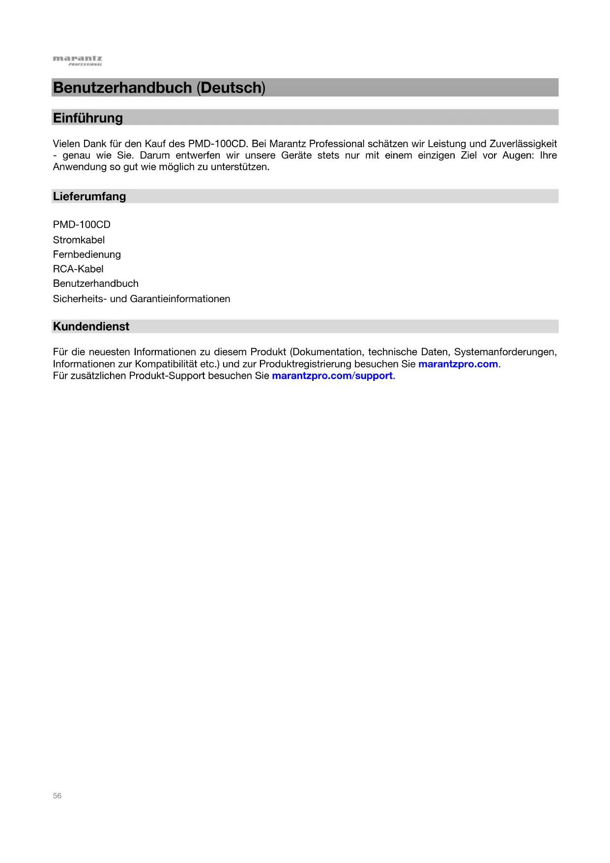 Benutzerhandbuch (Deutsch) Einführung Vielen Dank für den Kauf des PMD-100CD. Bei Marantz Professional schätzen wir Leistung und Zuverlässigkeit - genau wie Sie. Darum entwerfen wir unsere Geräte stets nur mit einem einzigen Ziel vor Augen: Ihre Anwendung so gut wie möglich zu unterstützen. Lieferumfang PMD-100CD Stromkabel Fernbedienung RCA-Kabel Benutzerhandbuch Sicherheits- und Garantieinformationen Kundendienst Für die neuesten Informationen zu diesem Produkt (Dokumentation, technische Daten, Systemanforderungen, Informationen zur Kompatibilität etc.) und zur Produktregistrierung besuchen Sie marantzpro.com. Für zusätzlichen Produkt-Support besuchen Sie marantzpro.com/support.57