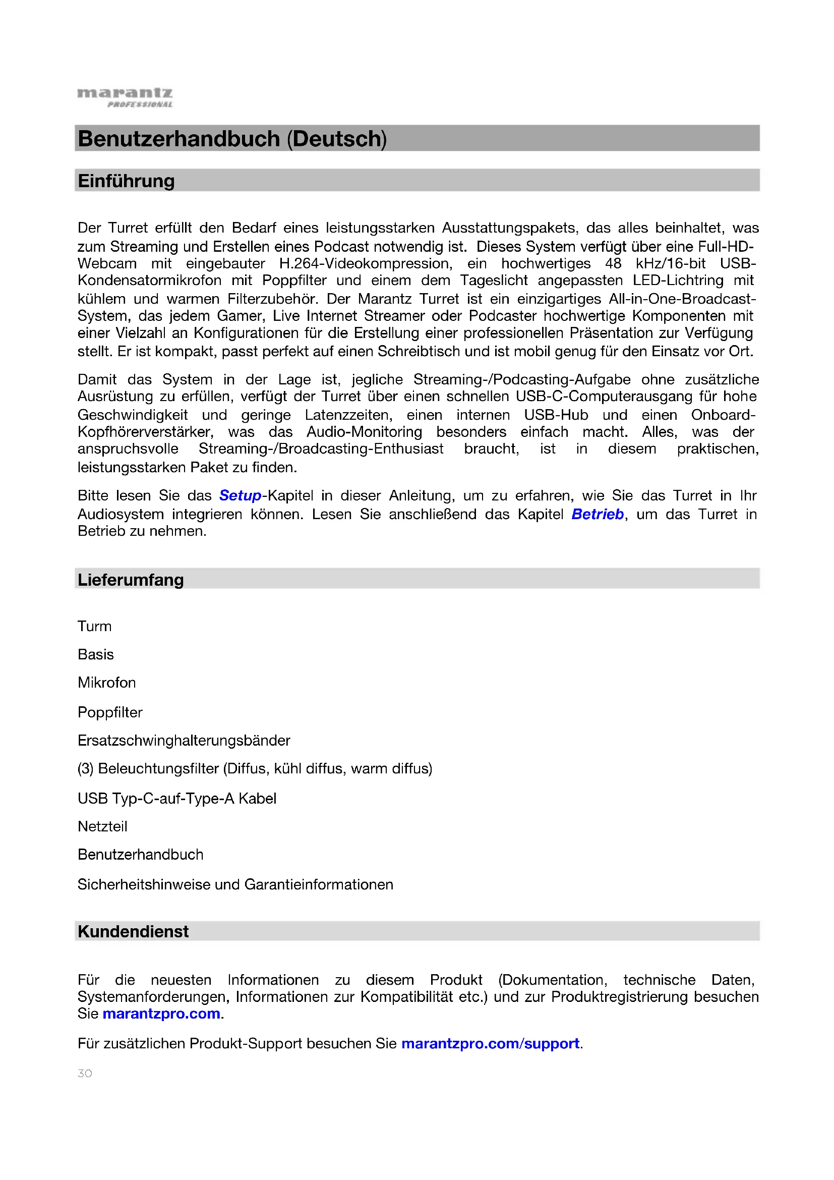 Benutzerhandbuch (Deutsch) Einführung Der Turret erfüllt den Bedarf eines leistungsstarken Ausstattungspakets, das alles beinhaltet, was zum Streaming und Erstellen eines Podcast notwendig ist. Dieses System verfügt über eine Full-HD- Webcam mit eingebauter H.264-Videokompression, ein hochwertiges 48 kHz/16-bit USB- Kondensatormikrofon mit Poppfilter und einem dem Tageslicht angepassten LED-Lichtring mit kühlem und warmen Filterzubehör. Der Marantz Turret ist ein einzigartiges All-in-One-Broadcast- System, das jedem Gamer, Live Internet Streamer oder Podcaster hochwertige Komponenten mit einer Vielzahl an Konfigurationen für die Erstellung einer professionellen Präsentation zur Verfügung stellt. Er ist kompakt, passt perfekt auf einen Schreibtisch und ist mobil genug für den Einsatz vor Ort. Damit das System in der Lage ist, jegliche Streaming-/Podcasting-Aufgabe ohne zusätzliche Ausrüstung zu erfüllen, verfügt der Turret über einen schnellen USB-C-Computerausgang für hohe Geschwindigkeit und geringe Latenzzeiten, einen internen USB-Hub und einen Onboard- Kopfhörerverstärker, was das Audio-Monitoring besonders einfach macht. Alles, was der anspruchsvolle Streaming-/Broadcasting-Enthusiast braucht, ist in diesem praktischen, leistungsstarken Paket zu finden. Bitte lesen Sie das Setup-Kapitel in dieser Anleitung, um zu erfahren, wie Sie das Turret in Ihr Audiosystem integrieren können. Lesen Sie anschließend das Kapitel Betrieb, um das Turret in Betrieb zu nehmen. Lieferumfang Turm Basis Mikrofon Poppfilter Ersatzschwinghalterungsbänder (3) Beleuchtungsfilter (Diffus, kühl diffus, warm diffus) USB Typ-C-auf-Type-A Kabel Netzteil Benutzerhandbuch Sicherheitshinweise und Garantieinformationen Kundendienst Für die neuesten Informationen zu diesem Produkt (Dokumentation, technische Daten, Systemanforderungen, Informationen zur Kompatibilität etc.) und zur Produktregistrierung besuchen Sie marantzpro.com. Für zusätzlichen Produkt-Support besuchen Sie marantzpro.com/support.31