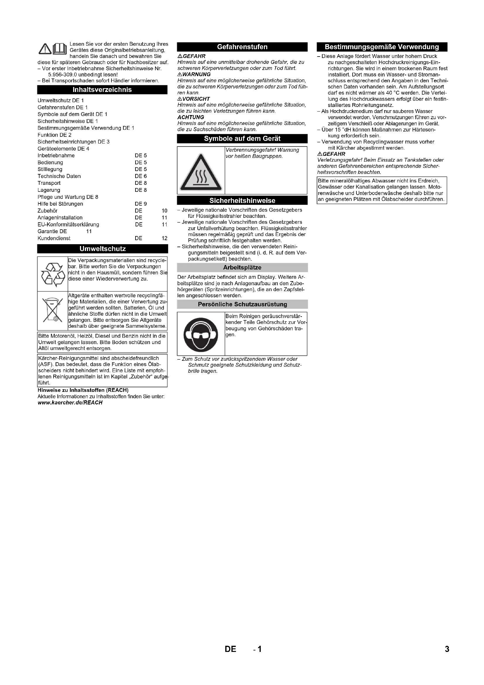 59628660 12/21 Deutsch 3 English 15 Français 27 Italiano 39 Nederlands 51 Español 63 Português 75 Dansk 87 Norsk 99 Svenska 111 Suomi 123 Ελληνικά 135 Türkçe 147 Русский 159 Magyar 171 Čeština 183 Slovenščina 195 Polski 207 Româneşte 219 Slovenčina 231 Hrvatski 243 Srpski 255 Български 267 Eesti 279 Latviešu 291 Lietuviškai 303 Українська 3152- 1 Lesen Sie vor der ersten Benutzung Ihres Gerätes diese Originalbetriebsanleitung, handeln Sie danach und bewahren Sie diese für späteren Gebrauch oder für Nachbesitzer auf. – Vor erster Inbetriebnahme Sicherheitshinweise Nr. 5.956-309.0 unbedingt lesen! – Bei Transportschaden sofort Händler informieren. Hinweise zu Inhaltsstoffen (REACH) Aktuelle Informationen zu Inhaltsstoffen finden Sie unter: www.kaercher.de/REACH GEFAHR Hinweis auf eine unmittelbar drohende Gefahr, die zu schweren Körperverletzungen oder zum Tod führt. 몇 WARNUNG Hinweis auf eine möglicherweise gefährliche Situation, die zu schweren Körperverletzungen oder zum Tod füh- ren kann. 몇 VORSICHT Hinweis auf eine möglicherweise gefährliche Situation, die zu leichten Verletzungen führen kann. ACHTUNG Hinweis auf eine möglicherweise gefährliche Situation, die zu Sachschäden führen kann. – Jeweilige nationale Vorschriften des Gesetzgebers für Flüssigkeitsstrahler beachten. – Jeweilige nationale Vorschriften des Gesetzgebers zur Unfallverhütung beachten. Flüssigkeitsstrahler müssen regelmäßig geprüft und das Ergebnis der Prüfung schriftlich festgehalten werden. – Sicherheitshinweise, die den verwendeten Reini- gungsmitteln beigestellt sind (i. d. R. auf dem Ver- packungsetikett) beachten. Der Arbeitsplatz befindet sich am Display. Weitere Ar- beitsplätze sind je nach Anlagenaufbau an den Zube- hörgeräten (Spritzeinrichtungen), die an den Zapfstel- len angeschlossen werden. – Zum Schutz vor zurückspritzendem Wasser oder Schmutz geeignete Schutzkleidung und Schutz- brille tragen. – Diese Anlage fördert Wasser unter hohem Druck zu nachgeschalteten Hochdruckreinigungs-Ein- richtungen. Sie wird in einem trockenen Raum fest installiert. Dort muss ein Wasser- und Stroman- schluss entsprechend den Angaben in den Techni- schen Daten vorhanden sein. Am Aufstellungsort darf es nicht wärmer als 40 °C werden. Die Vertei- lung des Hochdruckwassers erfolgt über ein festin- stalliertes Rohrleitungsnetz. – Als Hochdruckmedium darf nur sauberes Wasser verwendet werden. Verschmutzungen führen zu vor- zeitigem Verschleiß oder Ablagerungen im Gerät. – Über 15 °dH können Maßnahmen zur Härtesen- kung erforderlich sein. – Verwendung von Recyclingwasser muss vorher mit Kärcher abgestimmt werden. GEFAHR Verletzungsgefahr! Beim Einsatz an Tankstellen oder anderen Gefahrenbereichen entsprechende Sicher- heitsvorschriften beachten. Inhaltsverzeichnis Umweltschutz DE 1 Gefahrenstufen DE 1 Symbole auf dem Gerät DE 1 Sicherheitshinweise DE 1 Bestimmungsgemäße Verwendung DE 1 Funktion DE 2 Sicherheitseinrichtungen DE 3 Geräteelemente DE 4 Inbetriebnahme DE 5 Bedienung DE 5 Stilllegung DE 5 Technische Daten DE 6 Transport DE 8 Lagerung DE 8 Pflege und Wartung DE 8 Hilfe bei Störungen DE 9 Zubehör DE 10 Anlageninstallation DE 11 EU-Konformitätserklärung DE 11 Garantie DE 11 Kundendienst DE 12 Umweltschutz Die Verpackungsmaterialien sind recycle- bar. Bitte werfen Sie die Verpackungen nicht in den Hausmüll, sondern führen Sie diese einer Wiederverwertung zu. Altgeräte enthalten wertvolle recyclingfä- hige Materialien, die einer Verwertung zu- geführt werden sollten. Batterien, Öl und ähnliche Stoffe dürfen nicht in die Umwelt gelangen. Bitte entsorgen Sie Altgeräte deshalb über geeignete Sammelsysteme. Bitte Motorenöl, Heizöl, Diesel und Benzin nicht in die Umwelt gelangen lassen. Bitte Boden schützen und Altöl umweltgerecht entsorgen. Kärcher-Reinigungsmittel sind abscheidefreundlich (ASF). Das bedeutet, dass die Funktion eines Ölab- scheiders nicht behindert wird. Eine Liste mit empfoh- lenen Reinigungsmitteln ist im Kapitel „Zubehör“ aufge- führt. Gefahrenstufen Symbole auf dem Gerät Verbrennungsgefahr! Warnung vor heißen Baugruppen. Sicherheitshinweise Arbeitsplätze Persönliche Schutzausrüstung Beim Reinigen geräuschverstär- kender Teile Gehörschutz zur Vor- beugung von Gehörschäden tra- gen. Bestimmungsgemäße Verwendung Bitte mineralölhaltiges Abwasser nicht ins Erdreich, Gewässer oder Kanalisation gelangen lassen. Moto- renwäsche und Unterbodenwäsche deshalb bitte nur an geeigneten Plätzen mit Ölabscheider durchführen. 3DE- 2 1 Schmutzfänger (bauseits) 2 Temperaturfühler 3 Wassermangelsicherung 4 Schwimmerbehälter 5 Vordruckpumpe (Option) 6 Kurbelwellenpumpe 7 Sicherheitsventil 8 Elektromotor 9 Rückschlagventil 10 Hochdruckschlauch 11 Drucksensor für Hochdruck 12 Überströmventil 13 Strömungsschalter 14 Schwimmerventil 15 Absperrventil (bauseits) 16 Absperrventil (bauseits) A Rohrleitung/Hochdruckausgang B Wasserzulauf C Überlauf Funktion Fließschema 4 DE- 3 Das Wasser wird vom Schwimmerbehälter zur Saug- seite der Pumpe geführt. Der Wasserstand im Schwim- merbehälter wird durch das Schwimmerventil konstant gehalten. Bei Versagen des Schwimmerventils fließt das Wasser durch den Überlauf ab. Bei gestörter Was- serversorgung gibt die Wassermangelsicherung eine Fehlermeldung an die Steuerung. Der Elektromotor treibt die Kurbelwellenpumpe an. Die Pumpe fördert das Wasser unter Hochdruck zur Druck- seite. Das Hochdruckwasser gelangt durch das Überström- ventil und den Drucksensor zum Hochdruckausgang. Anschließend folgt das Hochdrucknetz des Betreibers. Nicht entnommenes Wasser wird vom Überströmventil zum Schwimmerbehälter zurückgeleitet. Sind alle Ver- braucher abgestellt, dann schaltet das Überströmventil komplett auf Rückfluss zum Schwimmerbehälter um. Übersteigt der Druck am Ausgang trotz Überströmventil den maximalen Betrie