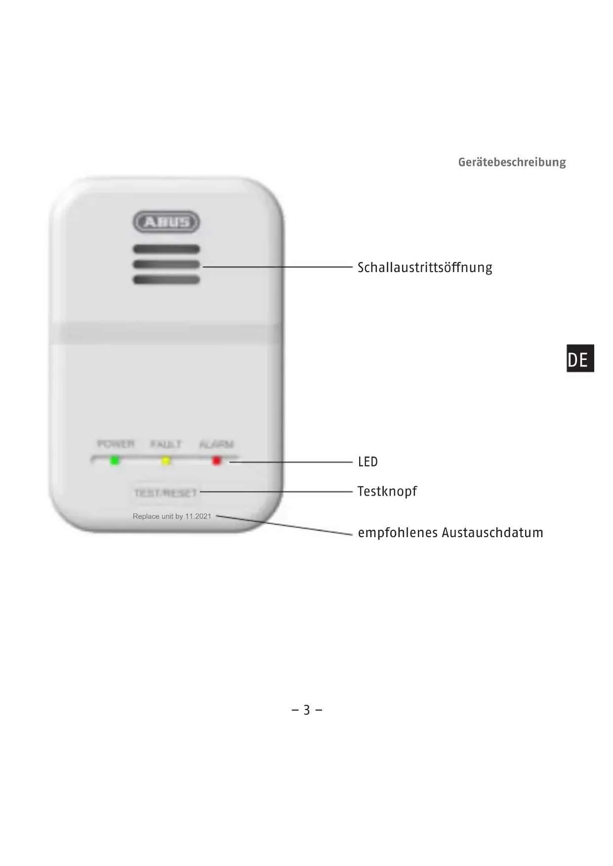 - SolltenSieandemProdukteinenMangelfeststellen,derbeimVerkaufbereits vorhanden war, wenden Sie sich innerhalb der ersten zwei Jahre bitte direkt an Ihren Verkäufer. Konformitätserklärung HiermiterklärtABUSAugustBremickerSöhneKG,AltenhoferWeg25,58300Wetter, dasssichdasGerätGWM100MEinÜbereinstimmungmitdengrundlegendenAnfor- derungen und den übrigen einschlägigen Bestimmungen der Richtlinie 2004/108/EG befindet. Für weitere Informationen zur CE Erklärung oder zur Einsicht der CE Erklä- rung, wenden Sie sich bitte an ABUS August Bremicker Söhne KG, Kundenservice- center,AltenhoferWeg25,58300Wetter. Hinweis auf die Elektro- und Elektronik Altgeräte EG-Richtlinie Im Interesse des Umweltschutzes darf das Gerät am Ende seiner Lebensdauer nicht mit dem Hausmüll entfernt werden. Die Entsorgung kann über entsprechende SammelstelleninIhremLanderfolgen.BefolgenSiedieörtlichenVorschrienbei der Entsorgung der Materialien. EntsorgenSiedasGerätgemäßderElektro-undElektronikAltgeräte EGRichtlinie2002/96/EC–WEEE(WasteElectricalandElectronic Equipment).BeiRückfragenwendenSiesichandiefürdieEntsor- gung zuständige kommunale Behörde. Rücknahmestellen für Ihre Altgeräte erhalten Sie z. B. bei der örtlichen Gemeinde- bzw. Stadt- verwaltung, den örtlichen Müllentsorgungsunternehmen oder bei Ihrem Händler. Konformität, Entsorgung Technische Änderungen vorbehalten. FürIrrtümerundDruckfehlerkeineHaung. V1 | D18 ©ABUS|D58292Wetter(Germany) www.abus.com – 13 – DE– 14 – Device description Sound outlet LED Test / Reset button Replace unit by 11.2021 Recommended replacement date– 15 – Specifications Themanufacturerreservestherighttomaketechnicalmodicationsatanytime. Scope of delivery