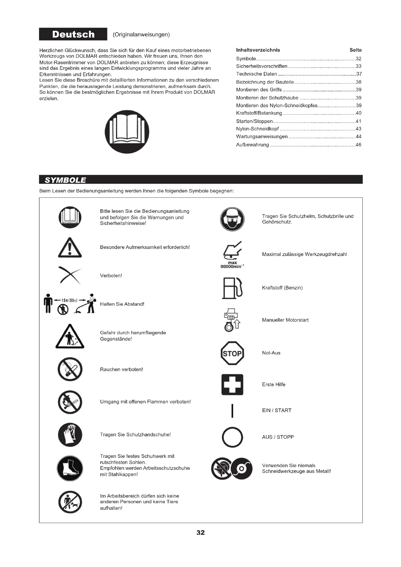 Herzlichen Glückwunsch, dass Sie sich für den Kauf eines motorbetriebenen Werkzeugs von DOLMAR entschieden haben. Wir freuen uns, Ihnen den Motor-Rasentrimmer von DOLMAR anbieten zu können; diese Erzeugnisse sind das Ergebnis eines langen Entwicklungssprogramms und vieler Jahre an Erkenntnissen und Erfahrungen. Lesen Sie diese Broschüre mit detailierten Informationen zu den verschiedenen Punkten, die die Herausragende Leistung demonstrierten, aufmerksam durch. So konnen Sie die bestmöglichen Ergebnisse mit ihrem Produkt von DOLMAR erzielen.