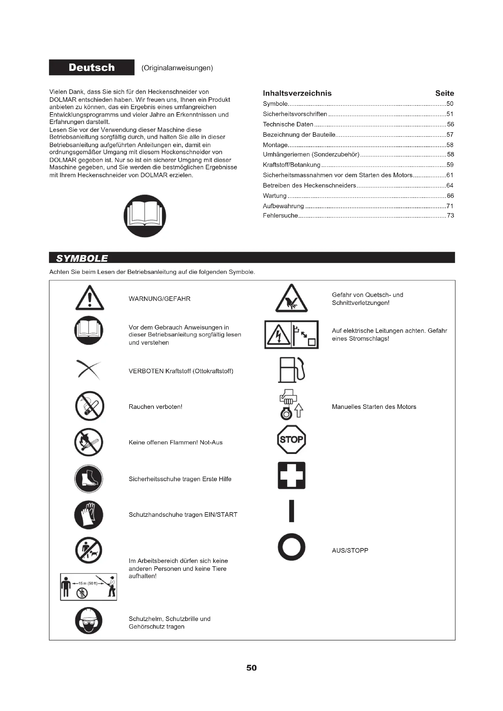 - Vielen Dank, dass Sie sich für den Heckenschneider von DOLMAR entschieden haben. Wir freuen uns, Ihnen ein Produkt anbieten zu können, das ein Ergebnis eines umfangreichen Entwicklungsprogramms und vieler Jahre an Erkenntnissen und Erfahrungen darstellt. Lesen Sie vor der Verwendung dieser Maschine diese Betriebsanleitung sorgfältig durch, und halten Sie alle in dieser Betriebsanleitung aufgeführten Anleitungen ein, damit ein ordnungsgemäßer Umgang mit diesem Heckenschneider von DOLMAR gegeben ist. Nur so ist ein sicherer Umgang mit dieser Maschine gegeben, und Sie werden die bestmöglichen Ergebnisse mit Ihrem Heckenschneider von DOLMAR erzielen. Deutsch (Originalanweisungen) Inhaltsverzeichnis Seite Symbole p. 50