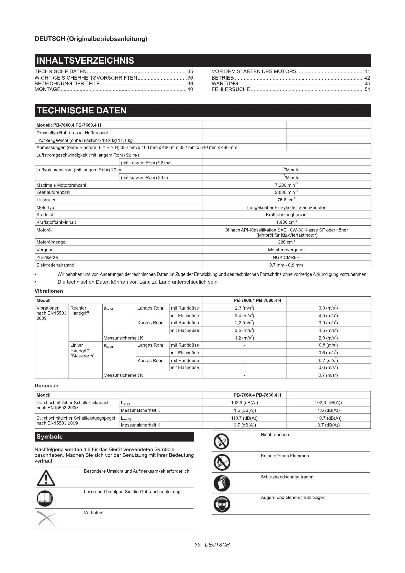 - Die technischen Daten können von Land zu Land unterschiedlich sein. Vibrationen Modell PB-7660.4 PB-7660.4 H Vibrationen nach EN15503