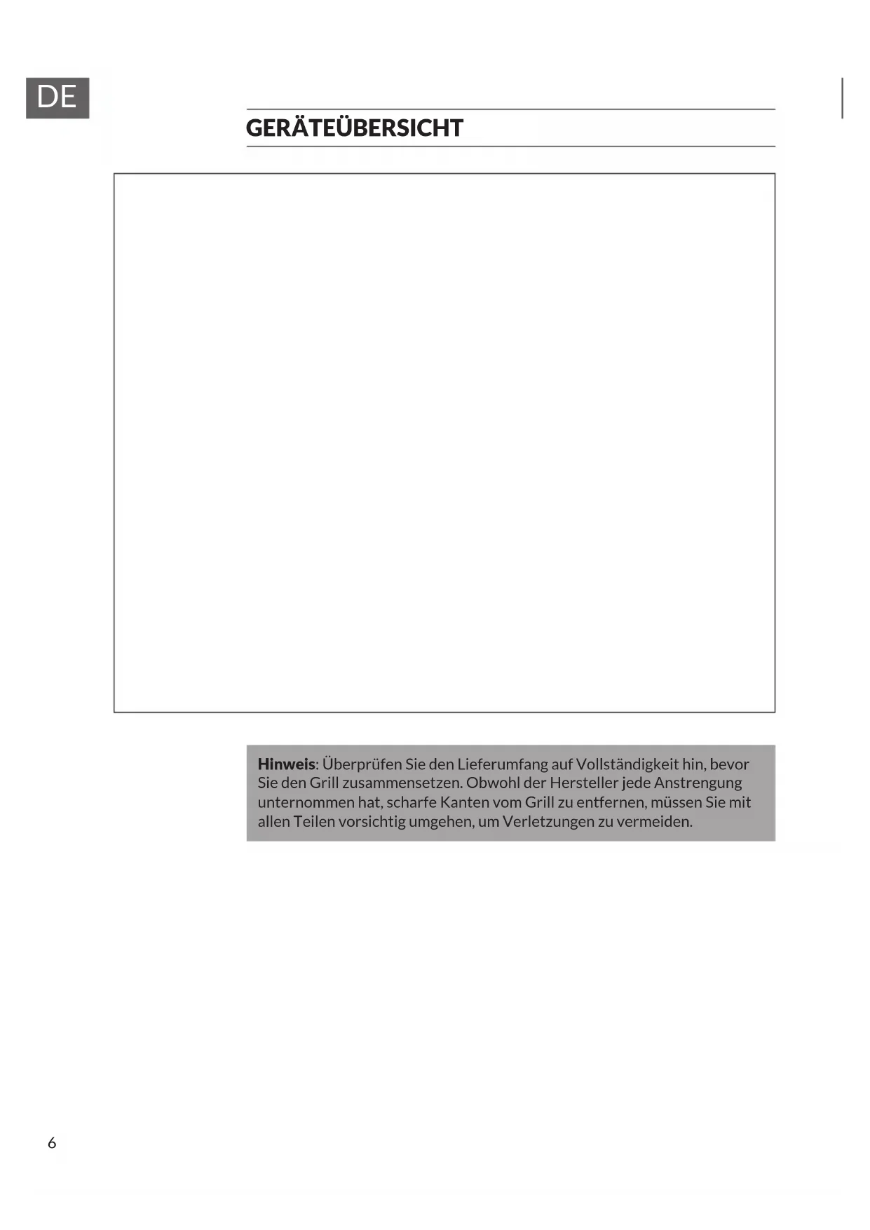 Hinweis: Überprüfen Sie den Lieferumfang auf Vollständigkeit hin, bevor Sie den Grill zusammensetzen. Obwohl der Hersteller jede Anstrengung unternommen hat, scharfe Kanten vom Grill zu entfernen, müssen Sie mit allen Teilen vorsichtig umgehen, um Verletzungen zu vermeiden.7