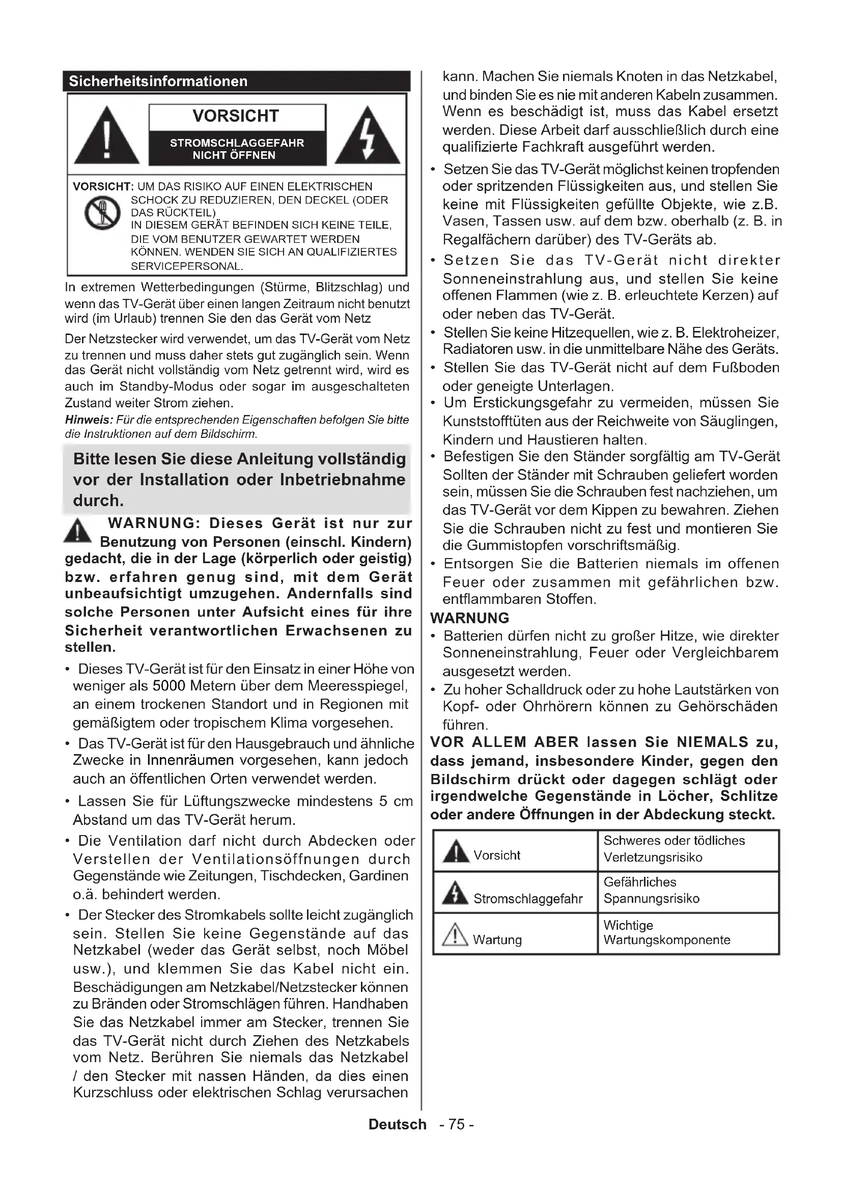 KÖNNEN. WENDEN SIE SICH AN QUALIFIZIERTES SERVICEPERSONAL. Hinweis: Für die entsprechenden Eigenschaften befolgen Sie bitte die Instruktionen auf dem Bildschirm. In extremen Wetterbedingungen (Stürme, Blitzschlag) und wenn das TV-Gerät über einen langen Zeitraum nicht benutzt wird (im Urlaub) trennen Sie den das Gerät vom Netz Der Netzstecker wird verwendet, um das TV-Gerät vom Netz zu trennen und muss daher stets gut zugänglich sein. Wenn das Gerät nicht vollständig vom Netz getrennt wird, wird es auch im Standby-Modus oder sogar im ausgeschalteten Zustand weiter Strom ziehen. Bitte lesen Sie diese Anleitung vollständig vor der Installation oder Inbetriebnahme durch. WARNUNG: Dieses Gerät ist nur zur Benutzung von Personen (einschl. Kindern) gedacht, die in der Lage (körperlich oder geistig) bzw. erfahren genug sind, mit dem Gerät unbeaufsichtigt umzugehen. Andernfalls sind solche Personen unter Aufsicht eines für ihre Sicherheit verantwortlichen Erwachsenen zu stellen.