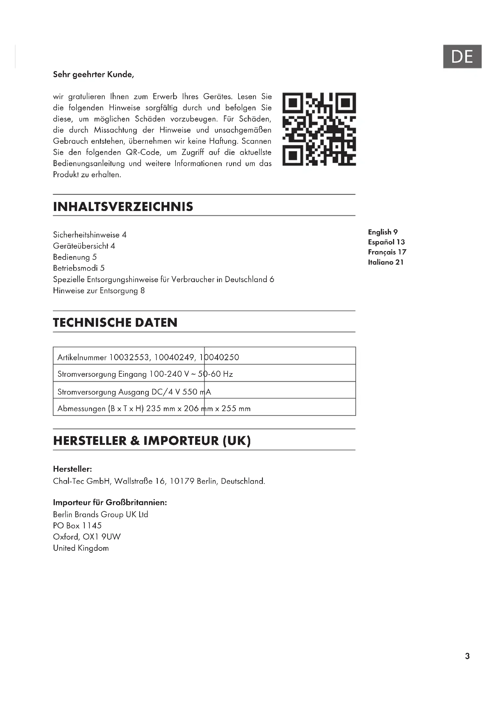 Sehr geehrter Kunde, wir gratulieren Ihnen zum Erwerb Ihres Gerätes. Lesen Sie die folgenden Hinweise sorgfältig durch und befolgen Sie diese, um möglichen Schäden vorzubeugen. Für Schäden, die durch Missachtung der Hinweise und unsachgemäßen Gebrauch entstehen, übernehmen wir keine Haftung. Scannen Sie den folgenden QR-Code, um Zugriff auf die aktuellste Bedienungsanleitung und weitere Informationen rund um das Produkt zu erhalten. INHALTSVERZEICHNIS Sicherheitshinweise4 Geräteübersicht4 Bedienung5 Betriebsmodi5 Spezielle Entsorgungshinweise für Verbraucher in Deutschland6 Hinweise zur Entsorgung8 TECHNISCHE DATEN Artikelnummer 10032553, 10040249, 10040250 Stromversorgung Eingang 100-240 V ~ 50-60 Hz Stromversorgung Ausgang DC/4 V 550 mA Abmessungen (B x T x H) 235 mm x 206 mm x 255 mm HERSTELLER & IMPORTEUR (UK) Hersteller: Chal-Tec GmbH, Wallstraße 16, 10179 Berlin, Deutschland. Importeur für Großbritannien: Berlin Brands Group UK Ltd PO Box 1145 Oxford, OX1 9UW United Kingdom English 9 Español 13 Français 17 Italiano 214