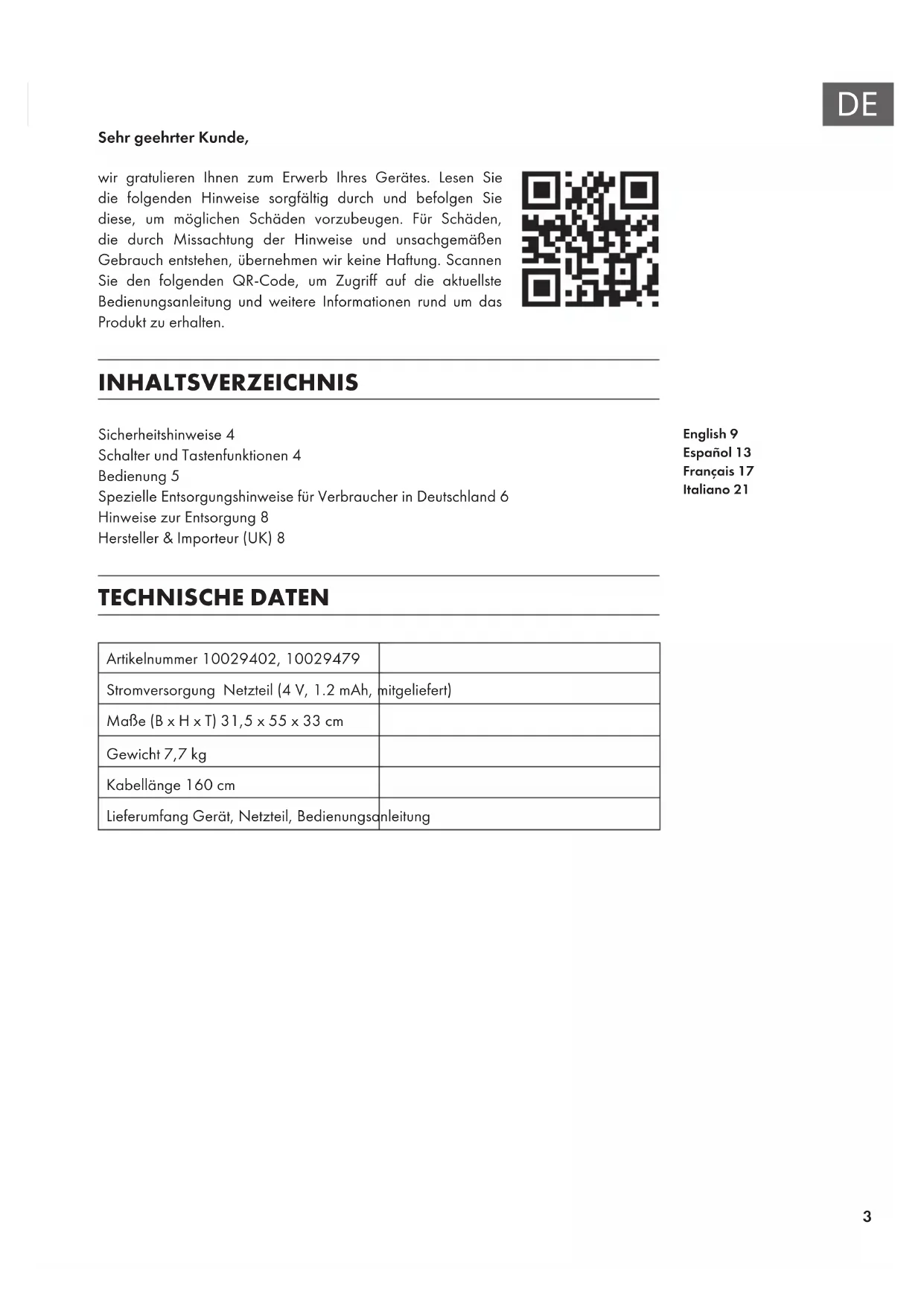 Sehr geehrter Kunde, wir gratulieren Ihnen zum Erwerb Ihres Gerätes. Lesen Sie die folgenden Hinweise sorgfältig durch und befolgen Sie diese, um möglichen Schäden vorzubeugen. Für Schäden, die durch Missachtung der Hinweise und unsachgemäßen Gebrauch entstehen, übernehmen wir keine Haftung. Scannen Sie den folgenden QR-Code, um Zugriff auf die aktuellste Bedienungsanleitung und weitere Informationen rund um das Produkt zu erhalten. INHALTSVERZEICHNIS Sicherheitshinweise4 Schalter und Tastenfunktionen4 Bedienung5 Spezielle Entsorgungshinweise für Verbraucher in Deutschland6 Hinweise zur Entsorgung8 Hersteller & Importeur (UK)8 TECHNISCHE DATEN Artikelnummer 10029402, 10029479 Stromversorgung Netzteil (4 V, 1.2 mAh, mitgeliefert) Maße (B x H x T) 31,5 x 55 x 33 cm Gewicht 7,7 kg Kabellänge 160 cm Lieferumfang Gerät, Netzteil, Bedienungsanleitung English 9 Español 13 Français 17 Italiano 214