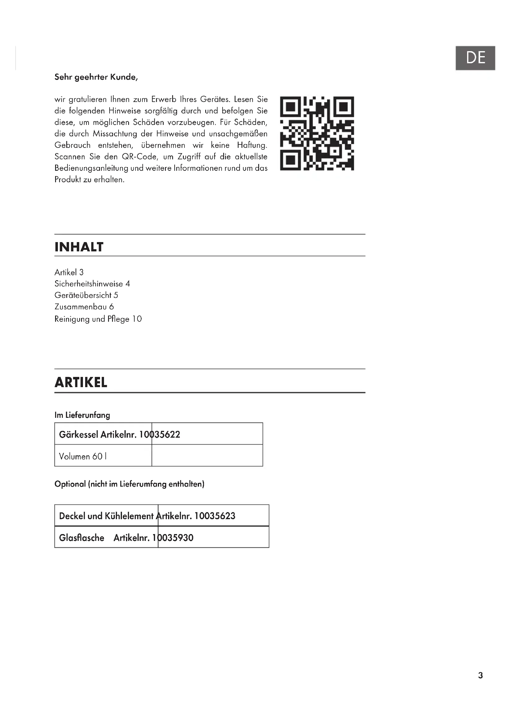 Artikel 3 Sicherheitshinweise 4 Geräteübersicht 5 Zusammenbau 6 Reinigung und Pege 10 Sehr geehrter Kunde, wir gratulieren Ihnen zum Erwerb Ihres Gerätes. Lesen Sie die folgenden Hinweise sorgfältig durch und befolgen Sie diese, um möglichen Schäden vorzubeugen. Für Schäden, die durch Missachtung der Hinweise und unsachgemäßen Gebrauch entstehen, übernehmen wir keine Haftung. Scannen Sie den QR-Code, um Zugriff auf die aktuellste Bedienungsanleitung und weitere Informationen rund um das Produkt zu erhalten. INHALT ARTIKEL Im Lieferunfang Gärkessel Artikelnr. 10035622 Volumen 60 l Optional (nicht im Lieferumfang enthalten) Deckel und Kühlelement Artikelnr. 10035623 Glasasche Artikelnr. 100359304