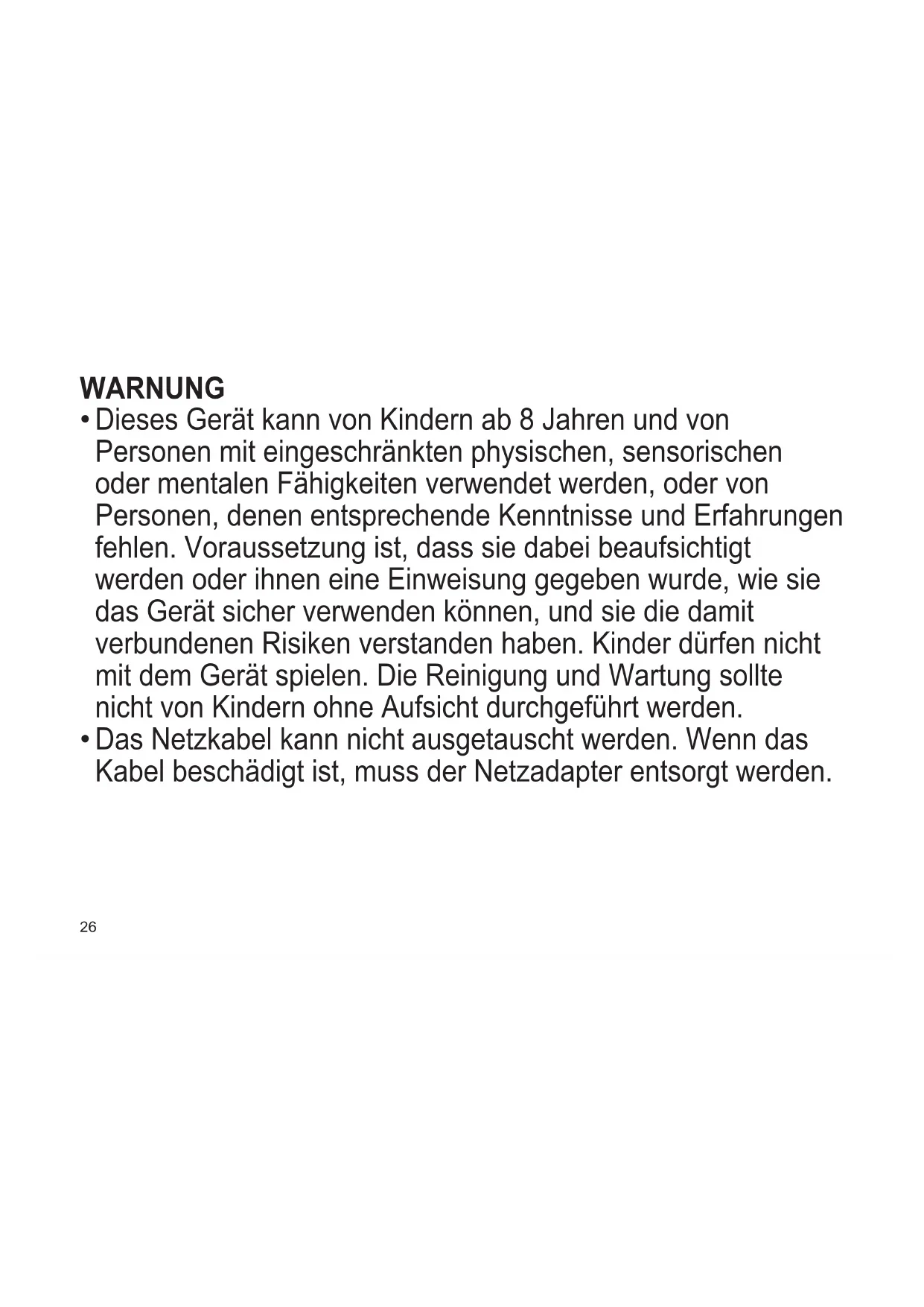 Dieses Gerät kann von Kindern ab 8 Jahren und von Personen mit eingeschränkten physischen, sensorischen oder mentalen Fähigkeiten verwendet werden, oder von Personen, denen entsprechende Kenntnisse und Erfahrungen fehlen. Voraussetzung ist, dass sie dabei beaufsichtigt werden oder ihnen eine Einweisung gegeben wurde, wie sie das Gerät sicher verwenden können, und sie die damit verbundenen Risiken verstanden haben. Kinder dürfen nicht mit dem Gerät spielen. Die Reinigung und Wartung sollte nicht von Kindern ohne Aufsicht durchgeführt werden.