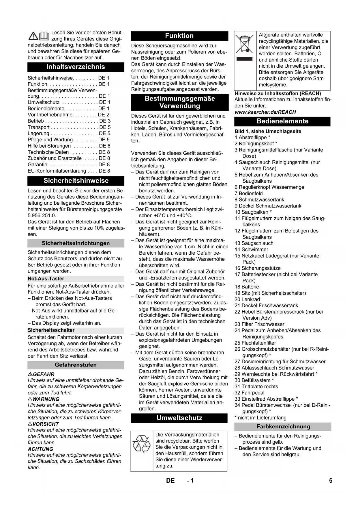 Lesen Sie vor der ersten Benut- zung Ihres Gerätes diese Origi- nalbetriebsanleitung, handeln Sie danach und bewahren Sie diese für späteren Ge- brauch oder für Nachbesitzer auf. Lesen und beachten Sie vor der ersten Be- nutzung des Gerätes diese Bedienungsan- leitung und beiliegende Broschüre Sicher- heitshinweise für Bürstenreinigungsgeräte 5.956-251.0. Das Gerät ist für den Betrieb auf Flächen mit einer Steigung von bis zu 10% zugelas- sen. Sicherheitseinrichtungen dienen dem Schutz des Benutzers und dürfen nicht au- ßer Betrieb gesetzt oder in ihrer Funktion umgangen werden. Für eine sofortige Außerbetriebnahme aller Funktionen: Not-Aus-Taster drücken. – Beim Drücken des Not-Aus-Tasters bremst das Gerät hart. – Not-Aus wirkt unmittelbar auf alle Ge- rätefunktionen. – Das Display zeigt weiterhin an. Schaltet den Fahrmotor nach einer kurzen Verzögerung ab, wenn der Betreiber wäh- rend des Arbeitsbetriebes bzw. während der Fahrt den Sitz verlässt. GEFAHR Hinweis auf eine unmittelbar drohende Ge- fahr, die zu schweren Körperverletzungen oder zum Tod führt. 몇 WARNUNG Hinweis auf eine möglicherweise gefährli- che Situation, die zu schweren Körperver- letzungen oder zum Tod führen kann. 몇 VORSICHT Hinweis auf eine möglicherweise gefährli- che Situation, die zu leichten Verletzungen führen kann. ACHTUNG Hinweis auf eine möglicherweise gefährli- che Situation, die zu Sachschäden führen kann. Diese Scheuersaugmaschine wird zur Nassreinigung oder zum Polieren von ebe- nen Böden eingesetzt. Das Gerät kann durch Einstellen der Was- sermenge, des Anpressdrucks der Bürs- ten, der Reinigungsmittelmenge sowie der Fahrgeschwindigkeit leicht an die jeweilige Reinigungsaufgabe angepasst werden. Dieses Gerät ist für den gewerblichen und industriellen Gebrauch geeignet, z.B. in Hotels, Schulen, Krankenhäusern, Fabri- ken, Läden, Büros und Vermietergeschäf- ten. Verwenden Sie dieses Gerät ausschließ- lich gemäß den Angaben in dieser Be- triebsanleitung. – Das Gerät darf nur zum Reinigen von nicht feuchtigkeitsempfindlichen und nicht polierempfindlichen glatten Böden benutzt werden. – Dieses Gerät ist zur Verwendung in In- nenräumen bestimmt. – Der Einsatztemperaturbereich liegt zwi- schen +5°C und +40°C. – Das Gerät ist nicht geeignet zur Reini- gung gefrorener Böden (z. B. in Kühl- häusern). – Das Gerät ist geeignet für eine maxima- le Wasserhöhe von 1 cm. Nicht in einen Bereich fahren, wenn die Gefahr be- steht, dass die maximale Wasserhöhe überschritten wird. – Das Gerät darf nur mit Original-Zubehör und -Ersatzteilen ausgestattet werden. – Das Gerät ist nicht bestimmt für die Rei- nigung öffentlicher Verkehrswege. – Das Gerät darf nicht auf druckempfind- lichen Böden eingesetzt werden. Zuläs- sige Flächenbelastung des Bodens be- rücksichtigen. Die Flächenbelastung durch das Gerät ist in den technischen Daten angegeben. – Das Gerät ist nicht für den Einsatz in explosionsgefährdeten Umgebungen geeignet. – Mit dem Gerät dürfen keine brennbaren Gase, unverdünnte Säuren oder Lö- sungsmittel aufgenommen werden. Dazu zählen Benzin, Farbverdünner oder Heizöl, die durch Verwirbelung mit der Saugluft explosive Gemische bilden können. Ferner Aceton, unverdünnte Säuren und Lösungsmittel, da sie die im Gerät verwendeten Materialien an- greifen. Hinweise zu Inhaltsstoffen (REACH) Aktuelle Informationen zu Inhaltsstoffen fin- den Sie unter: www.kaercher.de/REACH Bild 1, siehe Umschlagseite 1 Abstreiflippe * 2 Reinigungskopf * 3 Reinigungsmittelflasche (nur Variante Dose) 4 Saugschlauch Reinigungsmittel (nur Variante Dose) 5 Hebel zum Anheben/Absenken des Saugbalkens 6 Regulierknopf Wassermenge 7 Bedienfeld 8 Schmutzwassertank 9 Deckel Schmutzwassertank 10 Saugbalken * 11 Flügelmuttern zum Neigen des Saug- balkens 12 Flügelmuttern zum Befestigen des Saugbalkens 13 Saugschlauch 14 Schwimmer 15 Netzkabel Ladegerät (nur Variante Pack) 16 Sicherungsstütze 17 Batteriestecker (nicht bei Variante Pack) 18 Batterie 19 Sitz (mit Sicherheitsschalter) 20 Lenkrad 21 Deckel Frischwassertank 22 Hebel Bürstenanpressdruck (nur bei Version Adv) 23 Filter Frischwasser 24 Pedal zum Anheben/Absenken des Reinigungskopfes 25 Flachfaltenfilter 26 Grobschmutzbehälter (nur bei R-Reini- gungskopf) * 27 Dosiereinrichtung für Schmutzwasser 28 Ablassschlauch Schmutzwasser 29 Warnleuchte bei Rückwärtsfahrt * 30 Befüllsystem * 31 Trittplatte rechts 32 Fahrpedal 33 Einstellrad Abstreiflippe * 34 Pedal Bürstenwechsel (nur bei D-Reini- gungskopf) *