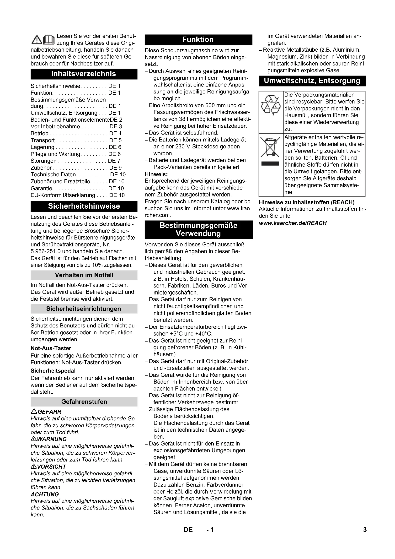 59663620 05/19 Deutsch 3 English 13 Français 22 Italiano 32 Nederlands 42 Español 52 Português 62 Dansk 72 Norsk 82 Svenska 91 Suomi 101 Ελληνικά 110 Türkçe 121 Русский 130 Magyar 141 Čeština 151 Slovenščina 161 Polski 171 Româneşte 181 Slovenčina 191 Hrvatski 201 Srpski 211 Български 221 Eesti 232 Latviešu 241 Lietuviškai 251 Українська 2612- 1 Lesen Sie vor der ersten Benut- zung Ihres Gerätes diese Origi- nalbetriebsanleitung, handeln Sie danach und bewahren Sie diese für späteren Ge- brauch oder für Nachbesitzer auf. Lesen und beachten Sie vor der ersten Be- nutzung des Gerätes diese Betriebsanlei- tung und beiliegende Broschüre Sicher- heitshinweise für Bürstenreinigungsgeräte und Sprühextraktionsgeräte, Nr. 5.956-251.0 und handeln Sie danach. Das Gerät ist für den Betrieb auf Flächen mit einer Steigung von bis zu 10% zugelassen. Im Notfall den Not-Aus-Taster drücken. Das Gerät wird außer Betrieb gesetzt und die Feststellbremse wird aktiviert. Sicherheitseinrichtungen dienen dem Schutz des Benutzers und dürfen nicht au- ßer Betrieb gesetzt oder in ihrer Funktion umgangen werden. Für eine sofortige Außerbetriebnahme aller Funktionen: Not-Aus-Taster drücken. Der Fahrantrieb kann nur aktiviert werden, wenn der Bediener auf dem Sicherheitspe- dal steht. GEFAHR Hinweis auf eine unmittelbar drohende Ge- fahr, die zu schweren Körperverletzungen oder zum Tod führt. 몇 WARNUNG Hinweis auf eine möglicherweise gefährli- che Situation, die zu schweren Körperver- letzungen oder zum Tod führen kann. 몇 VORSICHT Hinweis auf eine möglicherweise gefährli- che Situation, die zu leichten Verletzungen führen kann. ACHTUNG Hinweis auf eine möglicherweise gefährli- che Situation, die zu Sachschäden führen kann. Diese Scheuersaugmaschine wird zur Nassreinigung von ebenen Böden einge- setzt. – Durch Auswahl eines geeigneten Reini- gungsprogramms mit dem Programm- wahlschalter ist eine einfache Anpas- sung an die jeweilige Reinigungsaufga- be möglich. – Eine Arbeitsbreite von 500 mm und ein Fassungsvermögen des Frischwasser- tanks von 38 l ermöglichen eine effekti- ve Reinigung bei hoher Einsatzdauer. – Das Gerät ist selbstfahrend. – Die Batterien können mittels Ladegerät an einer 230-V-Steckdose geladen werden. – Batterie und Ladegerät werden bei den Pack-Varianten bereits mitgeliefert. Hinweis: Entsprechend der jeweiligen Reinigungs- aufgabe kann das Gerät mit verschiede- nem Zubehör ausgestattet werden. Fragen Sie nach unserem Katalog oder be- suchen Sie uns im Internet unter www.kae- rcher.com. Verwenden Sie dieses Gerät ausschließ- lich gemäß den Angaben in dieser Be- triebsanleitung. – Dieses Gerät ist für den gewerblichen und industriellen Gebrauch geeignet, z.B. in Hotels, Schulen, Krankenhäu- sern, Fabriken, Läden, Büros und Ver- mietergeschäften. – Das Gerät darf nur zum Reinigen von nicht feuchtigkeitsempfindlichen und nicht polierempfindlichen glatten Böden benutzt werden. – Der Einsatztemperaturbereich liegt zwi- schen +5°C und +40°C. – Das Gerät ist nicht geeignet zur Reini- gung gefrorener Böden (z. B. in Kühl- häusern). – Das Gerät darf nur mit Original-Zubehör und -Ersatzteilen ausgestattet werden. – Das Gerät wurde für die Reinigung von Böden im Innenbereich bzw. von über- dachten Flächen entwickelt. – Das Gerät ist nicht zur Reinigung öf- fentlicher Verkehrswege bestimmt. – Zulässige Flächenbelastung des Bodens berücksichtigen. Die Flächenbelastung durch das Gerät ist in den technischen Daten angege- ben. – Das Gerät ist nicht für den Einsatz in explosionsgefährdeten Umgebungen geeignet. – Mit dem Gerät dürfen keine brennbaren Gase, unverdünnte Säuren oder Lö- sungsmittel aufgenommen werden. Dazu zählen Benzin, Farbverdünner oder Heizöl, die durch Verwirbelung mit der Saugluft explosive Gemische bilden können. Ferner Aceton, unverdünnte Säuren und Lösungsmittel, da sie die im Gerät verwendeten Materialien an- greifen. – Reaktive Metallstäube (z.B. Aluminium, Magnesium, Zink) bilden in Verbindung mit stark alkalischen oder sauren Reini- gungsmitteln explosive Gase. Hinweise zu Inhaltsstoffen (REACH) Aktuelle Informationen zu Inhaltsstoffen fin- den Sie unter: www.kaercher.de/REACH Inhaltsverzeichnis Sicherheitshinweise... DE 1 Funktion... DE 1 Bestimmungsgemäße Verwen- dung... DE 1 Umweltschutz, Entsorgung ... DE 1 Bedien- und FunktionselementeDE 2 Vor Inbetriebnahme ... DE 3 Betrieb ... DE 4 Transport ... DE 5 Lagerung ... DE 6 Pflege und Wartung... DE 6 Störungen ... DE 7 Zubehör ... DE 9 Technische Daten ... DE 10 Zubehör und Ersatzteile ... DE 10 Garantie... DE 10 EU-Konformitätserklärung ... DE 10 Sicherheitshinweise Verhalten im Notfall Sicherheitseinrichtungen Not-Aus-Taster Sicherheitspedal Gefahrenstufen Funktion Bestimmungsgemäße Verwendung Umweltschutz, Entsorgung Die Verpackungsmaterialien sind recyclebar. Bitte werfen Sie die Verpackungen nicht in den Hausmüll, sondern führen Sie diese einer Wiederverwertung zu. Altgeräte enthalten wertvolle re- cyclingfähige Materialien, die ei- ner Verwertung zugeführt wer- den sollten. Batterien, Öl und ähnliche Stoffe dürfen nicht in die Umwelt gelangen. Bitte ent- sorgen Sie Altgeräte deshalb über geeignete Sammelsyste- me. 3DE- 2 1 Schlauchanschluss, Füllautomatik 2 Frischwassertank 3 Ladezustandsanzeige (nur bei Variante Bp Pack) 4 Schmutzwassertank 5 Schwimmer 6 Ablassschlauch Schmutzwasser 7 Gerätestecker 8 Batteriestecker 9 Batterie 10 Netzstecker Ladegerät (nur bei Varian- te Bp Pack) 11 Saugbalken 12 Ventil Frischwasser 13 Sieb Frischwasser 14 Deckel Frischwassertank 15 Reinigungskopf 16 Saugbalkenaufhängung für starke Ver- schmutzung (Zweischrittmethode) 17 Füllstandsanzeige Frischwasser Ablassschlauch Frischwasser 18 Fahrpedal 19 Standfläche für Bediener 20 Sicherheitspedal 21 Verschluss 22 Bedienpult 23 Lenkrad 24 Entriegelungshe