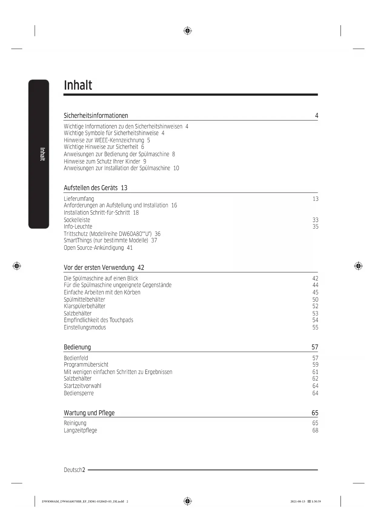 www.samsung.com/be/support (Dutch) www.samsung.com/be_fr/support (French) DENMARK 707 019 70 www.samsung.com/dk/support FINLAND 030-6227 515 www.samsung.com//support FRANCE 01 48 63 00 00 www.samsung.com/fr/support GERMANY 06196 77 555 77 www.samsung.com/de/support ITALIA 800-SAMSUNG (800.7267864) www.samsung.com/it/support CYPRUS 8009 4000 only from landline, toll free www.samsung.com/gr/support GREECE 80111-SAMSUNG (80111 726 7864) only from land line (+30) 210 6897691 from mobile and land line www.samsung.com/gr/support LUXEMBURG 261 03 710 www.samsung.com/be_fr/support NETHERLANDS 088 90 90 100 www.samsung.com/nl/support NORWAY 21629099 www.samsung.com/no/support PORTUGAL 808 207 267 www.samsung.com/pt/support SPAIN 91 175 00 15 www.samsung.com/es/support SWEDEN 0771-400 300 www.samsung.com/se/support SWITZERLAND 0800 726 786 www.samsung.com/ch/support (German) www.samsung.com/ch_fr/support (French) UK 0333 000 0333 www.samsung.com/uk/support IRELAND (EIRE) 0818 717100 www.samsung.com/ie/support DD81-03206D-03 DW8500AM_DW60A8070BB_EF_DD81-03206D-03_PT.indd 84 2021-08-10 2:04:43Spülmaschine Benutzerhandbuch Modellreihen DW60A807*/DW60A806*/DW60A805*/ DW60A804* DW8500AM_DW60A8070BB_EF_DD81-03206D-03_DE.indd 1 2021-08-13 1:50:59Deutsch2 Inhalt Inhalt Sicherheitsinformationen 4 Wichtige Informationen zu den Sicherheitshinweisen 4 Wichtige Symbole für Sicherheitshinweise 4 Hinweise zur WEEE-Kennzeichnung 5 Wichtige Hinweise zur Sicherheit 6 Anweisungen zur Bedienung der Spülmaschine 8 Hinweise zum Schutz Ihrer Kinder 9 Anweisungen zur Installation der Spülmaschine 10 Aufstellen des Geräts 13 Lieferumfang 13 Anforderungen an Aufstellung und Installation 16 Installation Schritt-für-Schritt 18 Sockelleiste 33 Info-Leuchte 35 Trittschutz (Modellreihe DW60A80**U*) 36 SmartThings (nur bestimmte Modelle) 37 Open Source-Ankündigung 41 Vor der ersten Verwendung 42 Die Spülmaschine auf einen Blick 42 Für die Spülmaschine ungeeignete Gegenstände 44 Einfache Arbeiten mit den Körben 45 Spülmittelbehälter 50 Klarspülerbehälter 52 Salzbehälter 53 Empndlichkeit des Touchpads 54 Einstellungsmodus 55 Bedienung 57 Bedienfeld 57 Programmübersicht 59 Mit wenigen einfachen Schritten zu Ergebnissen 61 Salzbehälter 62 Startzeitvorwahl 64 Bediensperre 64 Wartung und Pege 65 Reinigung 65 Langzeitpege 68 DW8500AM_DW60A8070BB_EF_DD81-03206D-03_DE.indd 2 2021-08-13 1:50:59Deutsch 3 Inhalt Fehlerbehebung 69 Prüfpunkte 69 Informationscodes 72 Programmübersicht 73 Anhang 77 Transport/Umzug 77 Schutz vor Frost 77 Entsorgung der Spülmaschine und Umweltschutz 77 Für weitere Informationen zum Ökodesign 77 Technische Daten 78 Für Standardtest 79 DW8500AM_DW60A8070BB_EF_DD81-03206D-03_DE.indd 3 2021-08-13 1:50:59Deutsch4 Sicherheitsinformationen Sicherheitsinformationen Wir freuen uns, dass Sie sich für eine neue Spülmaschine von Samsung entschieden haben. Dieses Handbuch enthält wichtige Informationen bezüglich des Anschlusses, der Verwendung und der Pege Ihres neuen Geräts. Nehmen Sie sich bitte etwas Zeit, um dieses Handbuch zu lesen, denn nur so können Sie die vielen Vorteile und Funktionen Ihrer Spülmaschine voll nutzen. Wichtige Informationen zu den Sicherheitshinweisen Bitte lesen Sie dieses Handbuch sorgfältig durch, damit sichergestellt ist, dass Sie die umfangreichen Produktmerkmale und Funktionen Ihres neuen Geräts sicher und efzient einsetzen können. Bewahren Sie das Handbuch an einem sicheren Platz in der Nähe des Geräts auf, damit Sie auch in Zukunft schnell darauf zurückgreifen können. Verwenden Sie das Gerät nur zu den in diesem Benutzerhandbuch beschriebenen Zwecken. Die Warnungen und wichtigen Sicherheitshinweise dieses Handbuchs decken nicht alle denkbaren Umstände und Situationen ab. Lassen Sie den gesunden Menschenverstand, Vorsicht und die notwendige Sorgfalt nicht außer Acht, wenn Sie Ihre Spülmaschine installieren, warten und einsetzen. Da die folgenden Hinweise zum Betrieb für verschiedene Modelle gelten, können die Eigenschaften Ihrer Spülmaschine sich leicht von den in diesem Handbuch beschriebenen unterscheiden, und es kann sein, dass nicht alle Warnhinweise zutreffen. Bei Fragen oder Problemen wenden Sie sich an Ihr nächstgelegenes Kundendienstzentrum, oder holen Sie sich Hilfe und Informationen online unter „www.samsung.com“. Wichtige Symbole für Sicherheitshinweise Bedeutung der Symbole und Zeichen in diesem Benutzerhandbuch: WARNUNG Gefährliche bzw. unsichere Praktiken, die zu schweren Verletzungen, Tod und/oder Sachschäden führen können. VORSICHT Gefährliche bzw. unsichere Praktiken, die zu Verletzungen und/oder Sachschäden führen können. HINWEIS Dieses Symbol weist darauf hin, dass die Gefahr von Personen- oder Sachschäden besteht. Die folgenden Warnhinweise sollen Sie und andere vor Verletzungen schützen. Befolgen Sie die Hinweise genau. Bewahren Sie diese Anweisungen an einem sicheren Ort auf und stellen Sie sicher, dass neue Benutzer mit dem Inhalt vertraut sind. Geben Sie sie an zukünftige Besitzer weiter. DW8500AM_DW60A8070BB_EF_DD81-03206D-03_DE.indd 4 2021-08-13 1:50:59Deutsch 5 Sicherheitsinformationen Hinweise zur WEEE-Kennzeichnung Korrekte Entsorgung von Altgeräten (Gilt für Länder mit Abfalltrennsystemen) Das Symbol der durchgestrichenen Abfalltonne auf Rädern auf einem Elektro- oder Elektronikgerät, der Verpackung, Gebrauchsanweisung oder dem Garantieschein weist darauf hin, dass das Elektro- oder Elektronikgerät nicht im unsortierten Siedlungsabfall (Hausmüll) entsorgt werden darf, sondern einer getrennten Sammlung zugeführt werden muss. Sie sind verpichtet, dieses Gerät und Zubehörteile einer vom Hausmüll getrennten Erfassung zuzuführen. Altbatterien und Altakkumulatoren, die nicht vom Altgerät umschlossen sind, sowie Lampen, die zerstörungsfrei aus dem Altgerät entnommen werden können, sind vor der Abgabe an einer Erfassungsstelle zerstörungsfrei vom Altgerät zu trennen. Vertreiber von Elektro- od