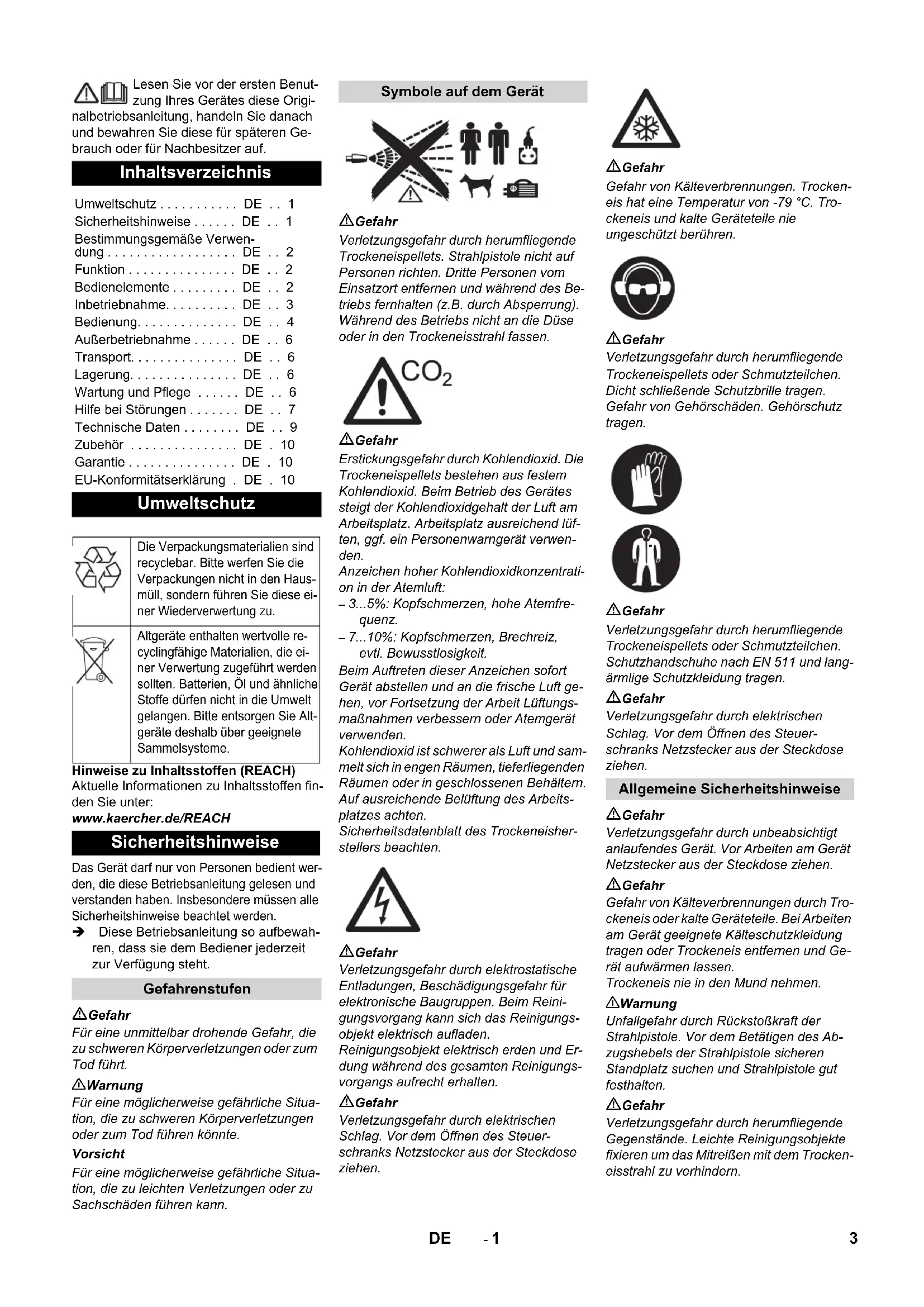 - ا2- 1 Lesen Sie vor der ersten Benut- zung Ihres Gerätes diese Origi- nalbetriebsanleitung, handeln Sie danach und bewahren Sie diese für späteren Ge- brauch oder für Nachbesitzer auf. Hinweise zu Inhaltsstoffen (REACH) Aktuelle Informationen zu Inhaltsstoffen fin- den Sie unter: www.kaercher.de/REACH Das Gerät darf nur von Personen bedient wer- den, die diese Betriebsanleitung gelesen und verstanden haben. Insbesondere müssen alle Sicherheitshinweise beachtet werden. Diese Betriebsanleitung so aufbewah- ren, dass sie dem Bediener jederzeit zur Verfügung steht. Gefahr Für eine unmittelbar drohende Gefahr, die zu schweren Körperverletzungen oder zum Tod führt. 몇 Warnung Für eine möglicherweise gefährliche Situa- tion, die zu schweren Körperverletzungen oder zum Tod führen könnte. Vorsicht Für eine möglicherweise gefährliche Situa- tion, die zu leichten Verletzungen oder zu Sachschäden führen kann. Gefahr Verletzungsgefahr durch herumfliegende Trockeneispellets. Strahlpistole nicht auf Personen richten. Dritte Personen vom Einsatzort entfernen und während des Be- triebs fernhalten (z.B. durch Absperrung). Während des Betriebs nicht an die Düse oder in den Trockeneisstrahl fassen. Gefahr Erstickungsgefahr durch Kohlendioxid. Die Trockeneispellets bestehen aus festem Kohlendioxid. Beim Betrieb des Gerätes steigt der Kohlendioxidgehalt der Luft am Arbeitsplatz. Arbeitsplatz ausreichend lüf- ten, ggf. ein Personenwarngerät verwen- den. Anzeichen hoher Kohlendioxidkonzentrati- on in der Atemluft: – 3 p. 5