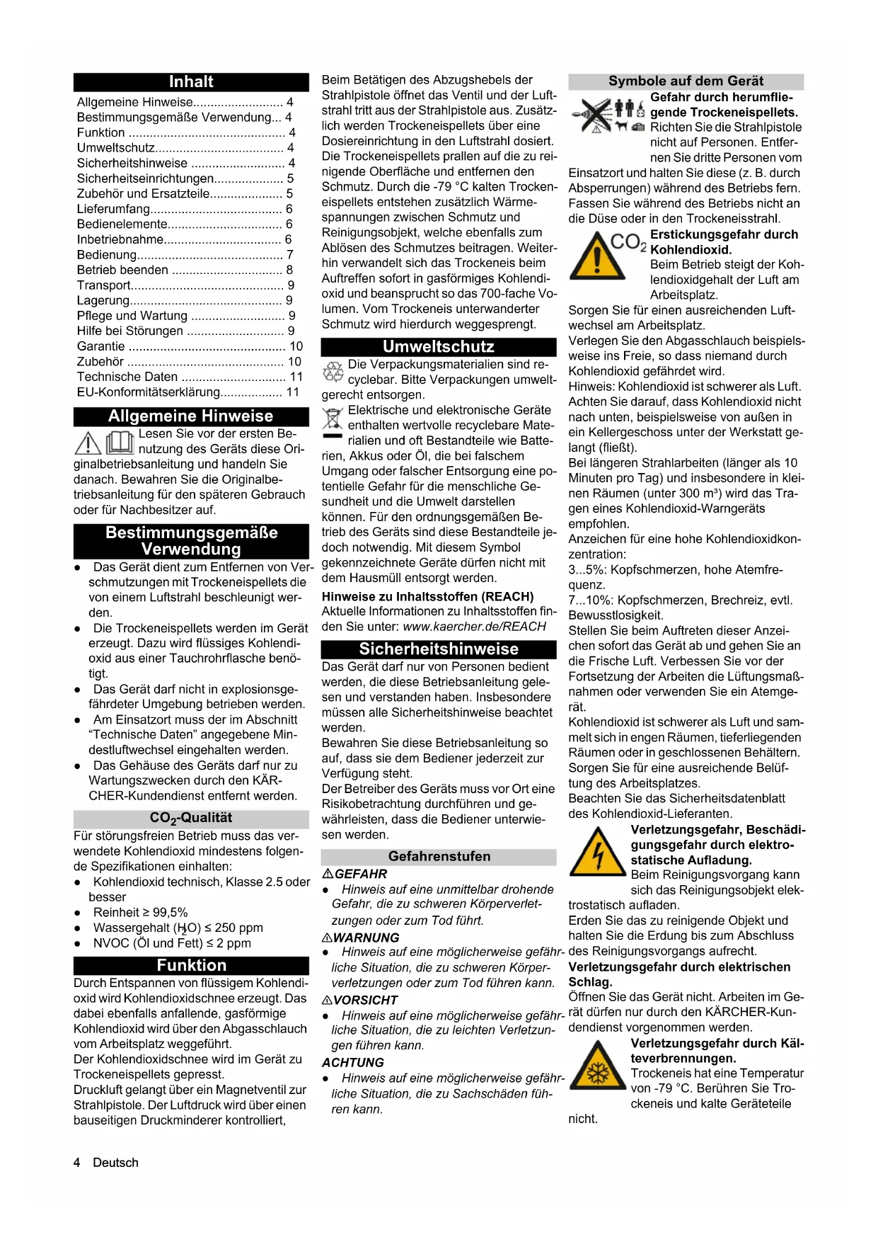 - O) ≤ 250 ppm ● NVOC (Öl und Fett) ≤ 2 ppm Funktion Durch Entspannen von flüssigem Kohlendi- oxid wird Kohlendioxidschnee erzeugt. Das dabei ebenfalls anfallende, gasförmige Kohlendioxid wird über den Abgasschlauch vom Arbeitsplatz weggeführt. Der Kohlendioxidschnee wird im Gerät zu Trockeneispellets gepresst. Druckluft gelangt über ein Magnetventil zur Strahlpistole. Der Luftdruck wird über einen bauseitigen Druckminderer kontrolliert, Beim Betätigen des Abzugshebels der Strahlpistole öffnet das Ventil und der Luft- strahl tritt aus der Strahlpistole aus. Zusätz- lich werden Trockeneispellets über eine Dosiereinrichtung in den Luftstrahl dosiert. Die Trockeneispellets prallen auf die zu rei- nigende Oberfläche und entfernen den Schmutz. Durch die -79 °C kalten Trocken- eispellets entstehen zusätzlich Wärme- spannungen zwischen Schmutz und Reinigungsobjekt, welche ebenfalls zum Ablösen des Schmutzes beitragen. Weiter- hin verwandelt sich das Trockeneis beim Auftreffen sofort in gasförmiges Kohlendi- oxid und beansprucht so das 700-fache Vo- lumen. Vom Trockeneis unterwanderter Schmutz wird hierdurch weggesprengt. Umweltschutz Die Verpackungsmaterialien sind re- cyclebar. Bitte Verpackungen umwelt- gerecht entsorgen. Elektrische und elektronische Geräte enthalten wertvolle recyclebare Mate- rialien und oft Bestandteile wie Batte- rien, Akkus oder Öl, die bei falschem Umgang oder falscher Entsorgung eine po- tentielle Gefahr für die menschliche Ge- sundheit und die Umwelt darstellen können. Für den ordnungsgemäßen Be- trieb des Geräts sind diese Bestandteile je- doch notwendig. Mit diesem Symbol gekennzeichnete Geräte dürfen nicht mit dem Hausmüll entsorgt werden. Hinweise zu Inhaltsstoffen (REACH) Aktuelle Informationen zu Inhaltsstoffen fin- den Sie unter: www.kaercher.de/REACH Sicherheitshinweise Das Gerät darf nur von Personen bedient werden, die diese Betriebsanleitung gele- sen und verstanden haben. Insbesondere müssen alle Sicherheitshinweise beachtet werden. Bewahren Sie diese Betriebsanleitung so auf, dass sie dem Bediener jederzeit zur Verfügung steht. Der Betreiber des Geräts muss vor Ort eine Risikobetrachtung durchführen und ge- währleisten, dass die Bediener unterwie- sen werden. Gefahrenstufen GEFAHR ● Hinweis auf eine unmittelbar drohende Gefahr, die zu schweren Körperverlet- zungen oder zum Tod führt. 몇 WARNUNG ● Hinweis auf eine möglicherweise gefähr- liche Situation, die zu schweren Körper- verletzungen oder zum Tod führen kann. 몇 VORSICHT ● Hinweis auf eine möglicherweise gefähr- liche Situation, die zu leichten Verletzun- gen führen kann. ACHTUNG ● Hinweis auf eine möglicherweise gefähr- liche Situation, die zu Sachschäden füh- ren kann. Symbole auf dem Gerät Gefahr durch herumflie- gende Trockeneispellets. Richten Sie die Strahlpistole nicht auf Personen. Entfer- nen Sie dritte Personen vom Einsatzort und halten Sie diese (z. B. durch Absperrungen) während des Betriebs fern. Fassen Sie während des Betriebs nicht an die Düse oder in den Trockeneisstrahl. Erstickungsgefahr durch Kohlendioxid. Beim Betrieb steigt der Koh- lendioxidgehalt der Luft am Arbeitsplatz. Sorgen Sie für einen ausreichenden Luft- wechsel am Arbeitsplatz. Verlegen Sie den Abgasschlauch beispiels- weise ins Freie, so dass niemand durch Kohlendioxid gefährdet wird. Hinweis: Kohlendioxid ist schwerer als Luft. Achten Sie darauf, dass Kohlendioxid nicht nach unten, beispielsweise von außen in ein Kellergeschoss unter der Werkstatt ge- langt (fließt). Bei längeren Strahlarbeiten (länger als 10 Minuten pro Tag) und insbesondere in klei- nen Räumen (unter 300 m³) wird das Tra- gen eines Kohlendioxid-Warngeräts empfohlen. Anzeichen für eine hohe Kohlendioxidkon- zentration: 3 p. 5