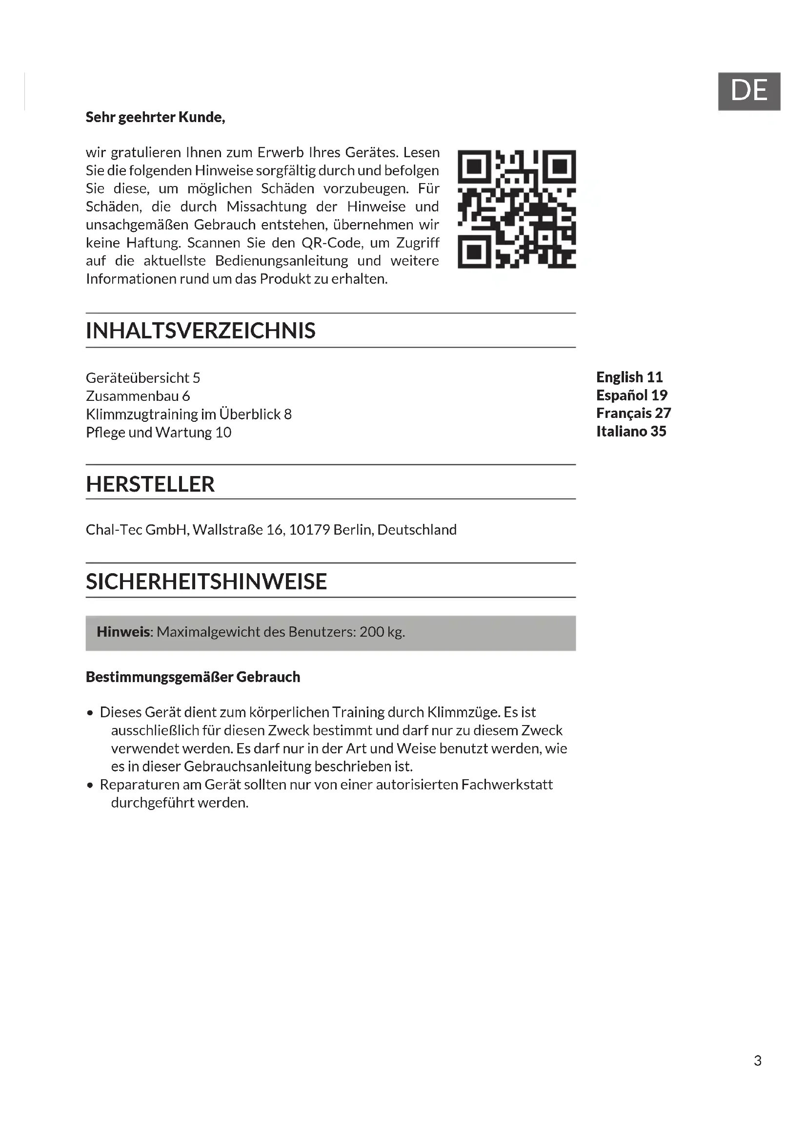 Sehr geehrter Kunde, wir gratulieren Ihnen zum Erwerb Ihres Gerätes. Lesen Sie die folgenden Hinweise sorgfältig durch und befolgen Sie diese, um möglichen Schäden vorzubeugen. Für Schäden, die durch Missachtung der Hinweise und unsachgemäßen Gebrauch entstehen, übernehmen wir keine Haftung. Scannen Sie den QR-Code, um Zugriff auf die aktuellste Bedienungsanleitung und weitere Informationen rund um das Produkt zu erhalten. INHALTSVERZEICHNIS Geräteübersicht 5 Zusammenbau 6 Klimmzugtraining im Überblick 8 Pege und Wartung 10 HERSTELLER Chal-Tec GmbH, Wallstraße 16, 10179 Berlin, Deutschland SICHERHEITSHINWEISE Hinweis: Maximalgewicht des Benutzers: 200 kg. Bestimmungsgemäßer Gebrauch