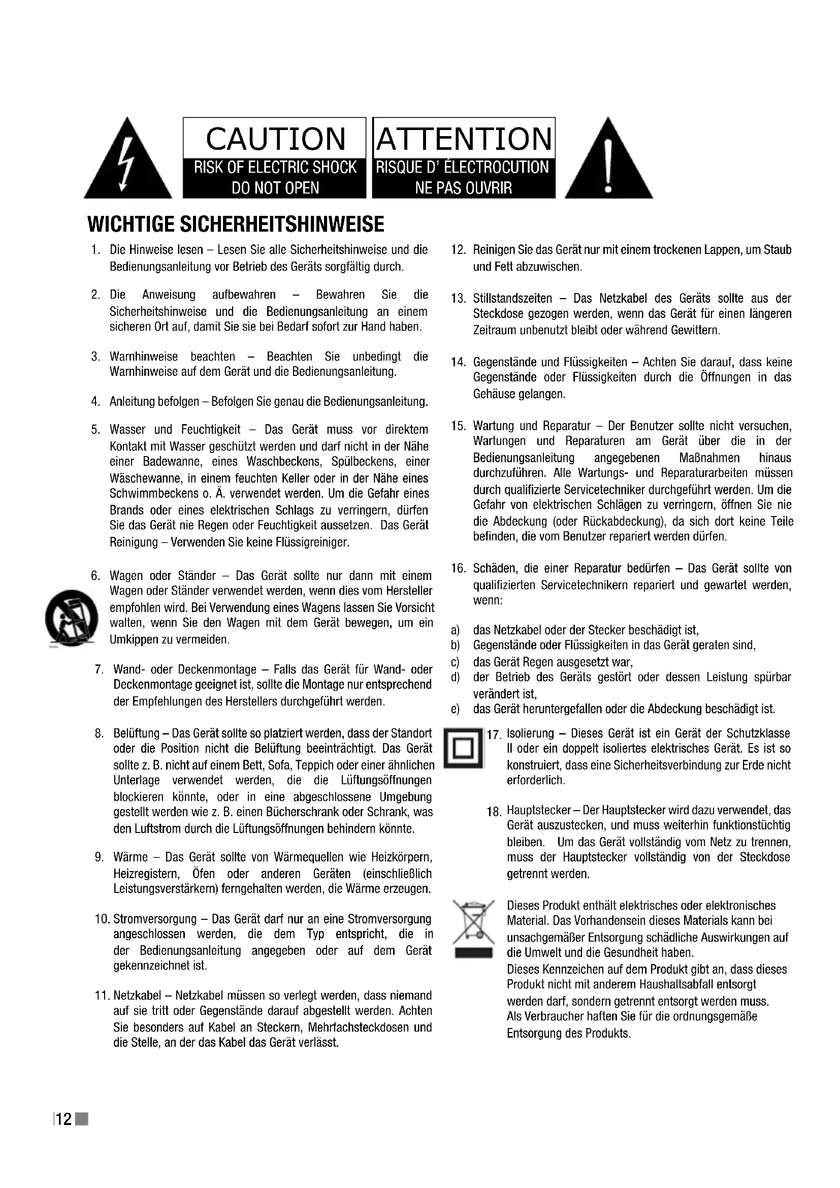 Isolierung – Dieses Gerät ist ein Gerät der Schutzklasse II oder ein doppelt isoliertes elektrisches Gerät. Es ist so konstruiert, dass eine Sicherheitsverbindung zur Erde nicht erforderlich.Hauptstecker – Der Hauptstecker wird dazu verwendet, das Gerät auszustecken, und muss weiterhin funktionstüchtig bleiben. Um das Gerät vollständig vom Netz zu trennen, muss der Hauptstecker vollständig von der Steckdose getrennt werden.Dieses Produkt enthält elektrisches oder elektronisches Material. Das Vorhandensein dieses Materials kann bei unsachgemäßer Entsorgung schädliche Auswirkungen auf die Umwelt und die Gesundheit haben.Dieses Kennzeichen auf dem Produkt gibt an, dass dieses Produkt nicht mit anderem Haushaltsabfall entsorgt werden darf, sondern getrennt entsorgt werden muss. Als Verbraucher haften Sie für die ordnungsgemäße Entsorgung des Produkts.