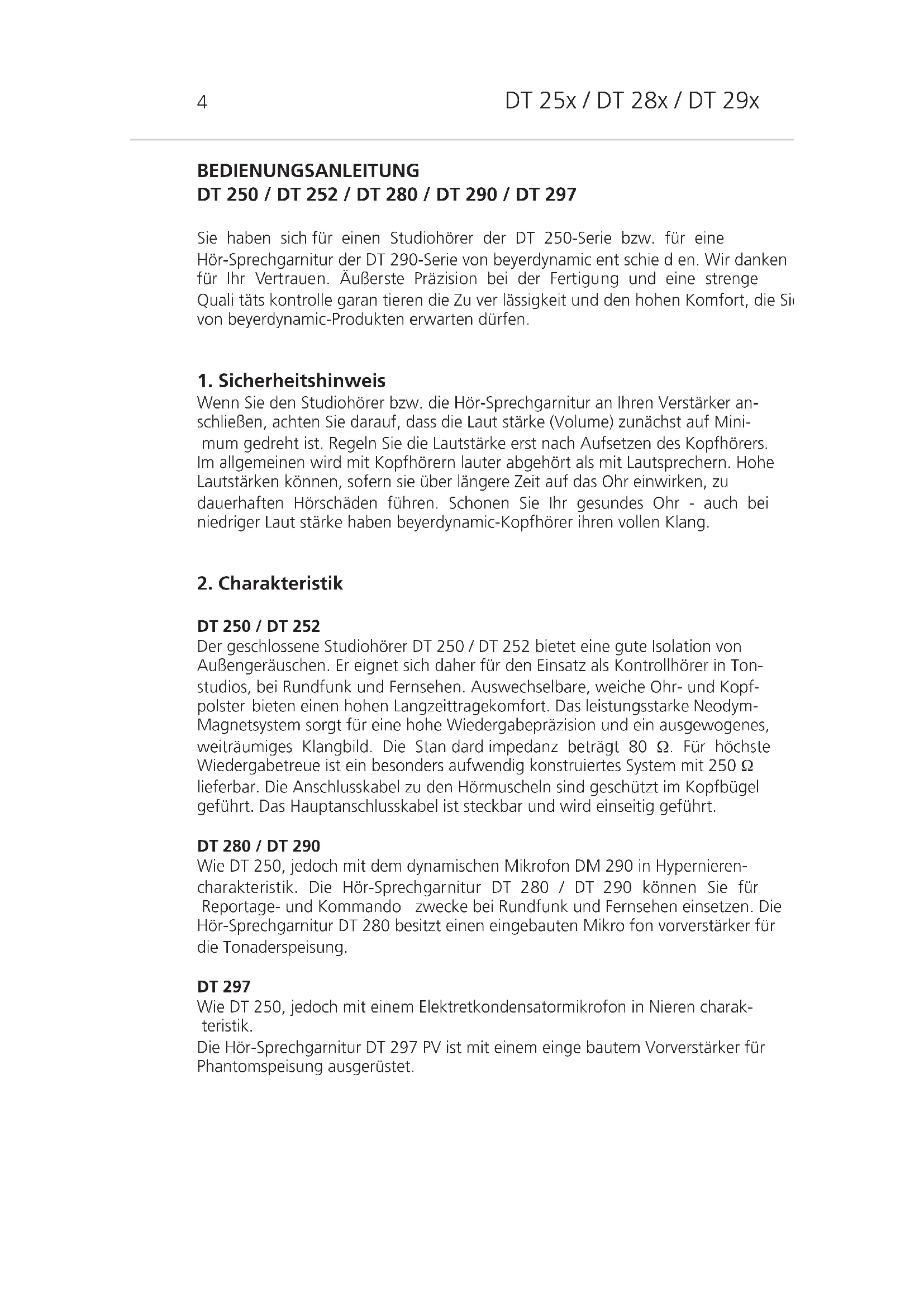 DT 250 / DT 252 Der geschlossene Studiohörer DT 250 / DT 252 bietet eine gute Isolation von Außengeräuschen. Er eignet sich daher für den Einsatz als Kontrollhörer in Ton- studios, bei Rundfunk und Fernsehen. Auswechselbare, weiche Ohr- und Kopf- polster bieten einen hohen Langzeittragekomfort. Das leistungsstarke Neodym- Magnetsystem sorgt für eine hohe Wiedergabepräzision und ein ausgewogenes, weiträumiges Klangbild. Die Stan dard impedanz beträgt 80 Ω. Für höchste Wiedergabetreue ist ein besonders aufwendig konstruiertes System mit 250 Ω lieferbar. Die Anschlusskabel zu den Hörmuscheln sind geschützt im Kopfbügel geführt. Das Hauptanschlusskabel ist steckbar und wird einseitig geführt. DT 280 / DT 290 Wie DT 250, jedoch mit dem dynamischen Mikrofon DM 290 in Hypernieren- charakteristik. Die Hör-Sprechgarnitur DT 280 / DT 290 können Sie für Reportage- und Kommando zwecke bei Rundfunk und Fernsehen einsetzen. Die Hör-Sprechgarnitur DT 280 besitzt einen eingebauten Mikro fon vorverstärker für die Tonaderspeisung. DT 297 Wie DT 250, jedoch mit einem Elektretkondensatormikrofon in Nieren charak- teristik. Die Hör-Sprechgarnitur DT 297 PV ist mit einem einge bautem Vorverstärker für Phantomspeisung ausgerüstet.DT 25x / DT 28x / DT 29x