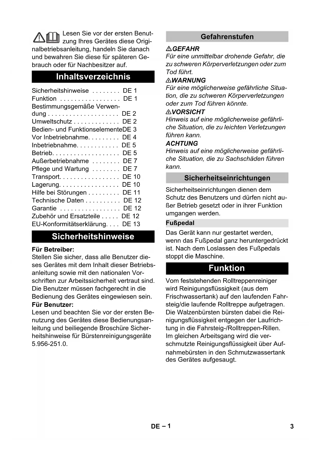 ΍2– 1 Lesen Sie vor der ersten Benut- zung Ihres Gerätes diese Origi- nalbetriebsanleitung, handeln Sie danach und bewahren Sie diese für späteren Ge- brauch oder für Nachbesitzer auf. Für Betreiber: Stellen Sie sicher, dass alle Benutzer die- ses Gerätes mit dem Inhalt dieser Betriebs- anleitung sowie mit den nationalen Vor- schriften zur Arbeitssicherheit vertraut sind. Die Benutzer müssen fachgerecht in die Bedienung des Gerätes eingewiesen sein. Für Benutzer: Lesen und beachten Sie vor der ersten Be- nutzung des Gerätes diese Bedienungsan- leitung und beiliegende Broschüre Sicher- heitshinweise für Bürstenreinigungsgeräte 5.956-251.0. GEFAHR Für eine unmittelbar drohende Gefahr, die zu schweren Körperverletzungen oder zum Tod führt. 몇 WARNUNG Für eine möglicherweise gefährliche Situa- tion, die zu schweren Körperverletzungen oder zum Tod führen könnte. 몇 VORSICHT Hinweis auf eine möglicherweise gefährli- che Situation, die zu leichten Verletzungen führen kann. ACHTUNG Hinweis auf eine möglicherweise gefährli- che Situation, die zu Sachschäden führen kann. Sicherheitseinrichtungen dienen dem Schutz des Benutzers und dürfen nicht au- ßer Betrieb gesetzt oder in ihrer Funktion umgangen werden. Das Gerät kann nur gestartet werden, wenn das Fußpedal ganz heruntergedrückt ist. Nach dem Loslassen des Fußpedals stoppt die Maschine. Vom feststehenden Rolltreppenreiniger wird Reinigungsflüssigkeit (aus dem Frischwassertank) auf den laufenden Fahr- steig/die laufende Rolltreppe aufgetragen. Die Walzenbürsten bürsten dabei die Rei- nigungsflüssigkeit entgegen der Laufrich- tung in die Fahrsteig-/Rolltreppen-Rillen. Im gleichen Arbeitsgang wird die ver- schmutzte Reinigungsflüssigkeit über Auf- nahmebürsten in den Schmutzwassertank des Gerätes aufgesaugt. Inhaltsverzeichnis Sicherheitshinweise ... DE 1 Funktion ... DE 1 Bestimmungsgemäße Verwen- dung ... DE 2 Umweltschutz ... DE 2 Bedien- und FunktionselementeDE 3 Vor Inbetriebnahme... DE 4 Inbetriebnahme... DE 5 Betrieb... DE 5 Außerbetriebnahme ... DE 7 Pflege und Wartung ... DE 7 Transport... DE 10 Lagerung... DE 10 Hilfe bei Störungen ... DE 11 Technische Daten ... DE 12 Garantie ... DE 12 Zubehör und Ersatzteile ... DE 12 EU-Konformitätserklärung... DE 13 Sicherheitshinweise Gefahrenstufen Sicherheitseinrichtungen Fußpedal Funktion 3DE– 2 Dieses Gerät ist für den gewerblichen und industriellen Gebrauch geeignet, z.B. in Hotels, Schulen, Krankenhäusern, Fabri- ken, Läden, Büros und Vermietergeschäf- ten. Verwenden Sie dieses Gerät ausschließ- lich gemäß den Angaben in dieser Be- triebsanleitung. – Das Gerät darf nur zum Reinigen der Trittflächen von Fahrsteigen und Roll- treppen benutzt werden. – Dieses Gerät ist nur für den Gebrauch in Innenräumen bestimmt. – Die Laufrichtung der zu reinigenden An- lage muss so eingestellt sein, dass sich der Fahrsteig/die Rolltreppe vom Gerät weg bewegt. – Zur Reinigung von Rolltreppen darf das Gerät nur am unteren Ende der Roll- treppe eingesetzt werden. – Das Gerät darf nur mit Original-Zubehör und -Ersatzteilen ausgestattet werden. Hinweise zu Inhaltsstoffen (REACH) Aktuelle Informationen zu Inhaltsstoffen fin- den Sie unter: www.kaercher.de/REACH Bestimmungsgemäße Verwendung Umweltschutz Die Verpackungsmaterialien sind recyclebar. Bitte werfen Sie die Verpackungen nicht in den Haus- müll, sondern führen Sie diese ei- ner Wiederverwertung zu. Altgeräte enthalten wertvolle re- cyclingfähige Materialien, die ei- ner Verwertung zugeführt werden sollten. Batterien, Öl und ähnliche Stoffe dürfen nicht in die Umwelt gelangen. Bitte entsorgen Sie Alt- geräte deshalb über geeignete Sammelsysteme. 4 DE– 3 1 Schubbügel 2 Ablassschlauch Frischwasser 3 Ablassschlauch Schmutzwasser 4 Netzstecker 5 Zugentlastungshaken 6 Fußpedal 7 Hintere Räder mit Arretierungshebel 8 Deckel Schmutzwassertank 9 Vordere Räder 10 Schmutzwassertank 11 Einfüllöffnung Frischwassertank 12 Pedal zur Absenkung/Anhebung des Bürstenkopfes 13 Hebel zur Arretierung des Bürstenkopfes 1 Betriebsstundenzähler 2 Anzeige Pumpendruck 3 Geräteschalter 4 Kontrollleuchte „Schmutzwassertank voll“ 5 Kontrollleuchte „Überlast Bürstenmotor“ Bedien- und Funktionselemente Bedienpult 5DE– 4 Verpackung bis auf die Holzpalette ent- fernen. Schubbügel in die Aussparungen am Gerät einsetzen. Schubbügel mit den 4 beiliegenden Schrauben befestigen. Abdeckkappen befestigen. Zugentlastungshaken am Schubbügel einhängen. Hintere Räder feststellen, Holzklötze zur Arretierung der Räder entfernen. Vier gekennzeichnete Bodenbretter der Palette sind mit Schrauben befestigt. Diese Bretter abschrauben. Bretter auf die Kante der Palette legen. Bretter so ausrichten, dass sie vor den Rädern des Gerätes liegen. Bretter mit den Schrauben befestigen. Gerät langsam von der Rampe schieben. Hinweis: Bei der Herstellung wurde das Gerät mit Frostschutzmittel gespült. Vor der Erstinbe- triebnahme muss das Frostschutzmittel entfernt werden. 10 Liter Frischwasser in den Frischwas- sertank einfüllen. Fußpedal treten. Geräteschalter auf Grundreinigung ein- stellen. Gerät so lange in Betrieb lassen, bis der Druck auf dem Manometer absinkt. Symbole auf dem Gerät Ablass Schmutzwasser Ablass Frischwasser Einfüllöffnung Frischwasser- tank Feststellbremse Fußpedal Vor dem Kippen des Ge- rätes Frisch- und Schmutzwassertank lee- ren. Vor Inbetriebnahme Schubbügel montieren