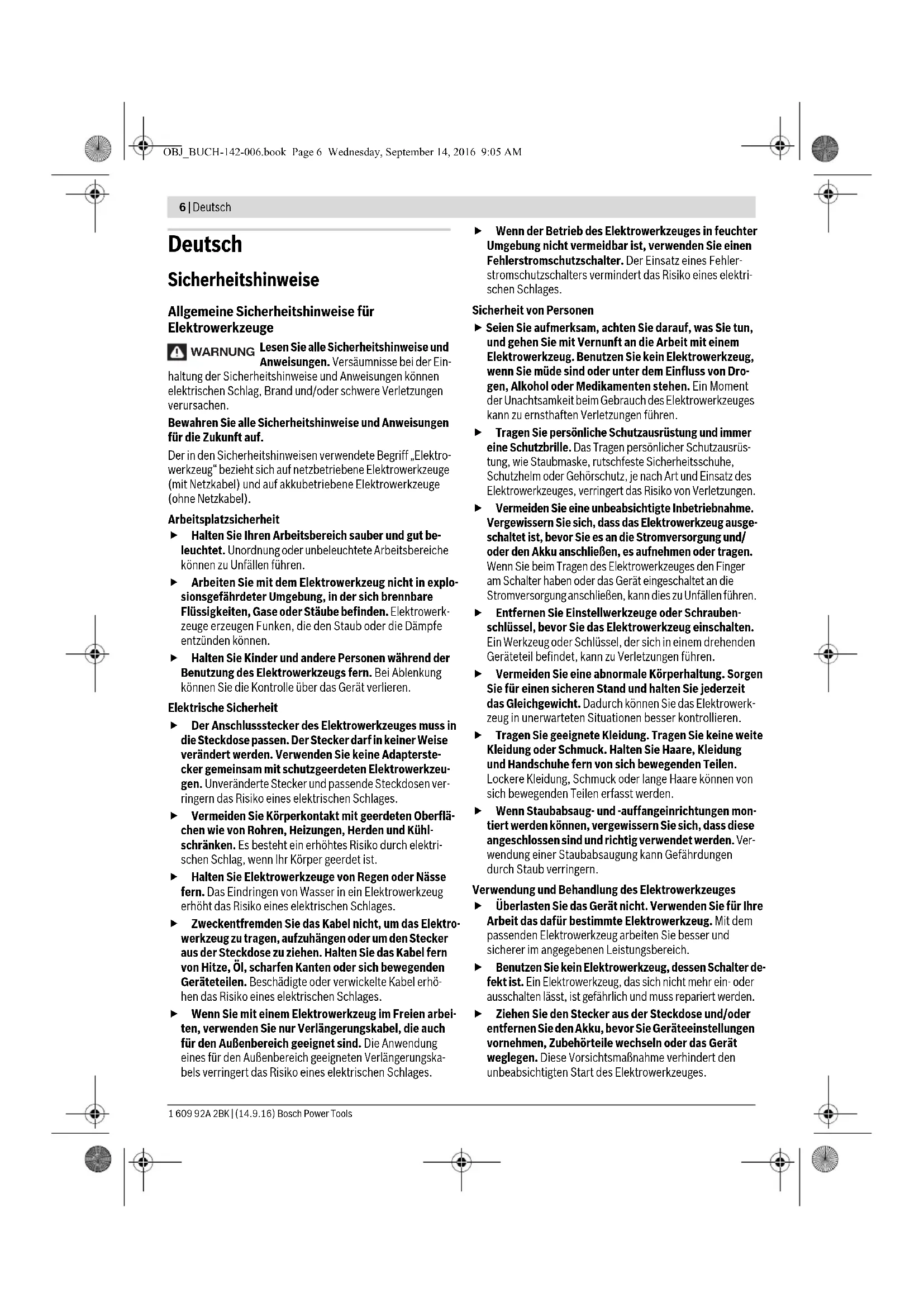OBJ_BUCH-142-006.book Page 5 Monday, September 12, 2016 3:55 PM6 | Deutsch 1 609 92A 2BK | (14.9.16) Bosch Power Tools Deutsch Sicherheitshinweise Allgemeine Sicherheitshinweise für Elektrowerkzeuge Lesen Sie alle Sicherheitshinweise und Anweisungen. Versäumnisse bei der Ein- haltung der Sicherheitshinweise und Anweisungen können elektrischen Schlag, Brand und/oder schwere Verletzungen verursachen. Bewahren Sie alle Sicherheitshinweise und Anweisungen für die Zukunft auf. Der in den Sicherheitshinweisen verwendete Begriff „Elektro- werkzeug“ bezieht sich auf netzbetriebene Elektrowerkzeuge (mit Netzkabel) und auf akkubetriebene Elektrowerkzeuge (ohne Netzkabel). Arbeitsplatzsicherheit Halten Sie Ihren Arbeitsbereich sauber und gut be- leuchtet. Unordnung oder unbeleuchtete Arbeitsbereiche können zu Unfällen führen. Arbeiten Sie mit dem Elektrowerkzeug nicht in explo- sionsgefährdeter Umgebung, in der sich brennbare Flüssigkeiten, Gase oder Stäube befinden. Elektrowerk- zeuge erzeugen Funken, die den Staub oder die Dämpfe entzünden können. Halten Sie Kinder und andere Personen während der Benutzung des Elektrowerkzeugs fern. Bei Ablenkung können Sie die Kontrolle über das Gerät verlieren. Elektrische Sicherheit Der Anschlussstecker des Elektrowerkzeuges muss in die Steckdose passen. Der Stecker darf in keiner Weise verändert werden. Verwenden Sie keine Adapterste- cker gemeinsam mit schutzgeerdeten Elektrowerkzeu- gen. Unveränderte Stecker und passende Steckdosen ver- ringern das Risiko eines elektrischen Schlages. Vermeiden Sie Körperkontakt mit geerdeten Oberflä- chen wie von Rohren, Heizungen, Herden und Kühl- schränken. Es besteht ein erhöhtes Risiko durch elektri- schen Schlag, wenn Ihr Körper geerdet ist. Halten Sie Elektrowerkzeuge von Regen oder Nässe fern. Das Eindringen von Wasser in ein Elektrowerkzeug erhöht das Risiko eines elektrischen Schlages. Zweckentfremden Sie das Kabel nicht, um das Elektro- werkzeug zu tragen, aufzuhängen oder um den Stecker aus der Steckdose zu ziehen. Halten Sie das Kabel fern von Hitze, Öl, scharfen Kanten oder sich bewegenden Geräteteilen. Beschädigte oder verwickelte Kabel erhö- hen das Risiko eines elektrischen Schlages. Wenn Sie mit einem Elektrowerkzeug im Freien arbei- ten, verwenden Sie nur Verlängerungskabel, die auch für den Außenbereich geeignet sind. Die Anwendung eines für den Außenbereich geeigneten Verlängerungska- bels verringert das Risiko eines elektrischen Schlages. Wenn der Betrieb des Elektrowerkzeuges in feuchter Umgebung nicht vermeidbar ist, verwenden Sie einen Fehlerstromschutzschalter. Der Einsatz eines Fehler- stromschutzschalters vermindert das Risiko eines elektri- schen Schlages. Sicherheit von Personen Seien Sie aufmerksam, achten Sie darauf, was Sie tun, und gehen Sie mit Vernunft an die Arbeit mit einem Elektrowerkzeug. Benutzen Sie kein Elektrowerkzeug, wenn Sie müde sind oder unter dem Einfluss von Dro- gen, Alkohol oder Medikamenten stehen. Ein Moment der Unachtsamkeit beim Gebrauch des Elektrowerkzeuges kann zu ernsthaften Verletzungen führen. Tragen Sie persönliche Schutzausrüstung und immer eine Schutzbrille. Das Tragen persönlicher Schutzausrüs- tung, wie Staubmaske, rutschfeste Sicherheitsschuhe, Schutzhelm oder Gehörschutz, je nach Art und Einsatz des Elektrowerkzeuges, verringert das Risiko von Verletzungen. Vermeiden Sie eine unbeabsichtigte Inbetriebnahme. Vergewissern Sie sich, dass das Elektrowerkzeug ausge- schaltet ist, bevor Sie es an die Stromversorgung und/ oder den Akku anschließen, es aufnehmen oder tragen. Wenn Sie beim Tragen des Elektrowerkzeuges den Finger am Schalter haben oder das Gerät eingeschaltet an die Stromversorgung anschließen, kann dies zu Unfällen führen. Entfernen Sie Einstellwerkzeuge oder Schrauben- schlüssel, bevor Sie das Elektrowerkzeug einschalten. Ein Werkzeug oder Schlüssel, der sich in einem drehenden Geräteteil befindet, kann zu Verletzungen führen. Vermeiden Sie eine abnormale Körperhaltung. Sorgen Sie für einen sicheren Stand und halten Sie jederzeit das Gleichgewicht. Dadurch können Sie das Elektrowerk- zeug in unerwarteten Situationen besser kontrollieren. Tragen Sie geeignete Kleidung. Tragen Sie keine weite Kleidung oder Schmuck. Halten Sie Haare, Kleidung und Handschuhe fern von sich bewegenden Teilen. Lockere Kleidung, Schmuck oder lange Haare können von sich bewegenden Teilen erfasst werden. Wenn Staubabsaug- und -auffangeinrichtungen mon- tiert werden können, vergewissern Sie sich, dass diese angeschlossen sind und richtig verwendet werden. Ver- wendung einer Staubabsaugung kann Gefährdungen durch Staub verringern. Verwendung und Behandlung des Elektrowerkzeuges Überlasten Sie das Gerät nicht. Verwenden Sie für Ihre Arbeit das dafür bestimmte Elektrowerkzeug. Mit dem passenden Elektrowerkzeug arbeiten Sie besser und sicherer im angegebenen Leistungsbereich. Benutzen Sie kein Elektrowerkzeug, dessen Schalter de- fekt ist. Ein Elektrowerkzeug, das sich nicht mehr ein- oder ausschalten lässt, ist gefährlich und muss repariert werden. Ziehen Sie den Stecker aus der Steckdose und/oder entfernen Sie den Akku, bevor Sie Geräteeinstellungen vornehmen, Zubehörteile wechseln oder das Gerät weglegen. Diese Vorsichtsmaßnahme verhindert den unbeabsichtigten Start des Elektrowerkzeuges. WARNUNG OBJ_BUCH-142-006.book Page 6 Wednesday, September 14, 2016 9:05 AMDeutsch | 7 Bosch Power Tools 1 609 92A 2BK | (14.9.16) Bewahren Sie unbenutzte Elektrowerkzeuge außer- halb der Reichweite von Kindern auf. Lassen Sie Perso- nen das Gerät nicht benutzen, die mit diesem nicht ver- traut sind oder diese Anweisungen nicht gelesen haben. Elektrowerkzeuge sind gefährlich, wenn sie von unerfahrenen Personen benutzt werden. Pflegen Sie Elektrowerkzeuge mit Sorgfalt. Kontrollie- ren Sie, ob bewegliche Teile einwandfrei funktionieren und nicht klemmen, ob Teile gebrochen oder so be- schädigt sind, dass die Funktion 