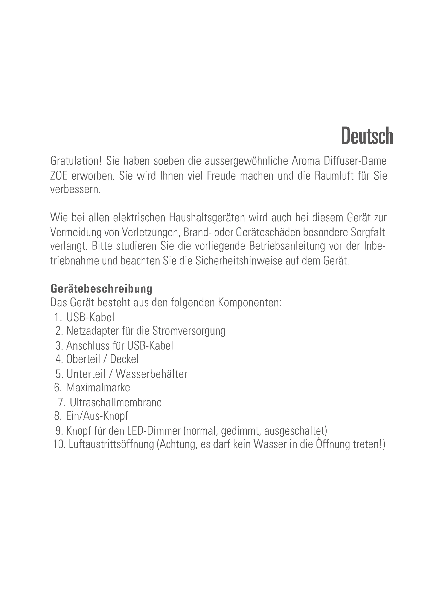 - Im Falle einer Reparatur müssen folgende Punkte beachtet werden, bevor das Gerät verschickt oder zum Händler gebracht wird: das Wasser im Gerät komplett ausleeren (Wasserwanne bzw. Wassertank) und das Gerät voll- ständig trocknen lassen. Geräte mit Restwasser werden während des Trans- ports beschädigt. Die Garantie erlischt in diesem Falle. Entsorgung Die europäische Richtlinie 2012 / 19 / CE über Elektro- und Elektronik-Altgeräte (WEEE) verlangt, dass elektrische Haushaltsgeräte nicht über den Restmüll oder sonstigen Haushaltsabfall entsorgt werden dürfen, sondern an Sammel- punkten für das Recycling von elektrischen und elektronischen Geräten abge- geben werden müssen. So können die Verwertung der enthaltenen Materialien optimiert und ihre Auswirkungen auf die menschliche Gesundheit und die Um-welt reduziert werden. Das durchgestrichene Abfalltonnensymbol auf dem Produkt erinnert Sie an diese Verpflichtung. Bitte fragen Sie bei Ihrer Gemeindeverwaltung nach der zuständigen Entsorgungs- stelle. Technische Daten Nennspannung DC 5 V Nennleistung 5 W Abmessungen 113 x 105 mm (Durchmesser x Höhe) Gewicht 0.3 kg Tankinhalt 80 ml Schalldruckpegel < 27 dB(A) Erfüllt EU-Vorschrift CE / WEEE / RoHS / EAC Technische Änderungen vorbehaltenFrançais Félicitations! Vous venez d’acheter ZOE, le diffuseur d’arômes sortant de l’or- dinaire. Nous espérons que cet appareil vous donnera entière satisfaction et améliorera l’air intérieur pour vous. Comme pour tous les appareils ménagers électriques, il est important d‘en-tre- tenir cet appareil correctement afin d’éviter les blessures, les incendies ou les dommages. Veuillez lire attentivement le présent mode d‘emploi avant la mise en service et respecter les conseils de sécurité indiqués sur l’appareil. Description de l’appareil L’appareil est composé des éléments principaux suivants :