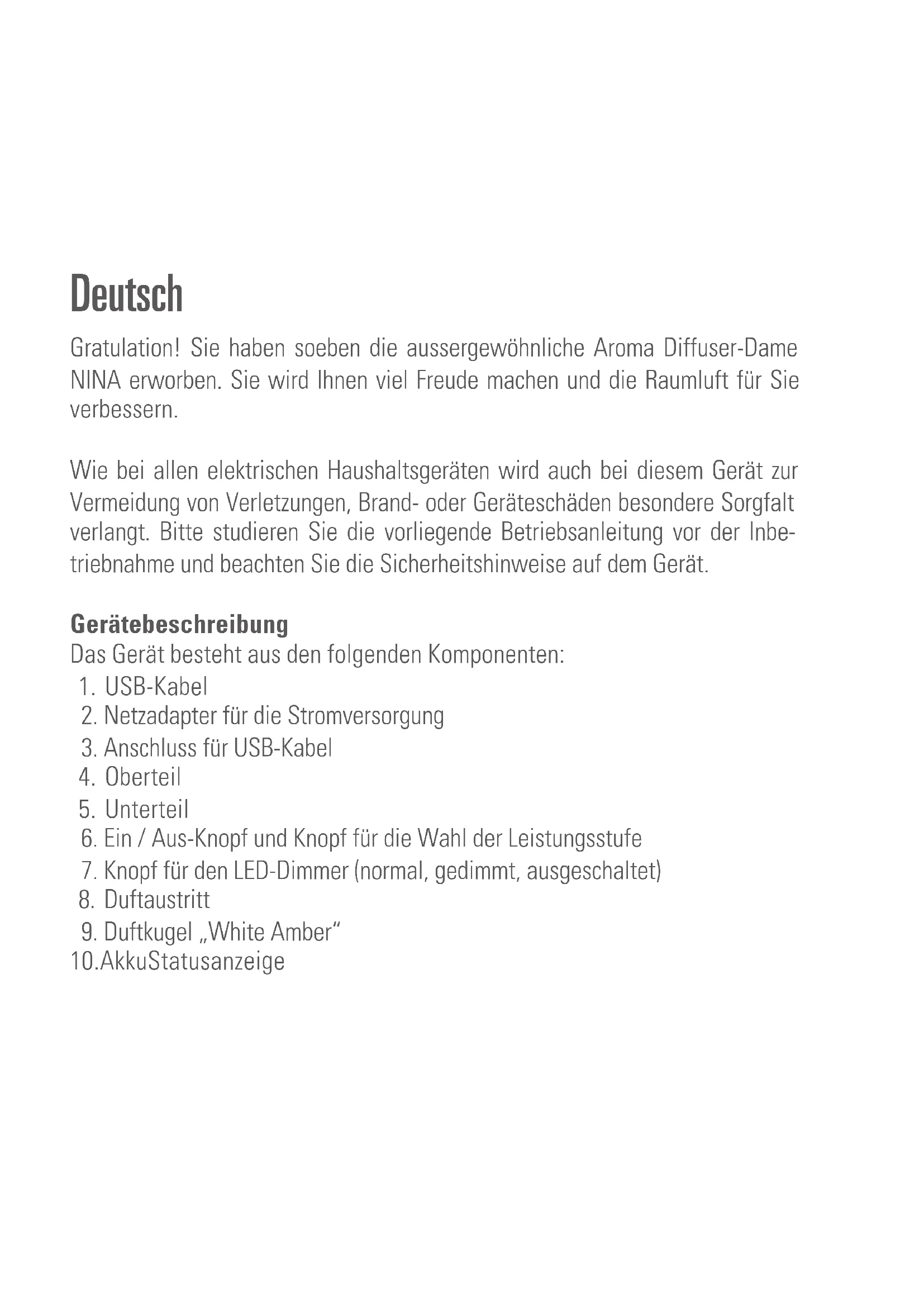 - Ausgedientes Gerät sofort unbrauchbar machen (Netzkabel durchtrennen) und bei der dafür vorgesehenen Sammelstelle abgeben. Entsorgung Die europäische Richtlinie 2012 / 19 / CE über Elektro- und Elektronik-Altge- räte (WEEE) verlangt, dass elektrische Haushaltsgeräte nicht über den Restmüll oder sonstigen Haushaltsabfall entsorgt werden dürfen, sondern an Sammel- punkten für das Recycling von elektrischen und elektronischen Geräten abge- geben werden müssen. So können die Verwertung der enthaltenen Materia- lien optimiert und ihre Auswirkungen auf die menschliche Gesundheit und die Umwelt reduziert werden. Das durchgestrichene Abfalltonnensymbol auf dem Produkt erinnert Sie an diese Verpflichtung. Bitte fragen Sie bei Ihrer Gemeinde- verwaltung nach der zuständigen Entsorgungsstelle. Die Duftkugel besteht aus einem chlorfreien Kunstoff und kann im Haushaltsabfall entsorgt wer- den. Akkuentsorgung: Nicht in den Abfalleimer werfen, die Elektrode ist in Isolierpapier eingewickelt, kann recycelt und wiederverwendet werden.Technische Daten Nennspannung 100–240 V / 50/60 Hz Nennleistung 3.5 W Laufzeit bis zu 50 h Abmessungen 100 x 160 mm (Durchmesser x Höhe) Gewicht 360 g Schalldruckpegel < 26 dB(A) Temperaturbereich der Akkuaufladung 0–45 °C Akkumodell PN103040 Erfüllt EU-Vorschrift CE / RoHS / EAC Technische Änderungen vorbehaltenFrançais Félicitations! Vous venez d’acheter NINA, le diffuseur d’arômes sortant de l’or- dinaire. Nous espérons que cet appareil vous donnera entière satisfaction et améliorera l’air intérieur pour vous. Comme pour tous les appareils ménagers électriques, il est important d‘en-tre- tenir cet appareil correctement afin d’éviter les blessures, les incendies ou les dommages. Veuillez lire attentivement le présent mode d‘emploi avant la mise en service et respecter les conseils de sécurité indiqués sur l’appareil. Description de l’appareil L’appareil est composé des éléments principaux suivants :
