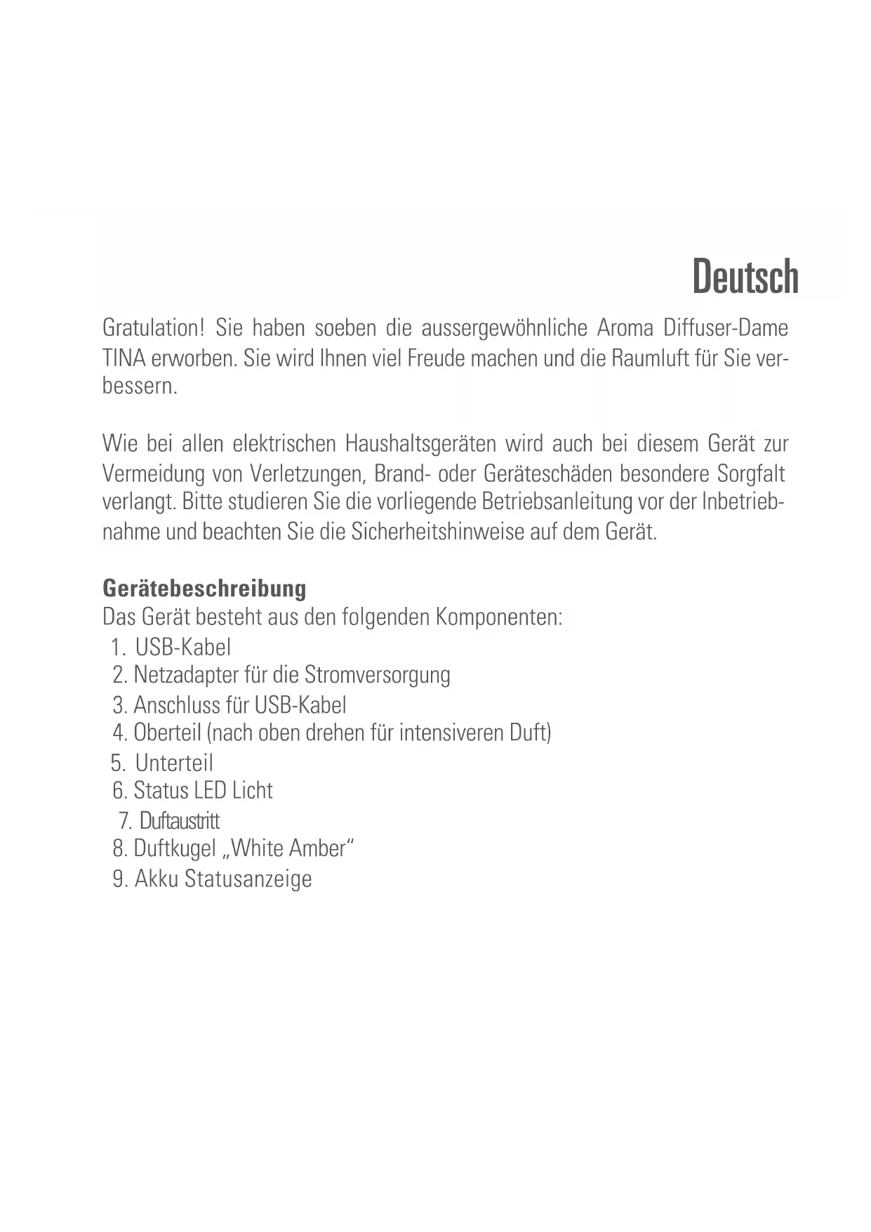 - Ausgedientes Gerät sofort unbrauchbar machen (Netzkabel durchtrennen) und bei der dafür vorgesehenen Sammelstelle abgeben. Entsorgung Die europäische Richtlinie 2012 / 19 / CE über Elektro- und Elektronik-Altgeräte (WEEE) verlangt, dass elektrische Haushaltsgeräte nicht über den Restmüll odersonstigen Haushaltsabfall entsorgt werden dürfen, sondern an Sammelpunkten für das Recycling von elektrischen und elektronischen Geräten abgegeben wer- den müssen. So können die Verwertung der enthaltenen Materialien optimiert und ihre Auswirkungen auf die menschliche Gesundheit und die Umwelt reduziert werden. Das durchgestrichene Abfalltonnensymbol auf dem Produkt erinnert Sie an diese Verpflichtung. Bitte fragen Sie bei Ihrer Gemeindeverwaltung nach der zuständigen Entsorgungsstelle. Die Duftkugel besteht aus einem chlor- freien Kunstoff und kann im Haushaltsabfall entsorgt werden. Akkuent- sorgung: Nicht in den Abfalleimer werfen, die Elektrode ist in Isolier- papier eingewickelt, kann recycelt und wiederverwendet werden. Technische Daten Nennspannung 100–240 V / 50/60 Hz Nennleistung 3.5 W Laufzeit bis zu 30 h Abmessungen 75 x 177 mm (Durchmesser x Höhe) Gewicht 300 g Schalldruckpegel < 26 dB(A) Temperaturbereich der Akkuaufladung 0–45 °C Akkumodell PN102540 Erfüllt EU-Vorschrift CE / RoHS / EAC Technische Änderungen vorbehaltenFrançais Félicitations! Vous venez d’acheter TINA, le diffuseur d’arômes sortant de l’ordi- naire. Nous espérons que cet appareil vous donnera entière satisfaction et amé- liorera l’air intérieur pour vous. Comme pour tous les appareils ménagers électriques, il est important d‘en-tre- tenir cet appareil correctement afin d’éviter les blessures, les incendies ou les dommages. Veuillez lire attentivement le présent mode d‘emploi avant la mise en service et respecter les conseils de sécurité indiqués sur l’appareil. Description de l’appareil L’appareil est composé des éléments principaux suivants :