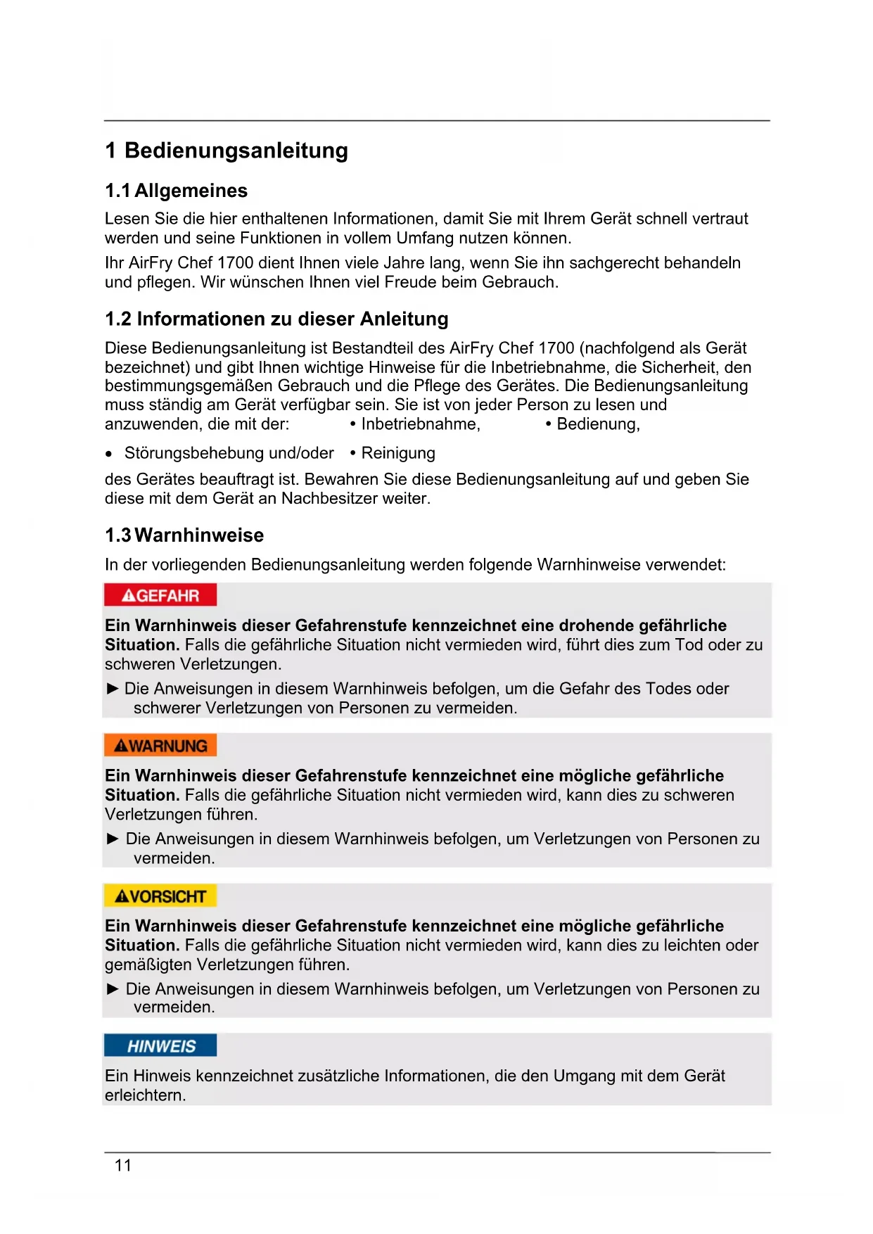 Diese Bedienungsanleitung ist Bestandteil des AirFry Chef 1700 (nachfolgend als Gerät bezeichnet) und gibt Ihnen wichtige Hinweise für die Inbetriebnahme, die Sicherheit, den bestimmungsgemäßen Gebrauch und die Pflege des Gerätes. Die Bedienungsanleitung muss ständig am Gerät verfügbar sein. Sie ist von jeder Person zu lesen und anzuwenden, die mit der: Inbetriebnahme, Bedienung, Störungsbehebung und/oder Reinigung des Gerätes beauftragt ist. Bewahren Sie diese Bedienungsanleitung auf und geben Sie diese mit dem Gerät an Nachbesitzer weiter.