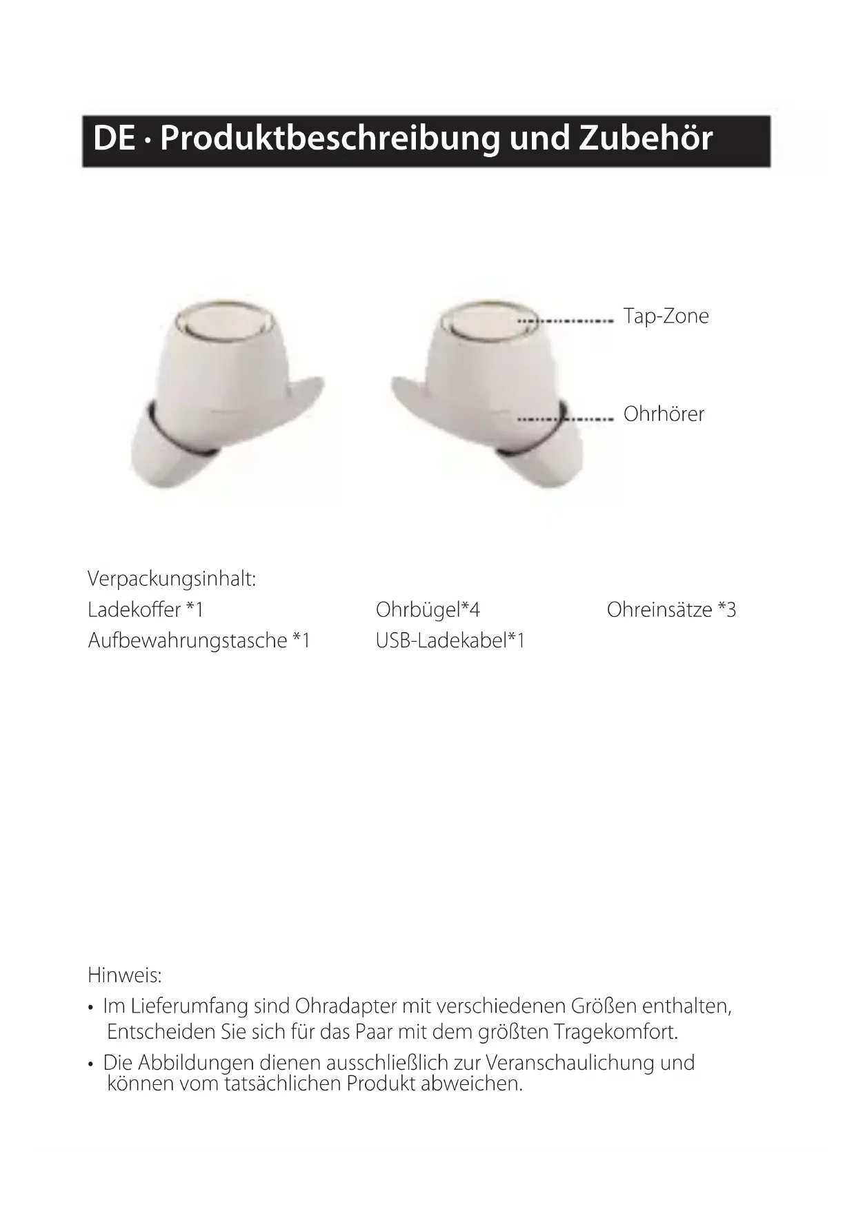 Die Abbildungen dienen ausschließlich zur Veranschaulichung und können vom tatsächlichen Produkt abweichen.■ Bedienungsanleitung Drücken: anzeige des Akkustands ● Laden Sie die Ohrhörer auf