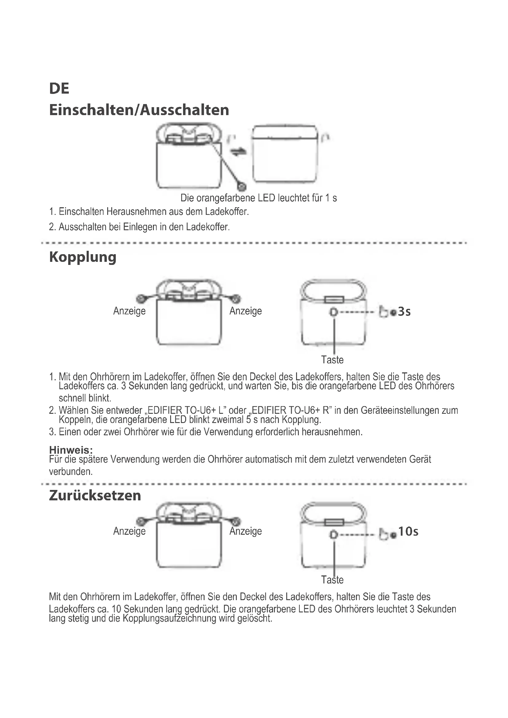 Zurücksetzen Mit den Ohrhörern im Ladekoffer, öffnen Sie den Deckel des Ladekoffers, halten Sie die Taste des Ladekoffers ca. 10 Sekunden lang gedrückt. Die orangefarbene LED des Ohrhörers leuchtet 3 Sekunden lang stetig und die Kopplungsaufzeichnung wird gelöscht. Die orangefarbene LED leuchtet für 1 s Taste