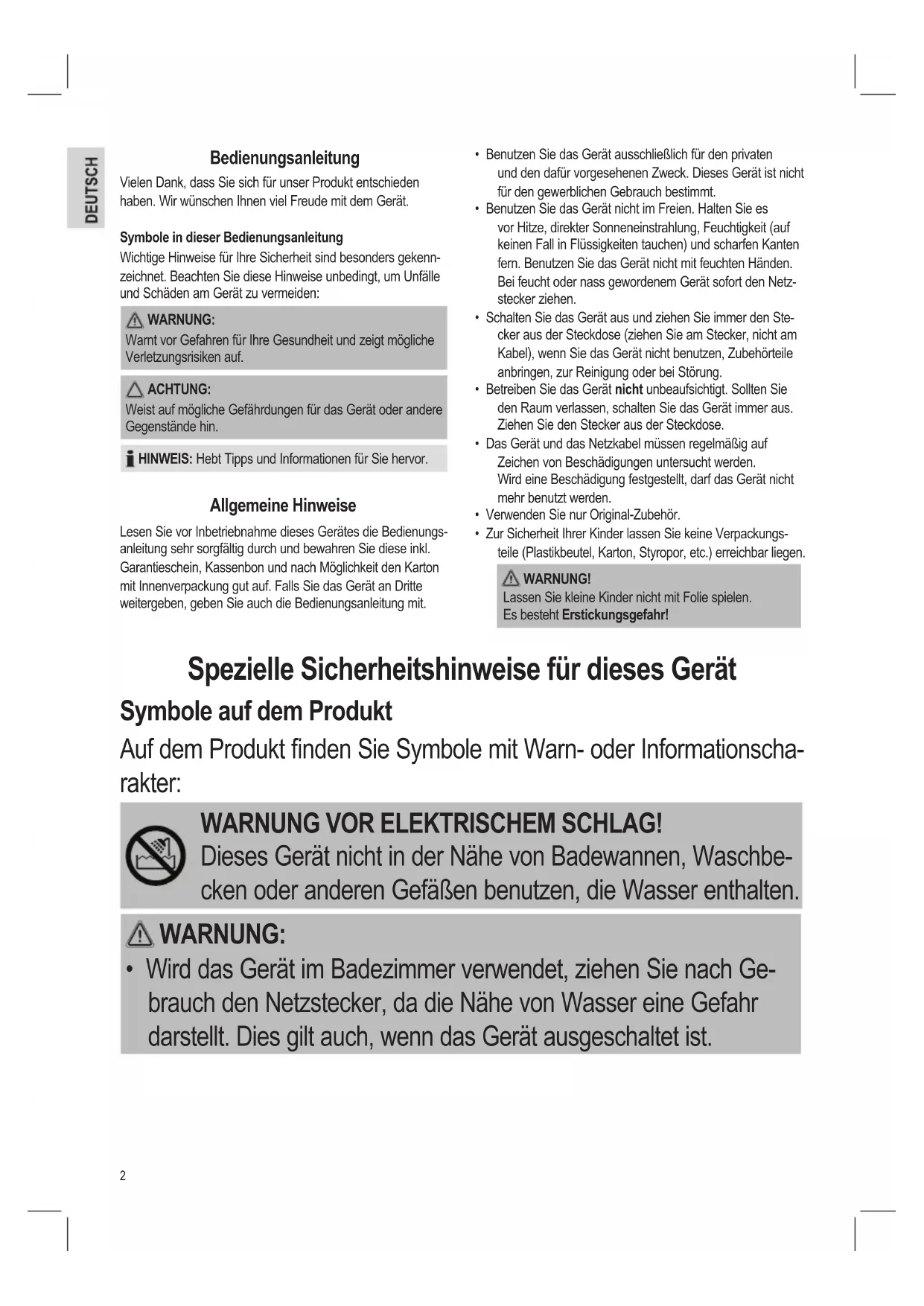 - Zur Sicherheit Ihrer Kinder lassen Sie keine Verpackungs- teile (Plastikbeutel, Karton, Styropor, etc.) erreichbar liegen. WARNUNG! Lassen Sie kleine Kinder nicht mit Folie spielen. Es besteht Erstickungsgefahr! Spezielle Sicherheitshinweise für dieses Gerät Symbole auf dem Produkt Auf dem Produkt nden Sie Symbole mit Warn- oder Informationscha- rakter: WARNUNG VOR ELEKTRISCHEM SCHLAG! Dieses Gerät nicht in der Nähe von Badewannen, Waschbe- cken oder anderen Gefäßen benutzen, die Wasser enthalten. WARNUNG:
