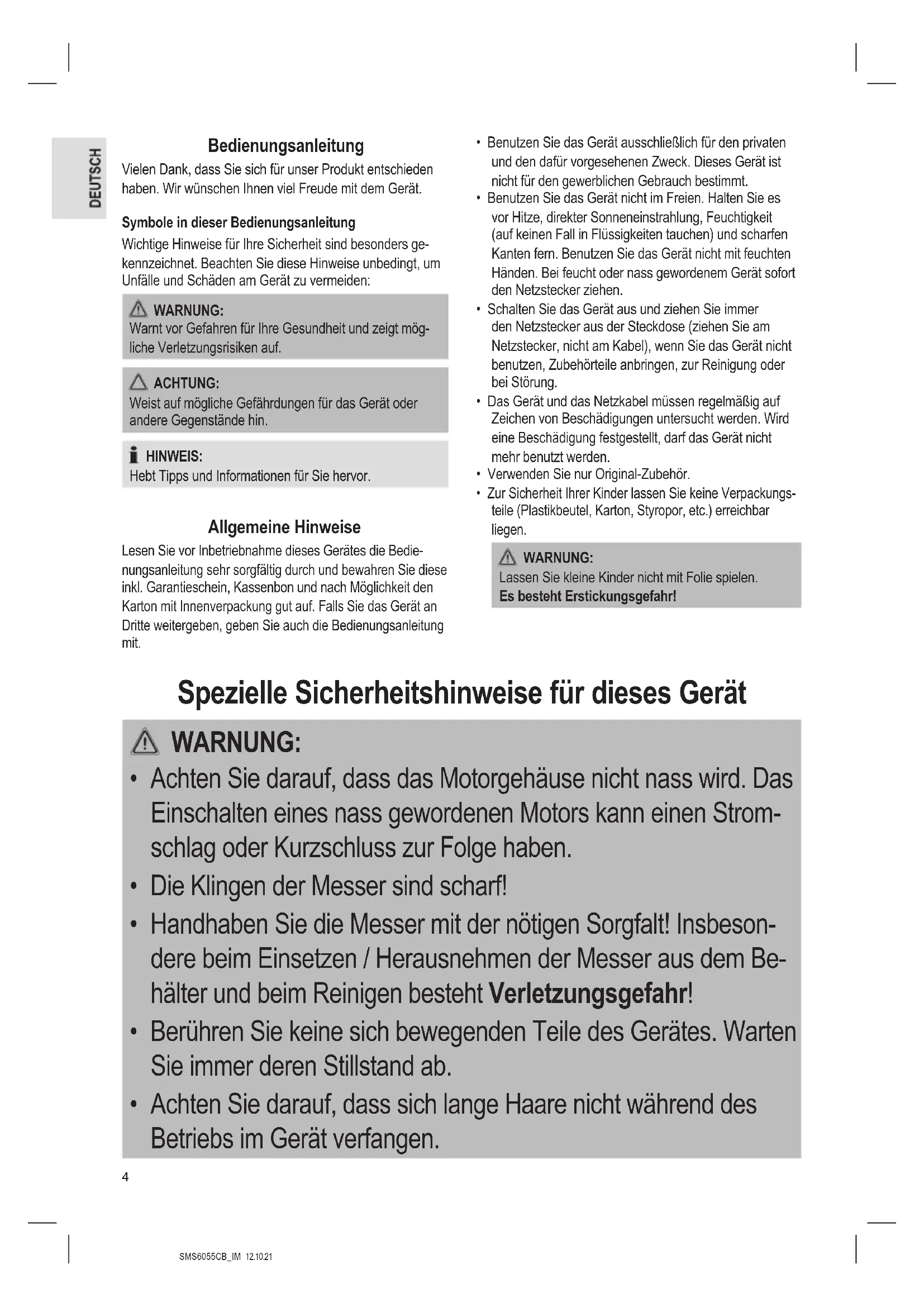 - eine Übersicht über aktuelle Kundeninformationen Stand 08 2021 Entsorgung Bedeutung des Symbols „Mülltonne“ Schonen Sie unsere Umwelt, Elektrogeräte ge- hören nicht in den Hausmüll. Nutzen Sie die für die Entsorgung von Elektro- geräten vorgesehenen Sammelstellen und geben dort Ihre Elektrogeräte ab, die Sie nicht mehr benutzen werden. Sie helfen damit die potenziellen Auswirkungen, durch falsche Entsorgung, auf die Umwelt und die menschliche Gesundheit zu vermeiden. Sie leisten damit Ihren Beitrag zur Wiederverwertung, zum Recycling und zu anderen Formen der Verwertung von Elektro- und Elektronik-Altgeräten. Informationen, wo die Geräte zu entsorgen sind, erhalten Sie über Ihre Kommunen oder die Gemeindeverwaltungen.SMS6055CB_IM 12.10.21