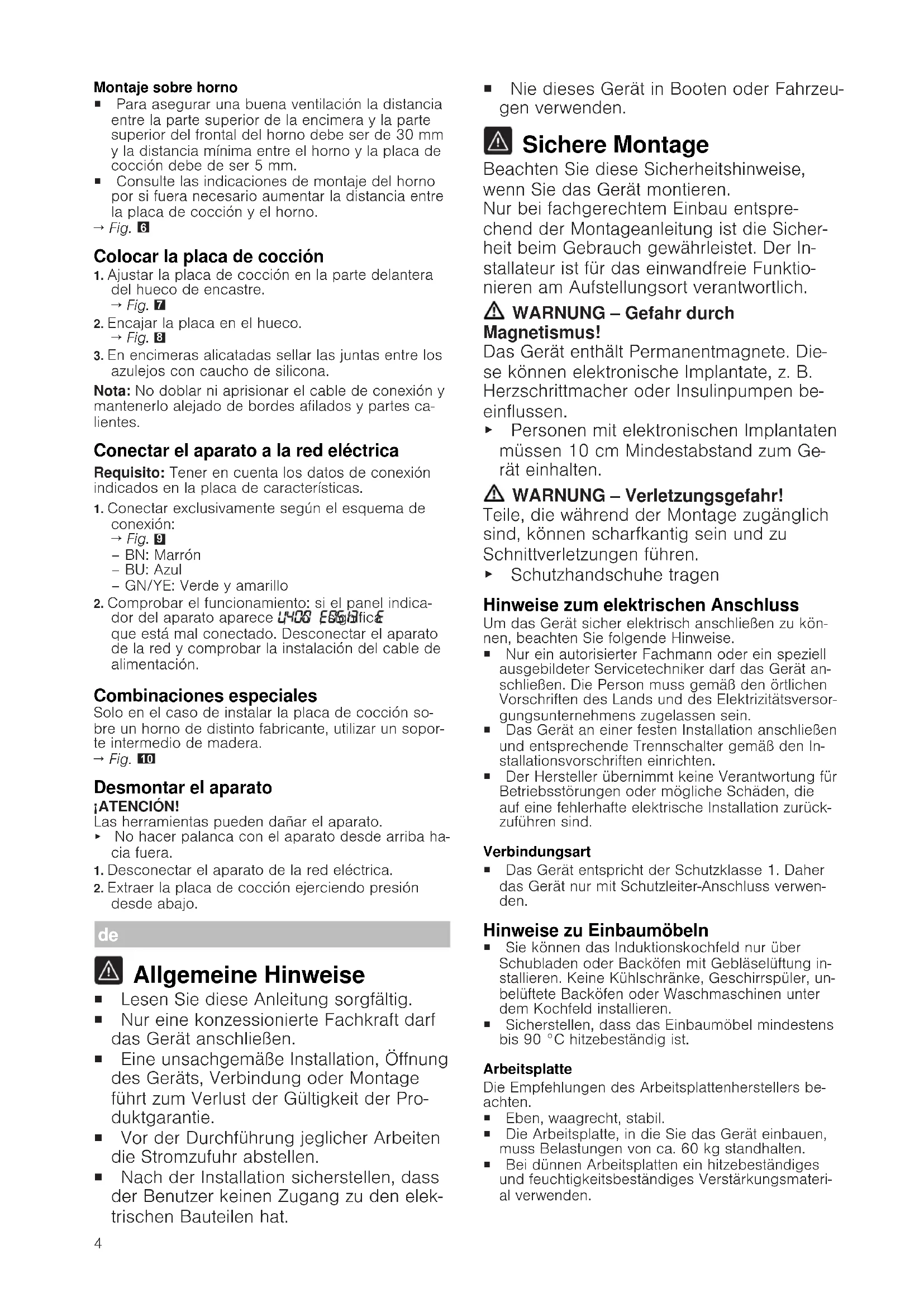 Allgemeine Hinweise ¡ Lesen Sie diese Anleitung sorgfältig. ¡ Nur eine konzessionierte Fachkraft darf das Gerät anschließen. ¡ Eine unsachgemäße Installation, Öffnung des Geräts, Verbindung oder Montage führt zum Verlust der Gültigkeit der Pro- duktgarantie. ¡ Vor der Durchführung jeglicher Arbeiten die Stromzufuhr abstellen. ¡ Nach der Installation sicherstellen, dass der Benutzer keinen Zugang zu den elek- trischen Bauteilen hat. ¡ Nie dieses Gerät in Booten oder Fahrzeu- gen verwenden. Sichere Montage Beachten Sie diese Sicherheitshinweise, wenn Sie das Gerät montieren. Nur bei fachgerechtem Einbau entspre- chend der Montageanleitung ist die Sicher- heit beim Gebrauch gewährleistet. Der In- stallateur ist für das einwandfreie Funktio- nieren am Aufstellungsort verantwortlich. WARNUNG‒Gefahr durch Magnetismus! Das Gerät enthält Permanentmagnete. Die- se können elektronische Implantate, z.B. Herzschrittmacher oder Insulinpumpen be- einflussen. ▶ Personen mit elektronischen Implantaten müssen 10cm Mindestabstand zum Ge- rät einhalten. WARNUNG‒Verletzungsgefahr! Teile, die während der Montage zugänglich sind, können scharfkantig sein und zu Schnittverletzungen führen. ▶ Schutzhandschuhe tragen Hinweise zum elektrischen Anschluss Um das Gerät sicher elektrisch anschließen zu kön- nen, beachten Sie folgende Hinweise. ¡ Nur ein autorisierter Fachmann oder ein speziell ausgebildeter Servicetechniker darf das Gerät an- schließen. Die Person muss gemäß den örtlichen Vorschriften des Lands und des Elektrizitätsversor- gungsunternehmens zugelassen sein. ¡ Das Gerät an einer festen Installation anschließen und entsprechende Trennschalter gemäß den In- stallationsvorschriften einrichten. ¡ Der Hersteller übernimmt keine Verantwortung für Betriebsstörungen oder mögliche Schäden, die auf eine fehlerhafte elektrische Installation zurück- zuführen sind. Verbindungsart ¡ Das Gerät entspricht der Schutzklasse 1. Daher das Gerät nur mit Schutzleiter-Anschluss verwen- den. Hinweise zu Einbaumöbeln ¡ Sie können das Induktionskochfeld nur über Schubladen oder Backöfen mit Gebläselüftung in- stallieren. Keine Kühlschränke, Geschirrspüler, un- belüftete Backöfen oder Waschmaschinen unter dem Kochfeld installieren. ¡ Sicherstellen, dass das Einbaumöbel mindestens bis 90°C hitzebeständig ist. Arbeitsplatte Die Empfehlungen des Arbeitsplattenherstellers be- achten. ¡ Eben, waagrecht, stabil. ¡ Die Arbeitsplatte, in die Sie das Gerät einbauen, muss Belastungen von ca. 60kg standhalten. ¡ Bei dünnen Arbeitsplatten ein hitzebeständiges und feuchtigkeitsbeständiges Verstärkungsmateri- al verwenden.5 ¡ Die Ebenheit des Kochfelds erst überprüfen, wenn es eingebaut ist. Dunstabzugshaube ¡ Der Abstand zwischen der Dunstabzugshaube und dem Kochfeld muss mindestens dem Ab- stand entsprechen, der in der Montageanleitung für die Dunstabzugshaube angegeben ist. Vorbereitung der Einbaumöbel