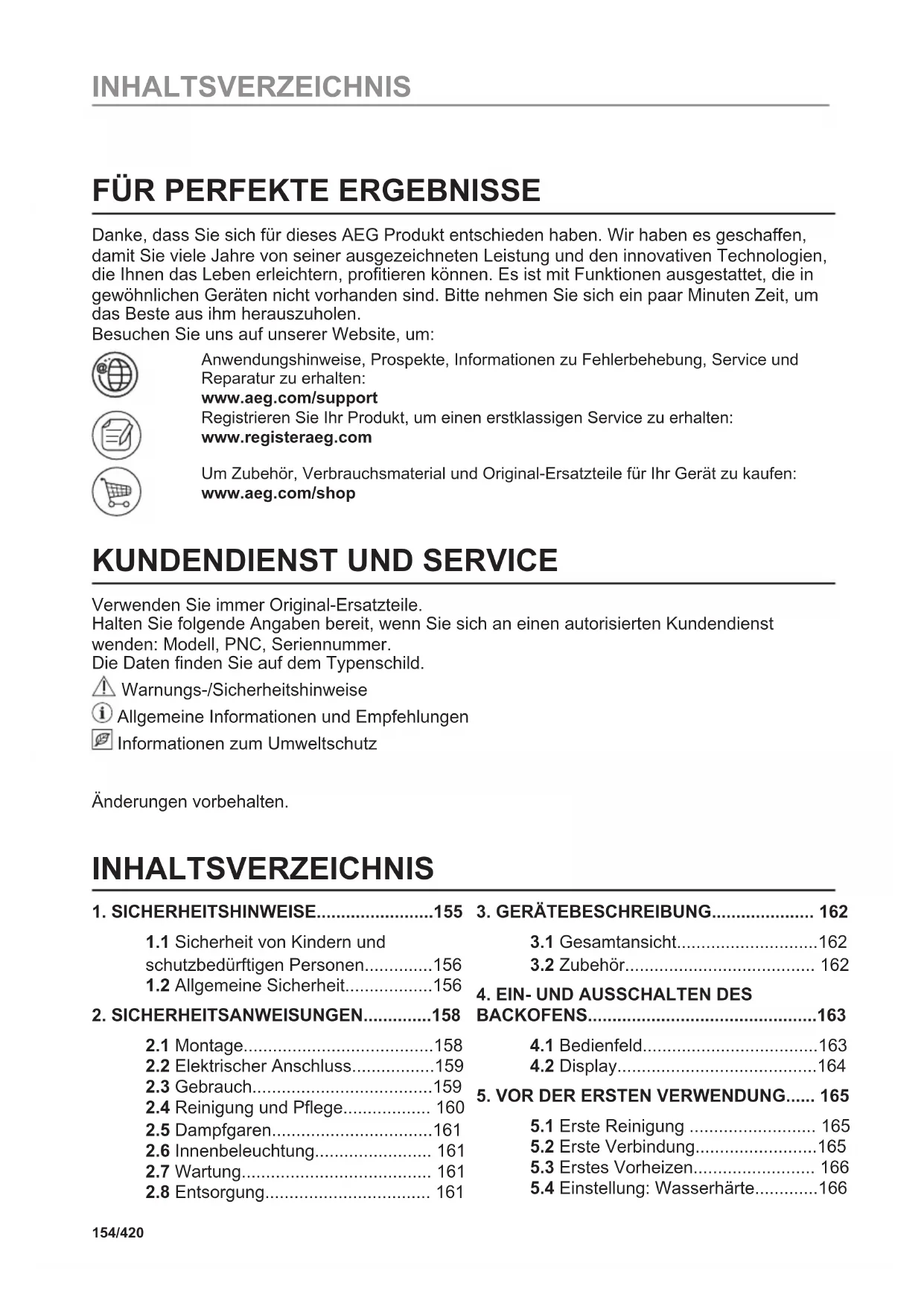 L'ENVIRONNEMENT Recyclez les matériaux portant le symbole . Déposez les emballages dans les conteneurs prévus à cet effet. Contribuez à la protection de l'environnement et à votre sécurité, recyclez vos produits électriques et électroniques. Ne jetez pas les appareils portant le symbole avec les ordures ménagères. Emmenez un tel produit dans votre centre local de recyclage ou contactez vos services municipaux. 153/420 PRENEZ UN RACCOURCI !FÜR PERFEKTE ERGEBNISSE Danke, dass Sie sich für dieses AEG Produkt entschieden haben. Wir haben es geschaffen, damit Sie viele Jahre von seiner ausgezeichneten Leistung und den innovativen Technologien, die Ihnen das Leben erleichtern, profitieren können. Es ist mit Funktionen ausgestattet, die in gewöhnlichen Geräten nicht vorhanden sind. Bitte nehmen Sie sich ein paar Minuten Zeit, um das Beste aus ihm herauszuholen. Besuchen Sie uns auf unserer Website, um: Anwendungshinweise, Prospekte, Informationen zu Fehlerbehebung, Service und Reparatur zu erhalten: www.aeg.com/support Registrieren Sie Ihr Produkt, um einen erstklassigen Service zu erhalten: www.registeraeg.com Um Zubehör, Verbrauchsmaterial und Original-Ersatzteile für Ihr Gerät zu kaufen: www.aeg.com/shop