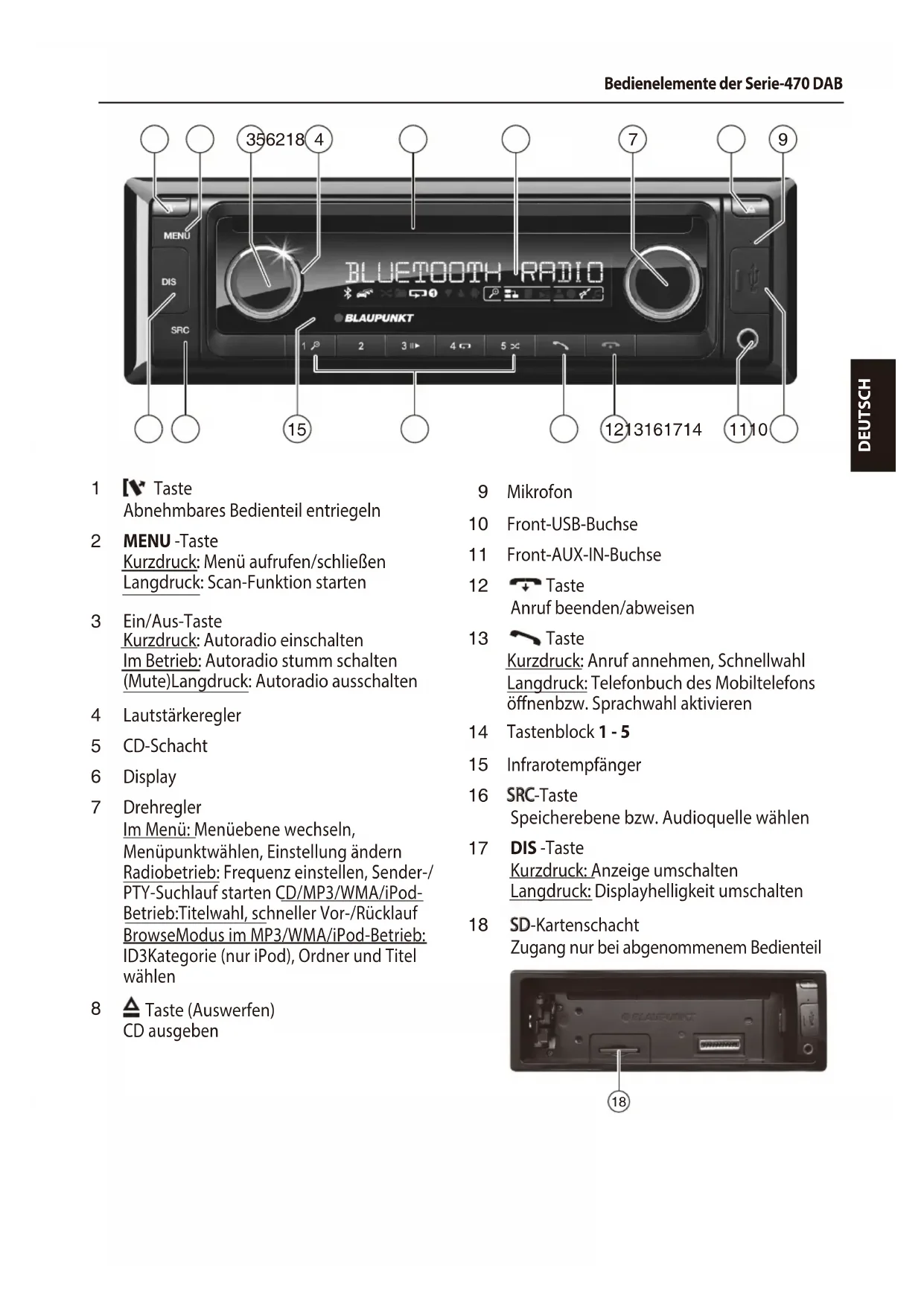 Verändern oder önen Sie das Gerät nicht. Im Gerät bendet sich ein Laser der Klasse 1, der Ihre Augen verletzen kann. Erhöhen Sie die Lautstärke nicht während Stummschaltungspausen, z. B. beim Wechsel der Audioquelle. Das Verändern der Lautstärke ist während der Stummschaltung nicht hörbar.DEUTSCHSicherheitshinweise | Reinigungshinweise | Entsorgungshinweise | Lieferumfang | Gerät in Betrieb nehmen Konformitätserklärung Reinigungshinweise Entsorgungshinweise Lieferumfang Im Lieferumfangsind enthalten:1 Autoradio 1 Bedienungs-/Einbauanleitung 1 Etui für das Bedienteil 1 Halterahmen1 Antennenanschlussadapter2 Demontagewerkzeuge 1 Distanzschraube1 Handfernbedienung (inkl. Batterie)1 Anschlusskabel Kammer A 1 Anschlusskabel Kammer B Sonderzubehör (nicht im Lieferumfang enthalten) Gerät in Betrieb nehmen VORSICHT! Transportsicherungsschrauben Bedienteil anbringen/abnehmen VORSICHT Beschädigung des Bedienteils Hiermit erklärt die Blaupunkt Competence Center Car Multimedia- Evo Sales GmbH, dass sich die Geräte in Übereinstimmung mit den grundlegenden Anforderungen und den anderen relevanten Vorschriften der Richtlinie 2014/53/EU benden.Sie nden die Konformitätserklärung im Internet unter www.blaupunkt.com.Benutzen Sie nur von Blaupunkt zugelassenes Sonderzubehör. Informieren Sie sich bei Ihrem Blaupunkt-Fachhändler oder im Internet unter www.blaupunkt.com.Stellen Sie sicher, dass vor der Inbetriebnahme des Autoradios die Transportsicherung-sschrauben entfernt werden (siehe Kapitel „Einbauanleitung“).Ihr Autoradio ist zum Schutz gegen Diebstahl mit einem abnehmbaren Bedienteil (Release-Panel) ausgestattet. Bei Auslieferung bendet sich das Bedienteil im mitgelieferten Etui. Um das Radio nach dem Einbau in Betrieb zu nehmen, müssen Sie zunächst das Bedienteil anbringen (siehe Abschnitt „Bedienteil anbringen“ in diesem Kapitel). Nehmen Sie das Bedienteil bei jedem Verlassen des Fahrzeugs mit. Ohne dieses Bedienteil ist das Autoradio für einen Dieb wertlos.Lassen Sie das Bedienteil nicht fallen.Transportieren Sie das Bedienteil so, dass es vor Stößen geschützt ist und die Kontakte nicht verschmutzen können.Setzen Sie das Bedienteil nicht direktem Sonnenlicht oder anderen Wärmequellen aus.Vermeiden Sie eine direkte Berührung der Kontakte des Bedienteils mit der Haut.Löse-, Reinigungs- und Scheuermittel sowie Cockpit-Spray und Kunststo-Pegemittel können Stoe enthalten, welche die Oberäche des Autoradios angreifen. Entsorgen Sie Ihr Altgerät nicht in den Hausmüll! Nutzen Sie zur Entsorgung des Altgerätes die zur Verfügung stehenden Rückgabe- und Sammelsysteme.