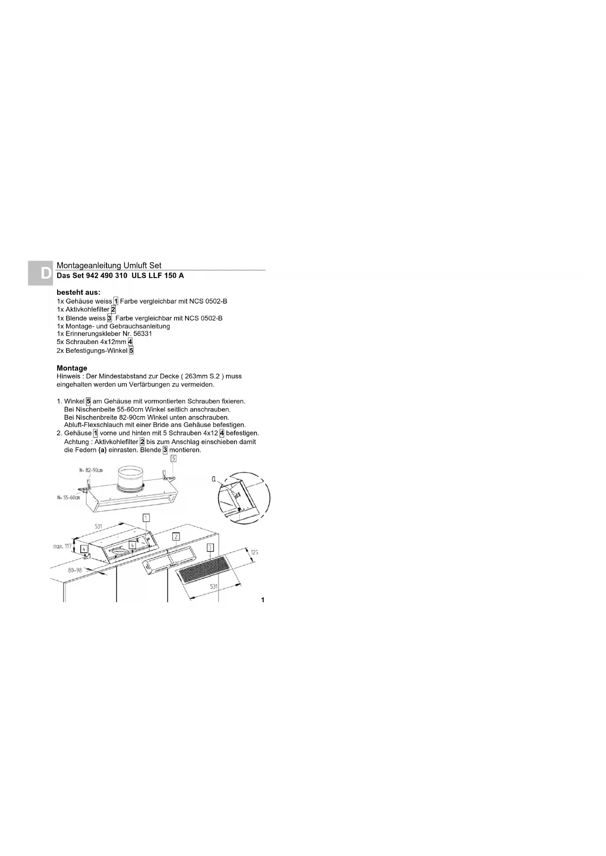 Hinweis : Der Mindestabstand zur Decke ( 263mm S.2 ) muss