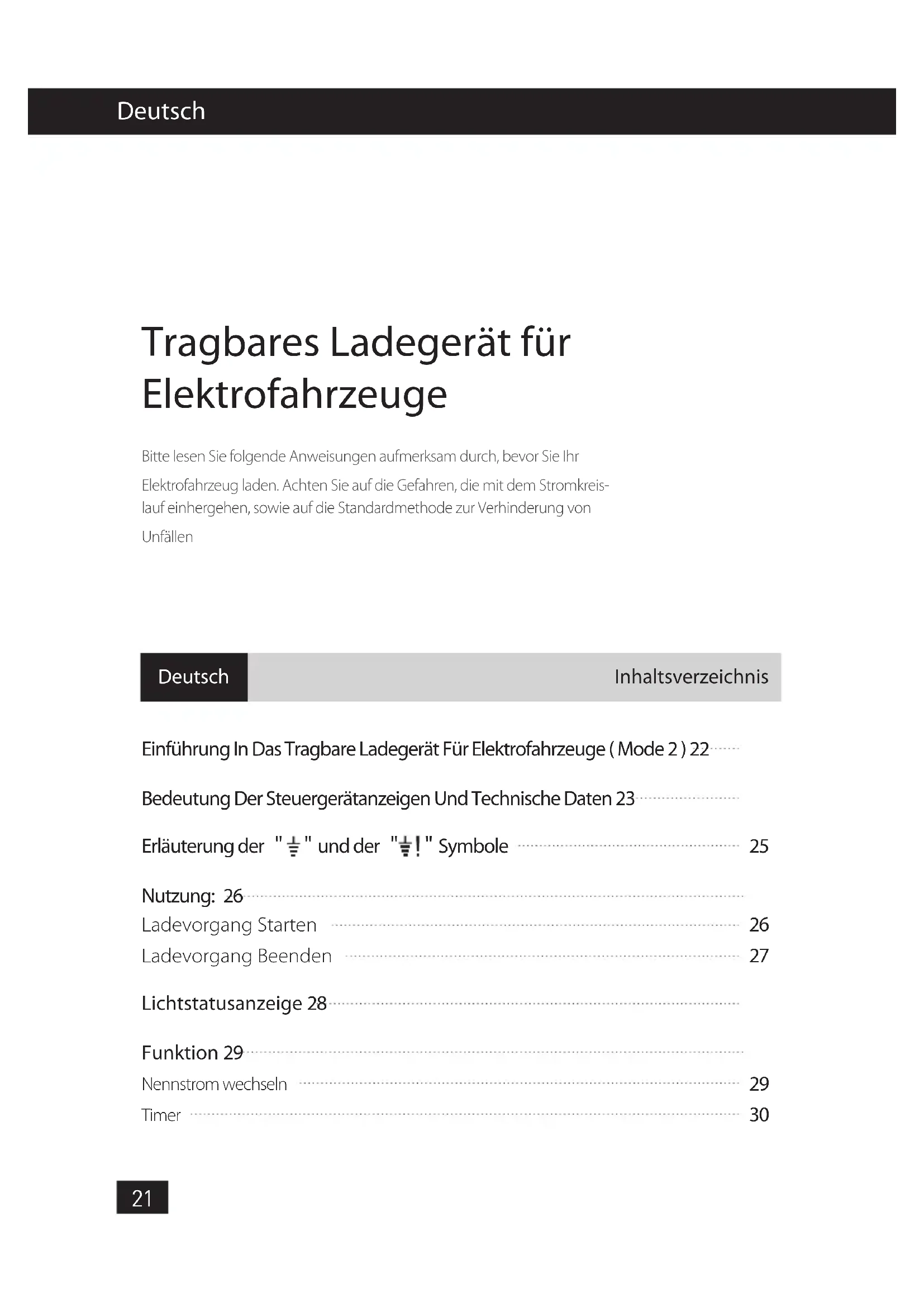 Nennstrom wechseln Timer Nutzung: 26 Funktion 29 Deutsch Deutsch Tragbares Ladegerät für Elektrofahrzeuge Bitte lesen Sie folgende Anweisungen aufmerksam durch, bevor Sie Ihr Elektrofahrzeug laden. Achten Sie auf die Gefahren, die mit dem Stromkreis-lauf einhergehen, sowie auf die Standardmethode zur Verhinderung von Unfällen InhaltsverzeichnisEinführung In Das Tragbare Ladegerät Für Elektrofahrzeuge ( Mode2 ) VORSICHT