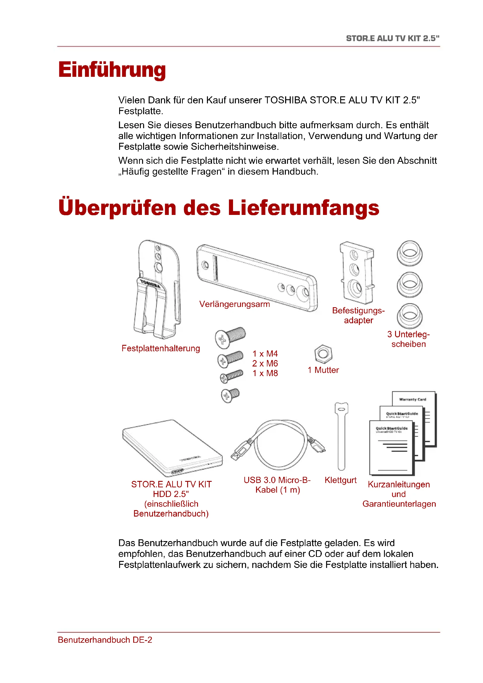 Einführung Vielen Dank für den Kauf unserer TOSHIBA STOR.E ALU TV KIT 2.5" Festplatte. Lesen Sie dieses Benutzerhandbuch bitte aufmerksam durch. Es enthält alle wichtigen Informationen zur Installation, Verwendung und Wartung der Festplatte sowie Sicherheitshinweise. Wenn sich die Festplatte nicht wie erwartet verhält, lesen Sie den Abschnitt „Häufig gestellte Fragen“ in diesem Handbuch. Überprüfen des Lieferumfangs Das Benutzerhandbuch wurde auf die Festplatte geladen. Es wird empfohlen, das Benutzerhandbuch auf einer CD oder auf dem lokalen Festplattenlaufwerk zu sichern, nachdem Sie die Festplatte installiert haben.