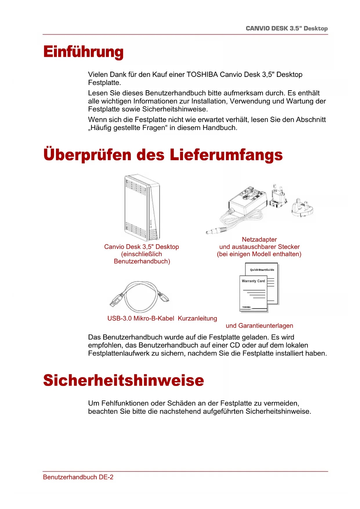 - Zulassungsbestimmungen Benutzerhandbuch DE-2 CANVIO DESK 3.5" Desktop Einführung Vielen Dank für den Kauf einer TOSHIBA Canvio Desk 3,5" Desktop Festplatte. Lesen Sie dieses Benutzerhandbuch bitte aufmerksam durch. Es enthält alle wichtigen Informationen zur Installation, Verwendung und Wartung der Festplatte sowie Sicherheitshinweise. Wenn sich die Festplatte nicht wie erwartet verhält, lesen Sie den Abschnitt „Häufig gestellte Fragen“ in diesem Handbuch. Überprüfen des Lieferumfangs Das Benutzerhandbuch wurde auf die Festplatte geladen. Es wird empfohlen, das Benutzerhandbuch auf einer CD oder auf dem lokalen Festplattenlaufwerk zu sichern, nachdem Sie die Festplatte installiert haben. Sicherheitshinweise Um Fehlfunktionen oder Schäden an der Festplatte zu vermeiden, beachten Sie bitte die nachstehend aufgeführten Sicherheitshinweise. Warranty Card Canvio Desk 3,5" Desktop (einschließlich Benutzerhandbuch) Netzadapter und austauschbarer Stecker (bei einigen Modell enthalten) USB-3.0 Mikro-B-Kabel Kurzanleitung und GarantieunterlagenBenutzerhandbuch DE-3 CANVIO DESK 3.5" Desktop ■ Erstellen Sie Backup-Kopien aller Daten auf der Festplatte. Toshiba ist nicht verantwortlich für Beschädigung oder Verlust von Daten. Toshiba kommt nicht für die Kosten der Wiederherstellung von Daten auf. ■ Vermeiden Sie Folgendes: ■ Gehäuse oder Laufwerk öffnen ■ Laufwerk oder Teile davon auseinander bauen ■ Flüssigkeiten neben oder auf dem Laufwerk abstellen; dies könnte das Laufwerk beschädigen, Verletzungen oder einen elektrischen Schock verursachen ■ Laufwerk stoßen, fallen lassen oder erschüttern ■ Laufwerk bewegen, während es in Betrieb ist; hierbei könnten Daten beschädigt werden ■ andere Anschlüsse als USB Bus Powered verwenden ■ andere Netzadapter als den mit der Festplatte mitgelieferten verwenden, da die Festplatte andernfalls beschädigt werden kann ■ Kabel während des Betriebs trennen. Heben Sie zunächst die Bereitstellung der Festplatte auf (unmounten) ■ Festplatte Temperaturen außerhalb des Bereichs 5° – 35°C (Betrieb) bzw. –20° – 60°C (Lagerung) aussetzen ■ Laufwerk nassen oder feuchten Umgebungen aussetzen ■ Festplatte während des Betriebs abdecken, da dies zu einer Überhitzung führen kann ■ Festplatte in der Nähe hitzeabstrahlender Geräte platzieren ■ Und ■ achten Sie darauf, die Anschlüsse richtig zu verbinden ■ drücken Sie Stecker nie mit großer Kraft in die Anschlüsse ■ überprüfen Sie vor dem Anschließen die Polarität ■ Trennen Sie die Festplatte sofort von der Stromversorgung und dem Host-PC, wenn ■ Rauch oder ein ungewöhnlicher Geruch kommt es aus dem Laufwerk ■ Wasser ist in das Laufwerkgehäuse eingedrungen oder das Laufwerk ist nass geworden ■ ein Gegenstand ist in das Laufwerkgehäuse gelangt ■ das Kabel wurde beschädigt (ersetzen Sie das Kabel durch ein neues) Wenn sich die Festplatte nicht wie erwartet verhält oder Sie Zweifel bezüglich der elektrischen Sicherheit haben, wenden Sie sich bitte sofort an die TOSHIBA-Hotline oder an einen autorisierten Händler! WARNUNGBenutzerhandbuch DE-4 CANVIO DESK 3.5" Desktop Systemanforderungen ■ Windows Vista p. 9