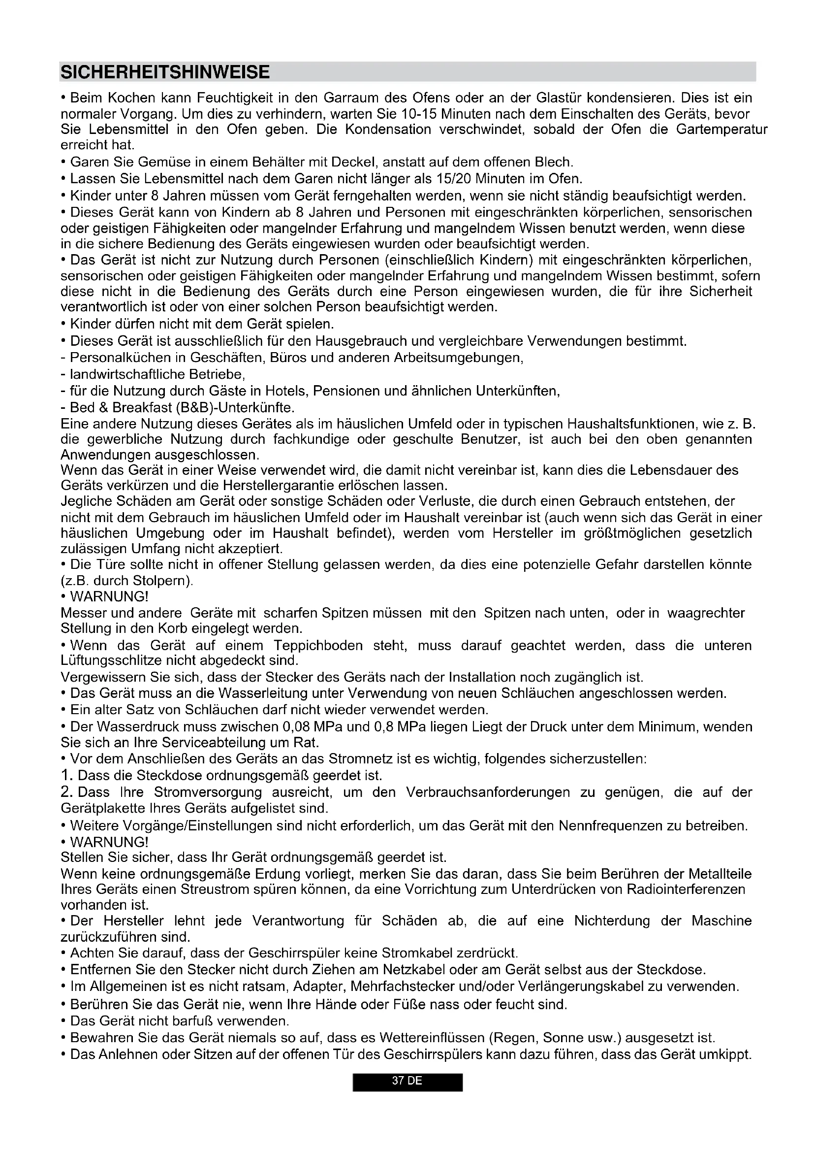 - Das Anlehnen oder Sitzen auf der offenen Tür des Geschirrspülers kann dazu führen, dass das Gerät umkippt.SICHERHEITSHINWEISE 38 DE