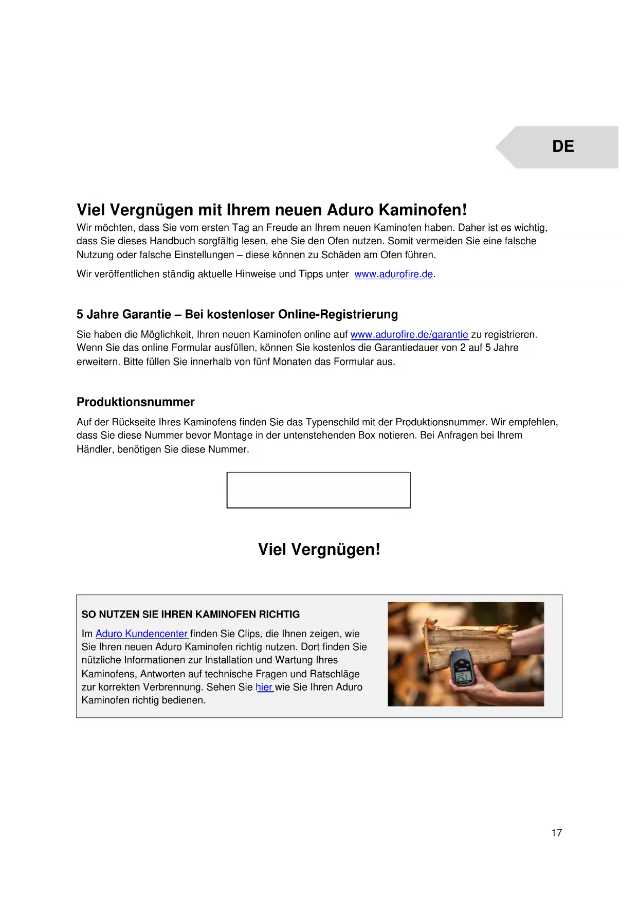 Viel Vergnügen mit Ihrem neuen Aduro Kaminofen! Wir möchten, dass Sie vom ersten Tag an Freude an Ihrem neuen Kaminofen haben. Daher ist es wichtig, dass Sie dieses Handbuch sorgfältig lesen, ehe Sie den Ofen nutzen. Somit vermeiden Sie eine falsche Nutzung oder falsche Einstellungen – diese können zu Schäden am Ofen führen. Wir veröffentlichen ständig aktuelle Hinweise und Tipps unter www.adurofire.de. 5 Jahre Garantie – Bei kostenloser Online-Registrierung Sie haben die Möglichkeit, Ihren neuen Kaminofen online auf www.adurofire.de/garantie zu registrieren. Wenn Sie das online Formular ausfüllen, können Sie kostenlos die Garantiedauer von 2 auf 5 Jahre erweitern. Bitte füllen Sie innerhalb von fünf Monaten das Formular aus. Produktionsnummer Auf der Rückseite Ihres Kaminofens finden Sie das Typenschild mit der Produktionsnummer. Wir empfehlen, dass Sie diese Nummer bevor Montage in der untenstehenden Box notieren. Bei Anfragen bei Ihrem Händler, benötigen Sie diese Nummer.