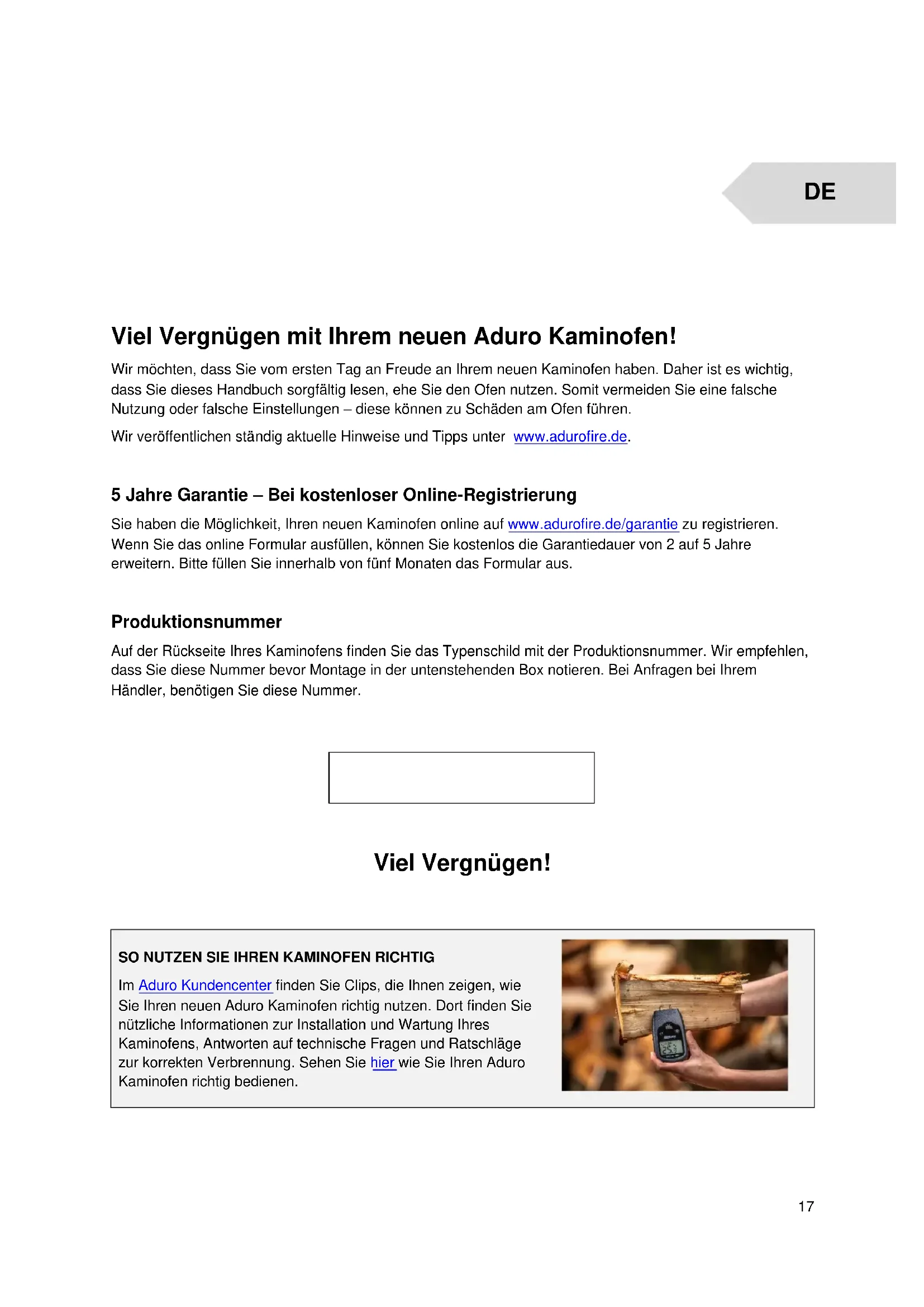 Viel Vergnügen mit Ihrem neuen Aduro Kaminofen! Wir möchten, dass Sie vom ersten Tag an Freude an Ihrem neuen Kaminofen haben. Daher ist es wichtig, dass Sie dieses Handbuch sorgfältig lesen, ehe Sie den Ofen nutzen. Somit vermeiden Sie eine falsche Nutzung oder falsche Einstellungen – diese können zu Schäden am Ofen führen. Wir veröffentlichen ständig aktuelle Hinweise und Tipps unter www.adurofire.de. 5 Jahre Garantie – Bei kostenloser Online-Registrierung Sie haben die Möglichkeit, Ihren neuen Kaminofen online auf www.adurofire.de/garantie zu registrieren. Wenn Sie das online Formular ausfüllen, können Sie kostenlos die Garantiedauer von 2 auf 5 Jahre erweitern. Bitte füllen Sie innerhalb von fünf Monaten das Formular aus. Produktionsnummer Auf der Rückseite Ihres Kaminofens finden Sie das Typenschild mit der Produktionsnummer. Wir empfehlen, dass Sie diese Nummer bevor Montage in der untenstehenden Box notieren. Bei Anfragen bei Ihrem Händler, benötigen Sie diese Nummer.
