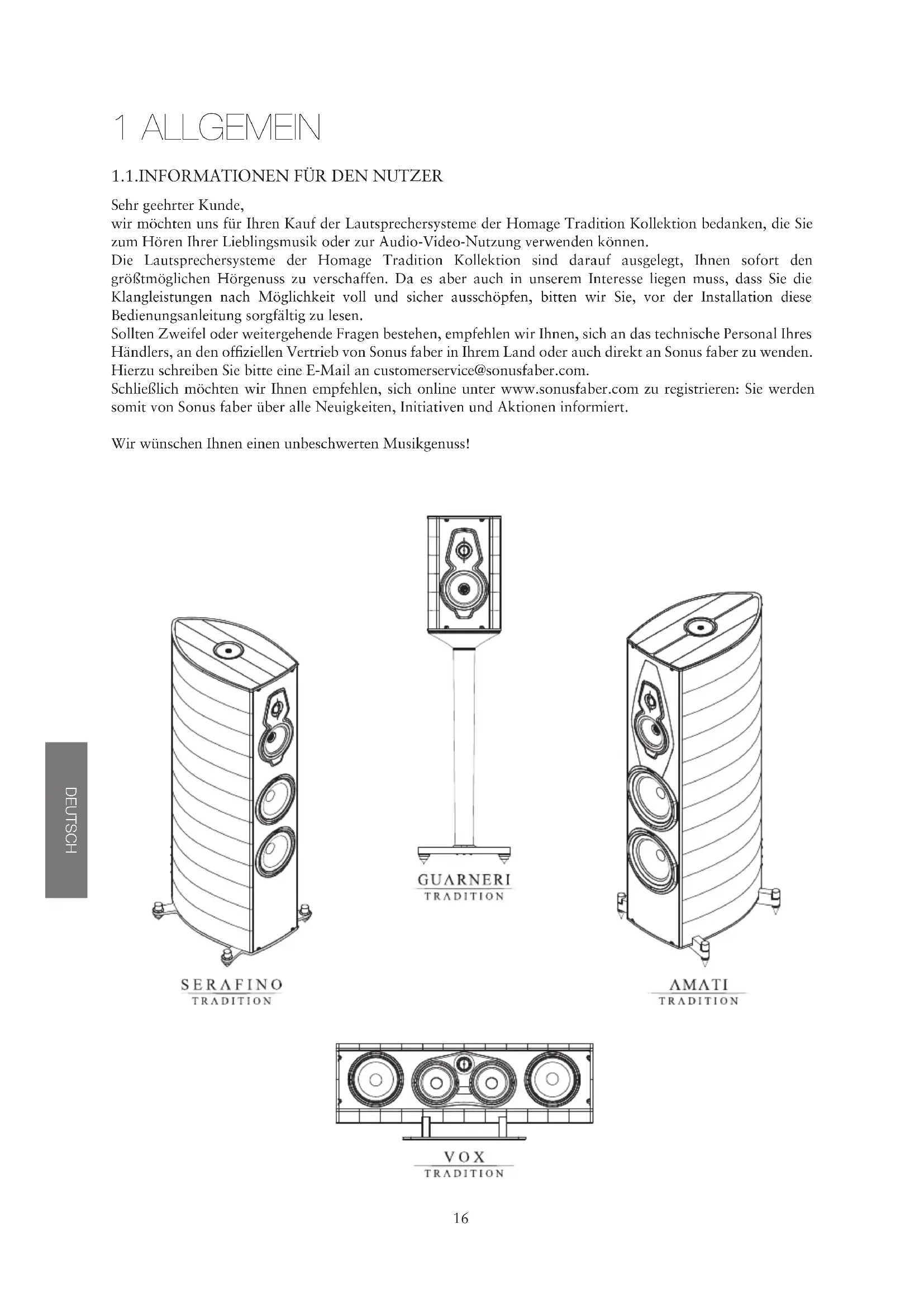 5 DISPOSAL Risk of damage to the device casing! Do not use cleaning products, furniture wax, liquid detergents or alcohol. Do not ! use rough cloths. This device contains materials that can pollute if dispersed in the environment. Take the device to be disposed of to waste sorting centre. ENGLISH16 1 ALLGEMEIN Sehr geehrter Kunde, wir möchten uns für Ihren Kauf der Lautsprechersysteme der Homage Tradition Kollektion bedanken, die Sie zum Hören Ihrer Lieblingsmusik oder zur Audio-Video-Nutzung verwenden können. Die Lautsprechersysteme der Homage Tradition Kollektion sind darauf ausgelegt, Ihnen sofort den größtmöglichen Hörgenuss zu verschaffen. Da es aber auch in unserem Interesse liegen muss, dass Sie die Klangleistungen nach Möglichkeit voll und sicher ausschöpfen, bitten wir Sie, vor der Installation diese Bedienungsanleitung sorgfältig zu lesen. Sollten Zweifel oder weitergehende Fragen bestehen, empfehlen wir Ihnen, sich an das technische Personal Ihres Händlers, an den offiziellen Vertrieb von Sonus faber in Ihrem Land oder auch direkt an Sonus faber zu wenden. Hierzu schreiben Sie bitte eine E-Mail an customerservice@sonusfaber.com. Schließlich möchten wir Ihnen empfehlen, sich online unter www.sonusfaber.com zu registrieren: Sie werden somit von Sonus faber über alle Neuigkeiten, Initiativen und Aktionen informiert. Wir wünschen Ihnen einen unbeschwerten Musikgenuss!