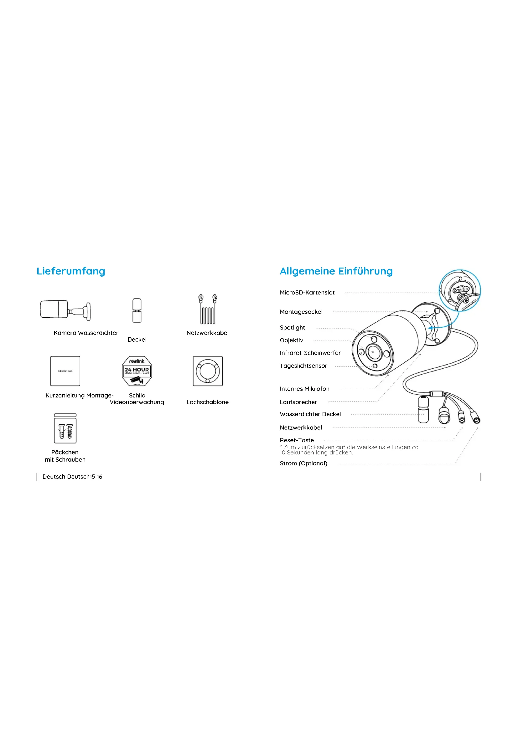 - Stellen Sie die Kamera auf die Werkseinstellungen zurück und überprüfen Sie die Einstellungen für das Scheinwerferlicht erneut. Wenn dies nicht funktioniert, wenden Sie sich bitte an den Reolink-Support: https://support.reolink.com/. Hardware Features Spotlight kann nicht eingeschaltet werden Konformitätserklärung Dieses Gerät entspricht Abschnitt 15 der FCC-Bestimmungen. Der Betrieb unterliegt den folgenden beiden Bedingungen: (1) Dieses Gerät darf keine schädlichen Interferenzen verursachen und (2) dieses Gerät muss alle empfangenen Interferenzen akzeptieren, einschließlich Interferenzen, die zu einem unerwünschten Betrieb führen können. Weitere Informationen finden Sie unter: https://reolink.com/fcc-compliance-notice/. FCC-Konformitätserklärung HINWEIS: Dieses Gerät wurde getestet und entspricht den Grenzwerten für ein digitales Gerät der Klasse B, entsprechend Teil 15 der FCC- Bestimmungen. Diese Grenzwerte sollen einen angemessenen Schutz gegen schädliche Störungen bei einer häuslichen Installation bieten. Stromversorgung: Durch PoE (802.3af) / DC 12V Tag/Nacht Modus: Auto-Umschaltung Betriebstemperatur: -10°C to 55°C (14°F to 131°F) Betriebsfeuchtigkeit: 10%-90% Witterungsbeständigkeit: IP66 Weitere Spezifikationen finden Sie unter https://reolink.com/. AllgemeinDeutsch Deutsch25 26 Diese Kennzeichnung weist darauf hin, dass dieses Produkt in der gesamten EU nicht über den Hausmüll entsorgt werden darf. Um mögliche Umwelt-oder menschlicheGesundheitsschäden durch unkontrollierte Entsorgung von Abfällen zu vermeiden, bitte recyceln Sie die Produkte verantwortungsbewusst, um die nachhaltige Wiederverwendung von Rohstoen zu fördern. Für die Rückgabe Ihres Altgerätes nutzen Sie bitte die Rückgabe und Sammelsysteme oder kontaktieren Sie den Händler, bei welchem Sie das Produkt gekauft haben. Ihr Händler kann das Produkt dem umweltverträglichen Recycling zuführen. Korrekte Entsorgung dieses Produkts Reolink erklärt, dass dieses Gerät den grundlegenden Anforderungen und anderen relevanten Bestimmungen der Richtlinie 2014/30/EU entspricht. Vereinfachte EU-Konformitätserklärung 2-Jahre eingeschränkte Garantie ist für dieses Produkt verfügbar. Mehr Infos: https://reolink.com/warranty-and-return/. Garantiebestimmun HINWEIS: Wir hoen, dass Ihnen der Neukauf gefällt. Wenn Sie mit dem Produkt nicht zufrieden sind und es zurückgeben möchten, dann empfehlen wir Ihnen, die Kamera vor der Zurückgabe auf die Durch die Verwendung der in das Reolink-Produkt integrierten Produktsoftware stimmen Sie den Bestimmungen dieses Endbenutzer-Lizenzvertrags („EULA“) zwischen Ihnen und Reolink zu. Weitere Informationen: https://reolink.com/eula/. Endbenutzer-Lizenzvertrag Die Nutzung des Produkts unterliegt Ihrer Zustimmung zu AGB und Datenschutzrichtlinien auf: https://reolink.com/de/. AGB & Datenschutz werkseitigen Standardeinstellungen zurückzusetzen und die eingelegte SD-Karte herauszunehmen.schädliche Störungen bei einer häuslichen Installation bieten.Français Français27 28 Contenu de la boîte 28 Introduction de caméra 29 Diagramme de connexion 30 Configurer la caméra 31 Monter la Caméra 32 Dépannage 35 Spécifications 36 Avis de conformité 37 Contenu de la boîte Vis (dans l’emballage) Caméra Couvercle étanche Câble Ethernet Signe de surveillance Guide de démarrage rapide Gabarit de perçage des trous de xation Contenu FRFrançais Français29 30 VGAHDMIUSB AUDIO OUT DC 48V