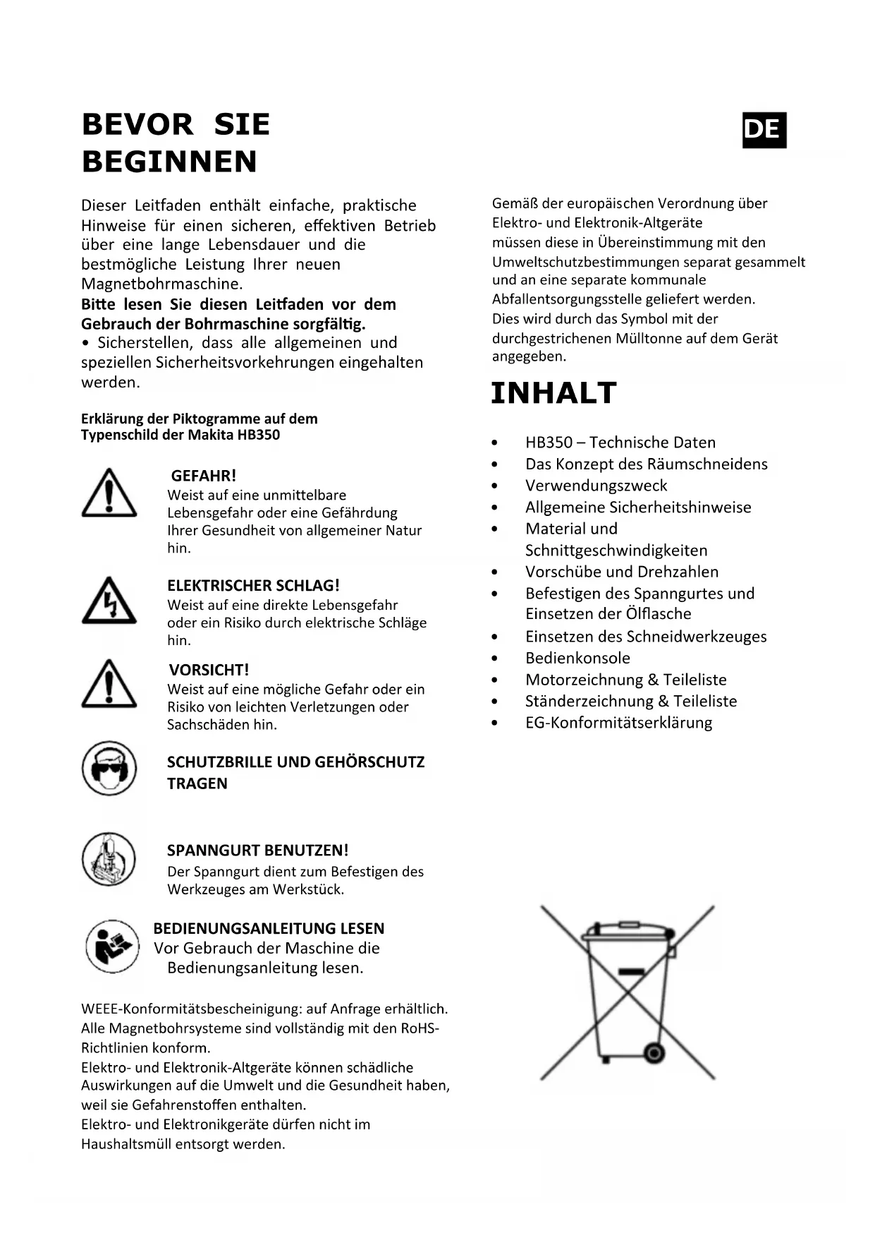 Director - Makita Europe N.V.BEVOR SIE BEGINNEN Dieser Leitfaden enthält einfache, praktische Hinweise für einen sicheren, effektiven Betrieb über eine lange Lebensdauer und die bestmögliche Leistung Ihrer neuen Magnetbohrmaschine. Bie lesen Sie diesen Leiaden vor dem Gebrauch der Bohrmaschine sorgfälg. • Sicherstellen, dass alle allgemeinen und speziellen Sicherheitsvorkehrungen eingehalten werden. Erklärung der Piktogramme auf dem Typenschild der Makita HB350 GEFAHR! Weist auf eine unmittelbare Lebensgefahr oder eine Gefährdung Ihrer Gesundheit von allgemeiner Natur hin. ELEKTRISCHER SCHLAG! Weist auf eine direkte Lebensgefahr oder ein Risiko durch elektrische Schläge hin. VORSICHT! Weist auf eine mögliche Gefahr oder ein Risiko von leichten Verletzungen oder Sachschäden hin.