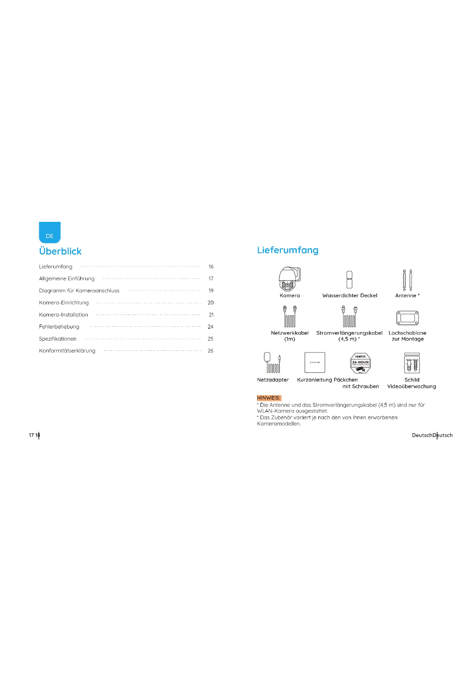 Lieferumfang Allgemeine Einführung Diagramm für Kameraanschluss Kamera-Einrichtung Kamera-Installation Fehlerbehebung Spezifikationen Konformitätserklärung