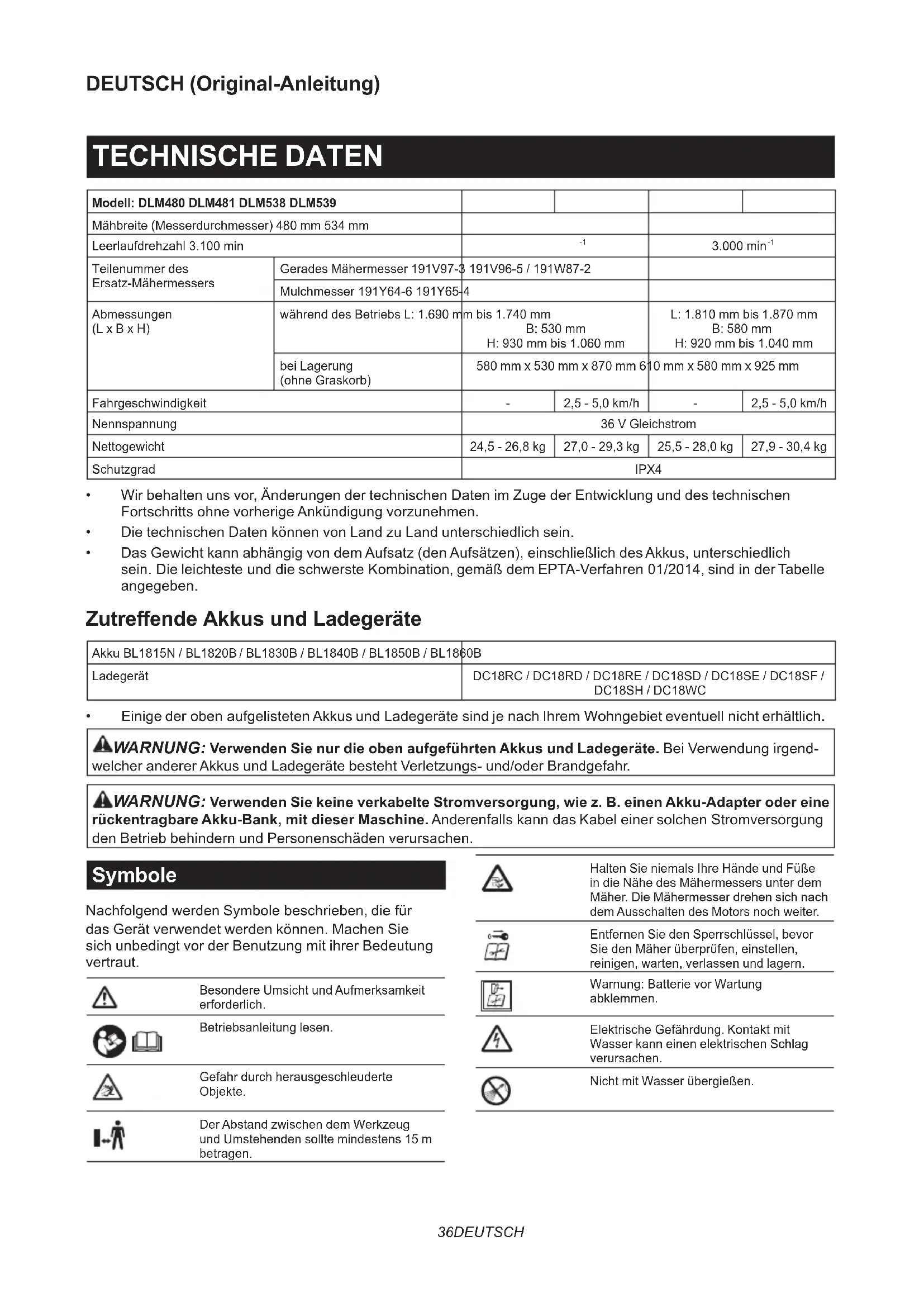 - Einige der oben aufgelisteten Akkus und Ladegeräte sind je nach Ihrem Wohngebiet eventuell nicht erhältlich. WARNUNG: Verwenden Sie nur die oben aufgeführten Akkus und Ladegeräte. Bei Verwendung irgend- welcher anderer Akkus und Ladegeräte besteht Verletzungs- und/oder Brandgefahr. WARNUNG: Verwenden Sie keine verkabelte Stromversorgung, wie z. B. einen Akku-Adapter oder eine rückentragbare Akku-Bank, mit dieser Maschine. Anderenfalls kann das Kabel einer solchen Stromversorgung den Betrieb behindern und Personenschäden verursachen. Symbole Nachfolgend werden Symbole beschrieben, die für das Gerät verwendet werden können. Machen Sie sich unbedingt vor der Benutzung mit ihrer Bedeutung vertraut. Besondere Umsicht und Aufmerksamkeit erforderlich. Betriebsanleitung lesen. Gefahr durch herausgeschleuderte Objekte. Der Abstand zwischen dem Werkzeug und Umstehenden sollte mindestens 15 m betragen. Halten Sie niemals Ihre Hände und Füße in die Nähe des Mähermessers unter dem Mäher. Die Mähermesser drehen sich nach dem Ausschalten des Motors noch weiter. Entfernen Sie den Sperrschlüssel, bevor Sie den Mäher überprüfen, einstellen, reinigen, warten, verlassen und lagern. Warnung: Batterie vor Wartung abklemmen. Elektrische Gefährdung. Kontakt mit Wasser kann einen elektrischen Schlag verursachen. Nicht mit Wasser übergießen.37 DEUTSCH Ni-MH Li-ion Nur für EU-Länder Aufgrund des Vorhandenseins gefähr- licher Komponenten in der Ausrüstung können Elektro- und Elektronik-Altgeräte, Akkumulatoren und Batterien sich nega- tiv auf die Umwelt und die menschliche Gesundheit auswirken. Entsorgen Sie Elektro- und Elektronikgeräte oder Batterien nicht mit dem Hausmüll! In Übereinstimmung mit der Europäischen Richtlinie über Elektro- und Elektronik- Altgeräte, Akkumulatoren und Batterien, verbrauchte Akkumulatoren und Batterien sowie ihrer Anpassung an nati- onales Recht sollten Elektro-Altgeräte, Batterien und Akkumulatoren gemäß den Umweltschutzbestimmungen getrennt gelagert und zu einer getrennten Sammelstelle für Siedlungsabfälle geliefert werden. Dies wird durch das am Gerät angebrachte Symbol der durchgestrichenen Abfalltonne auf Rädern angezeigt. Garantierter Schallleistungspegel gemäß der EU-Richtlinie über Außenlärm. Schallleistungspegel gemäß der australi- schen NSW-Lärmschutzverordnung Vorgesehene Verwendung Die Maschine ist für Rasenmähen vorgesehen. Geräusch Typischer A-bewerteter Geräuschpegel ermittelt gemäß EN60335-2-77: Modell DLM480 Schalldruckpegel (L